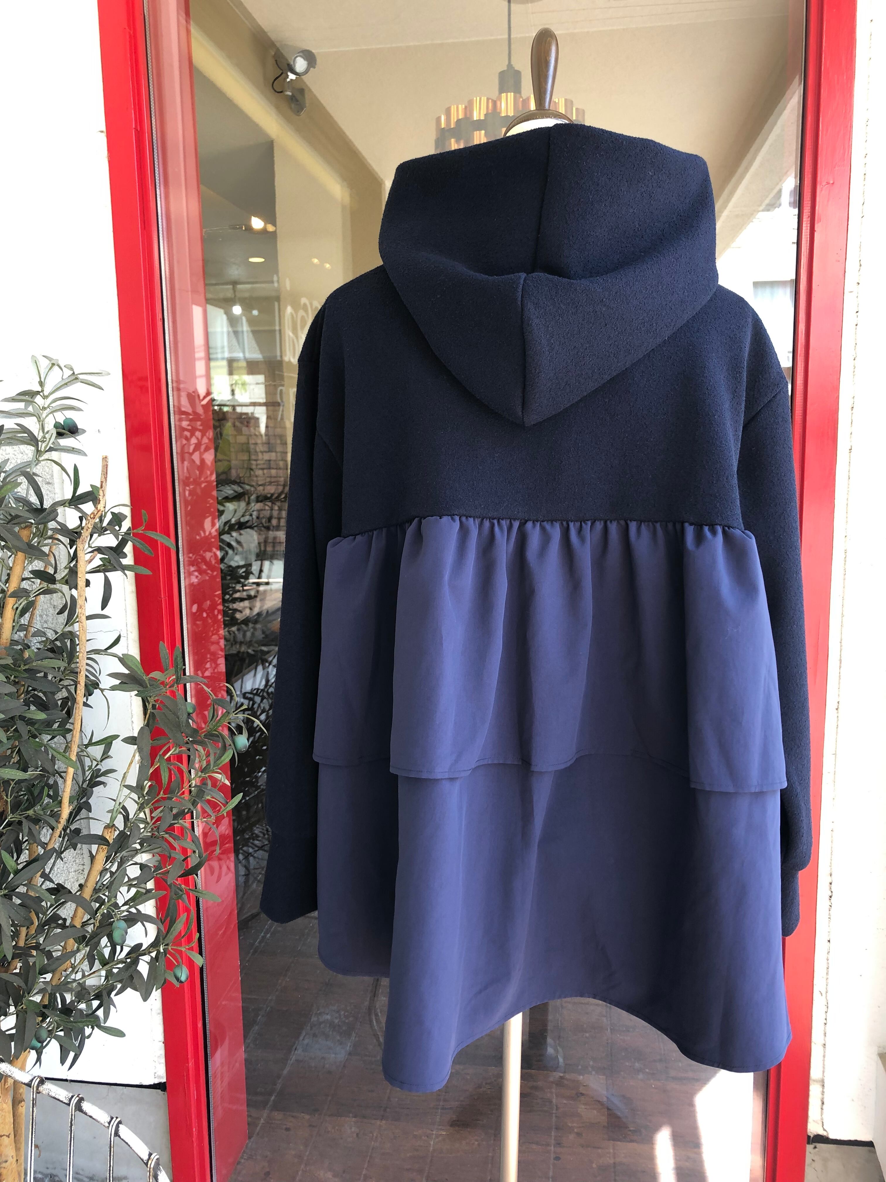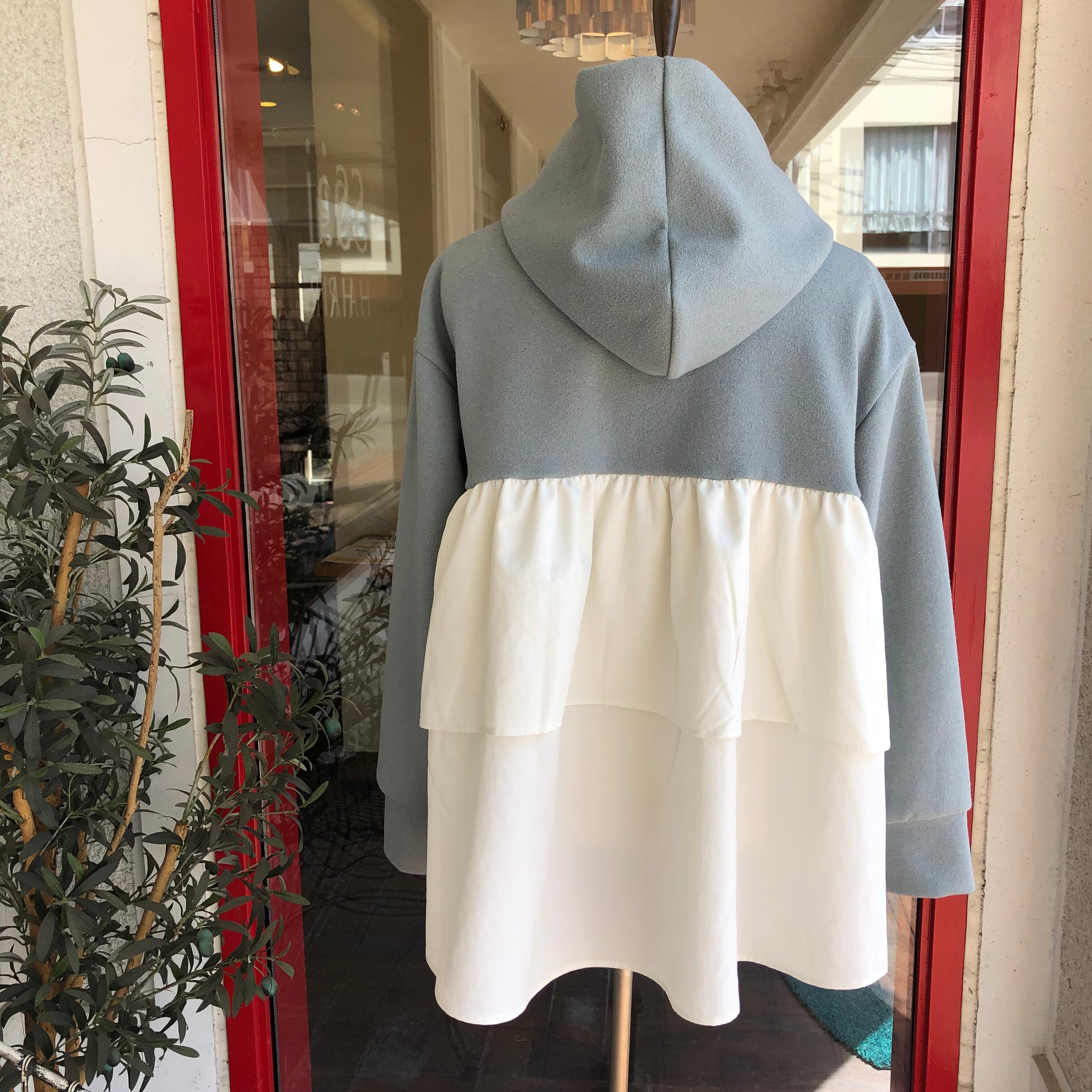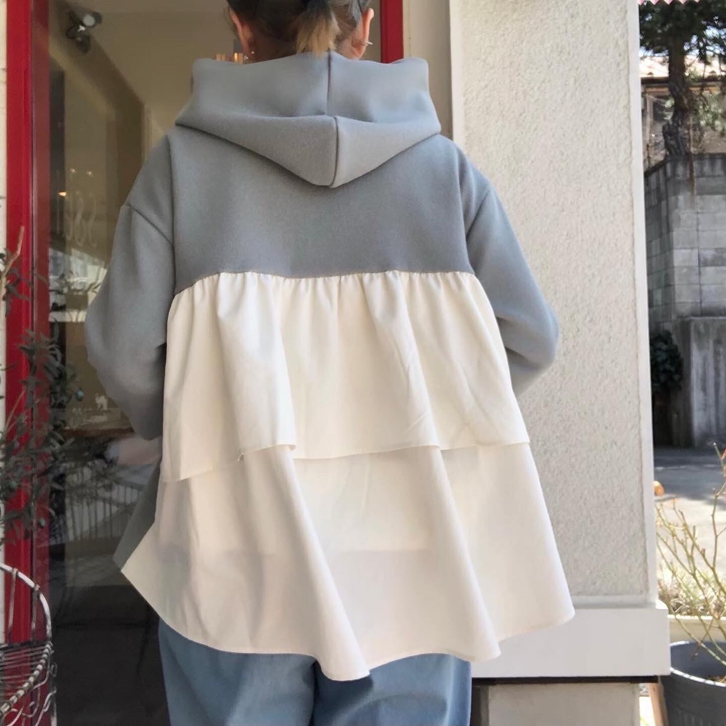 後ろ身頃に布帛のフリルがドッキングされたデザインは、ちょっとした羽織に使えながら