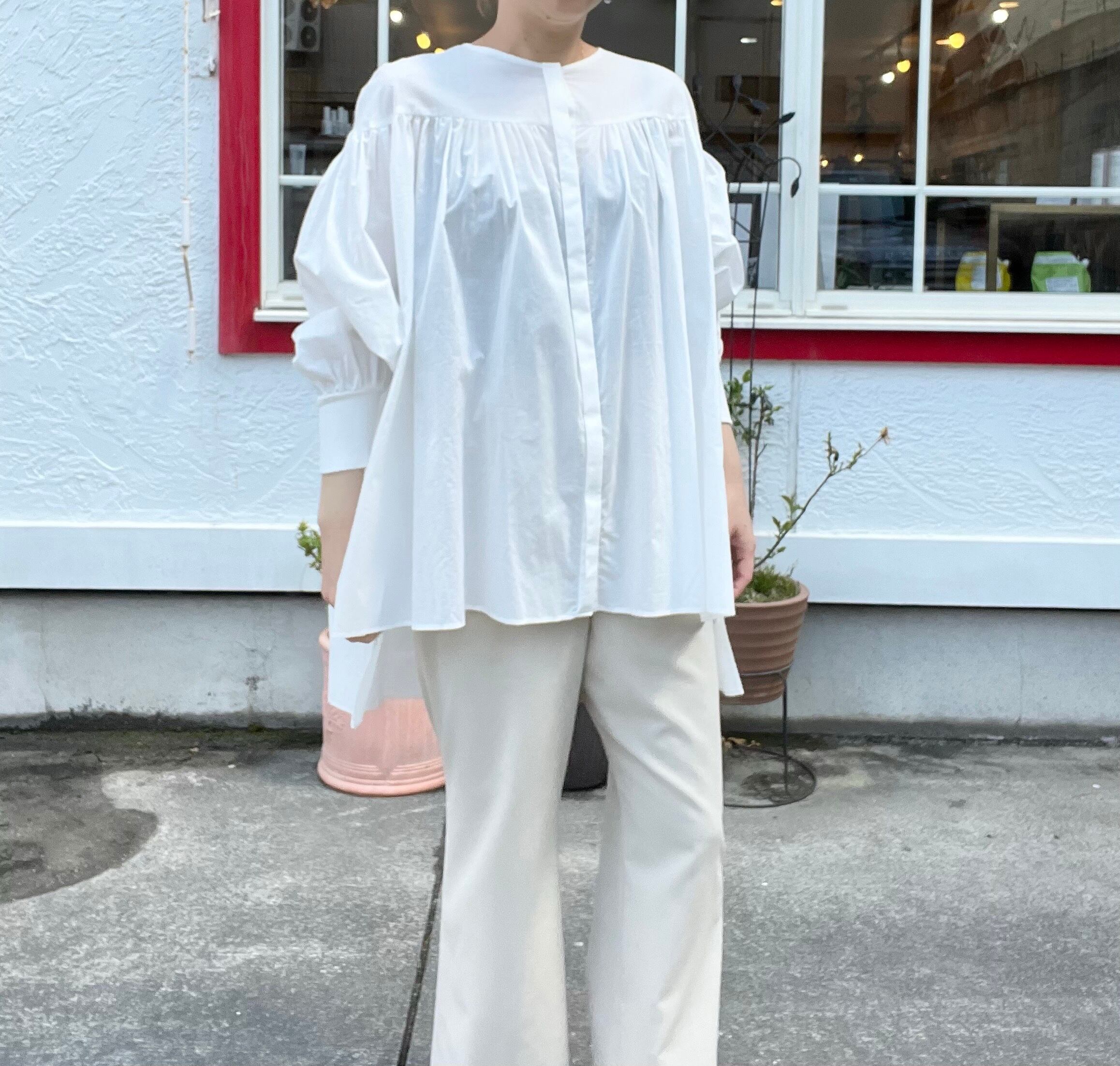 前後差ある着丈はフレアパンツやワイドパンツとコーディネートして頂けます