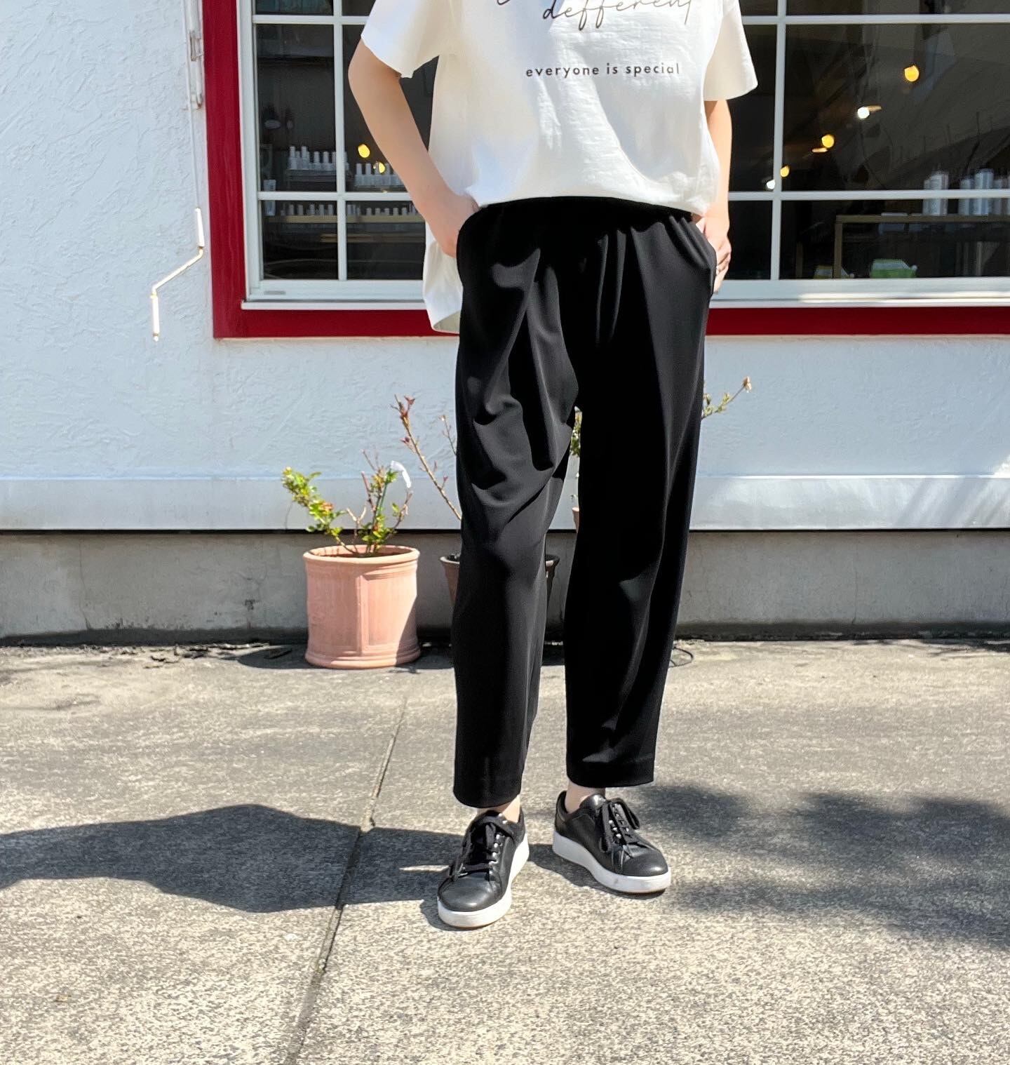 テーパード型で、パンプスだけではなくスニーカーでのコーディネートも楽しめます