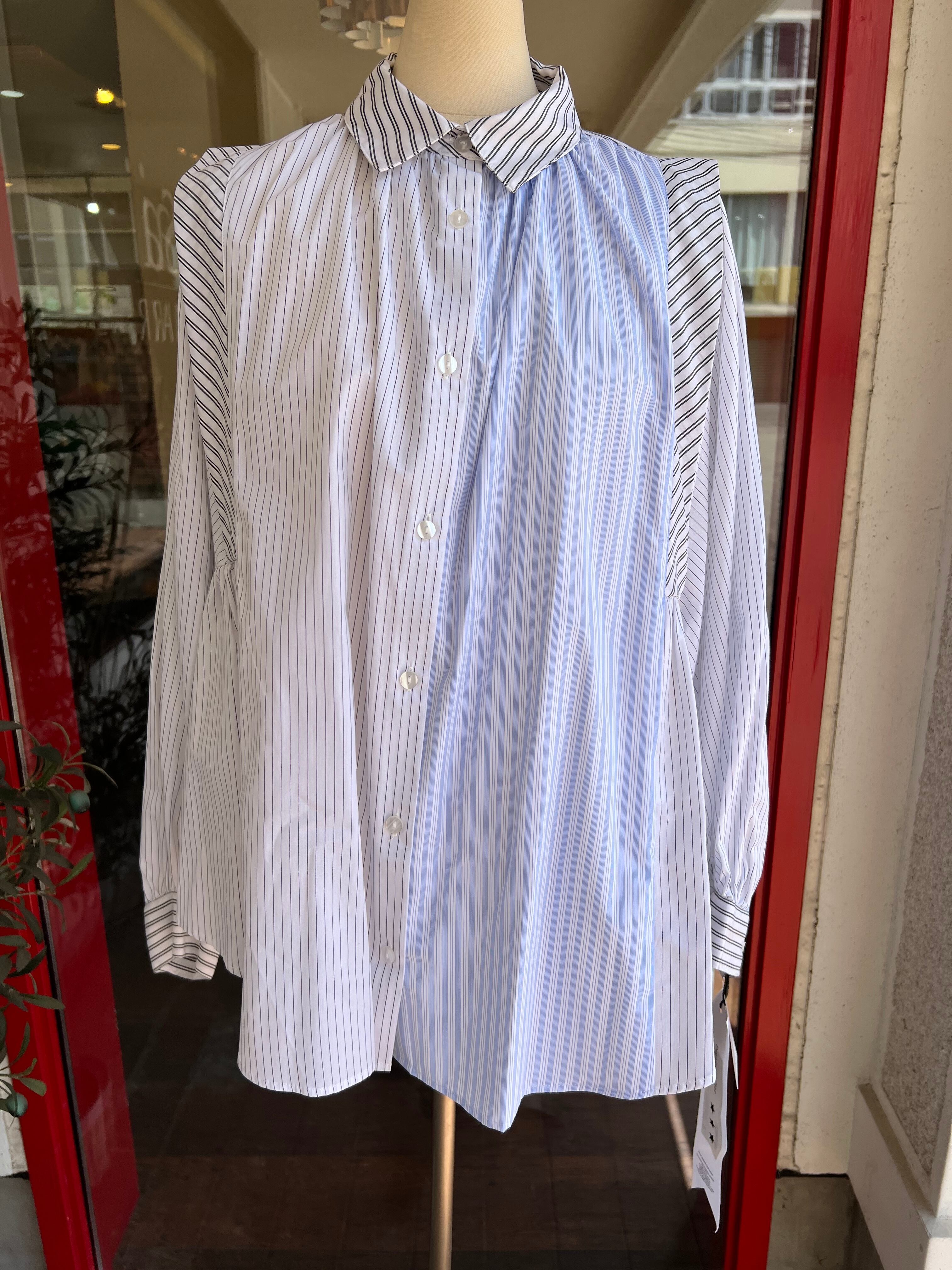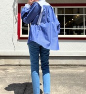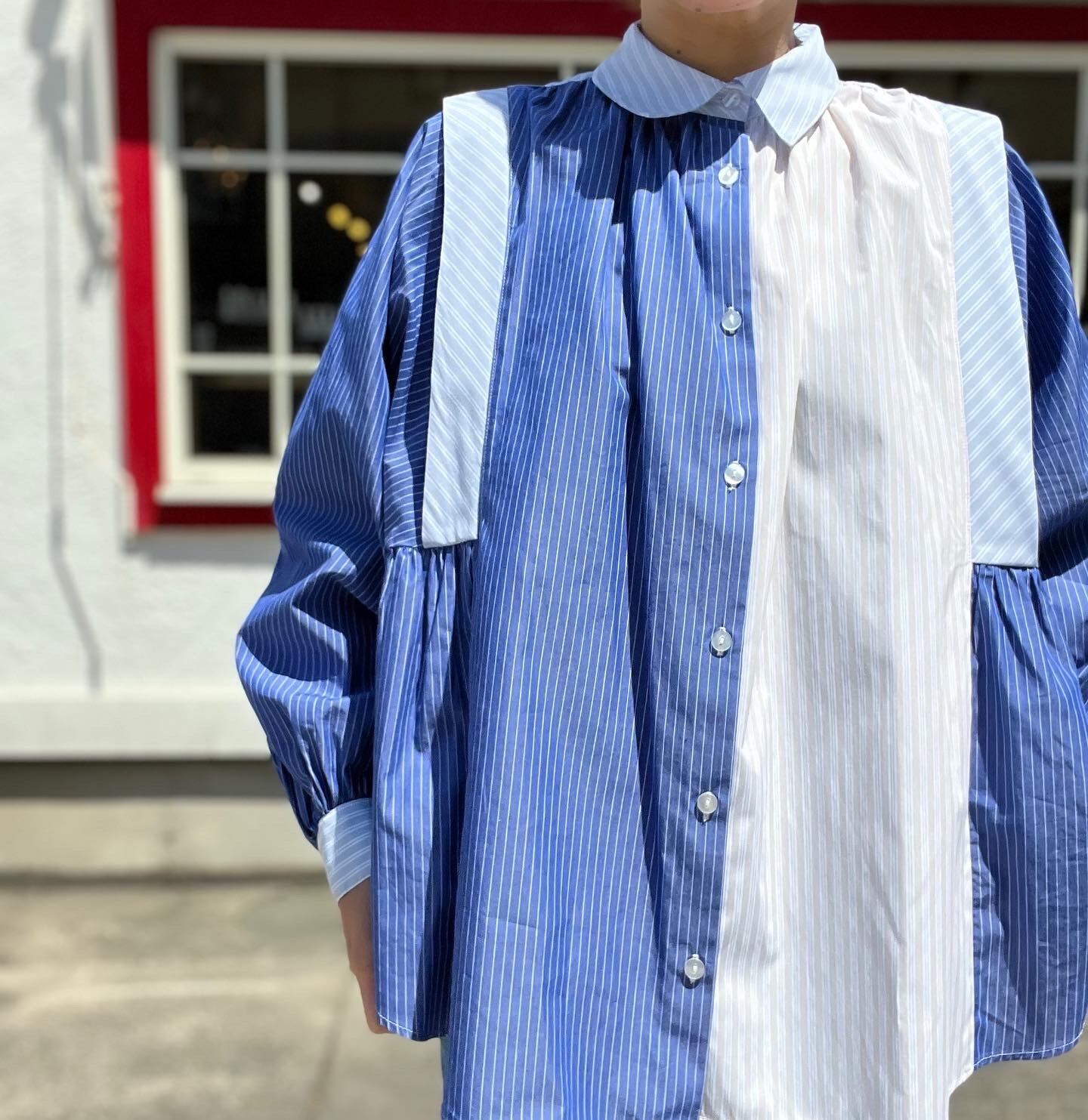 袖口とサイドにギャザーが入りふんわりと柔らかなシルエットに、ミニ襟が可愛らしい前開きのデザイン
