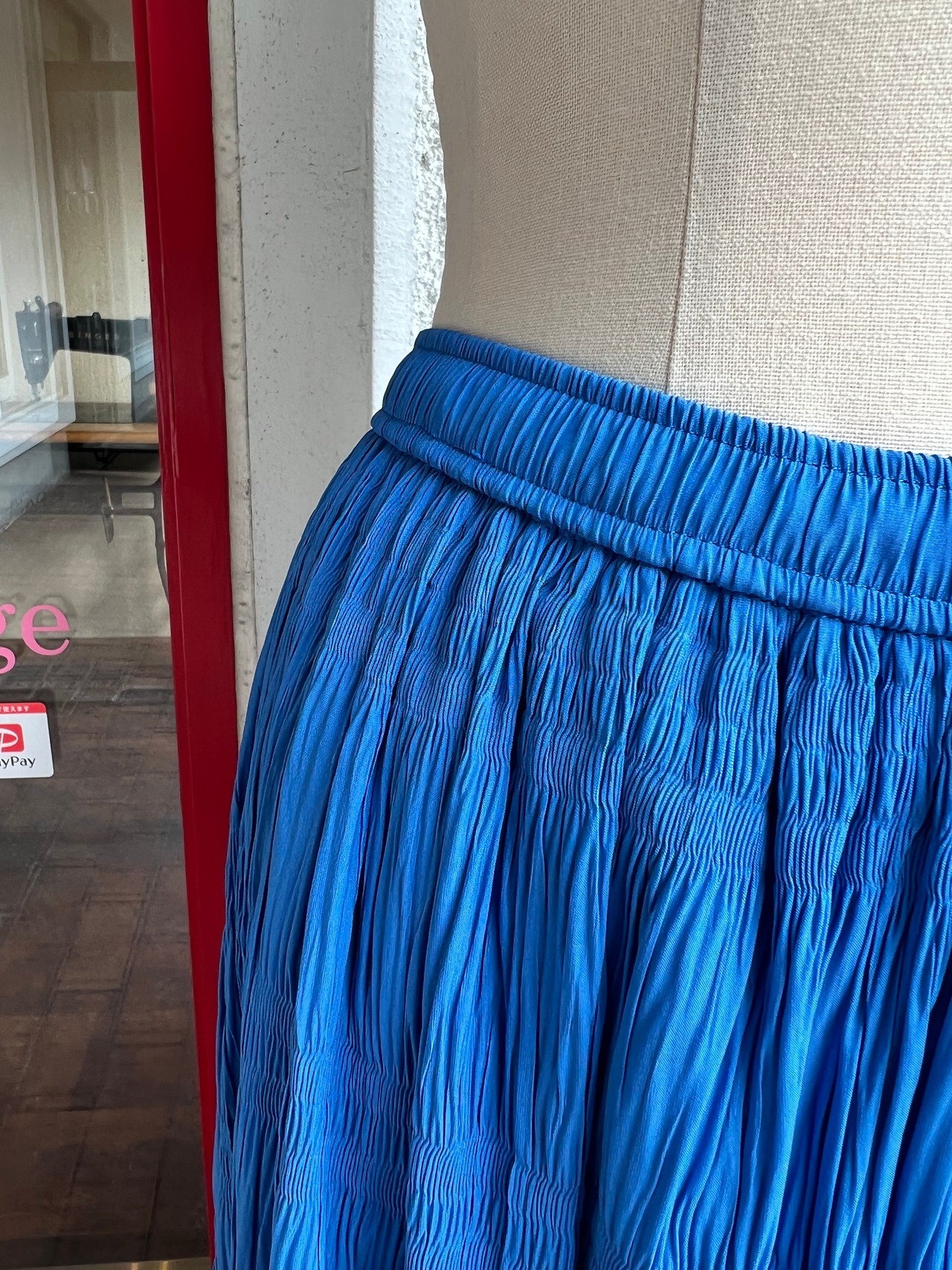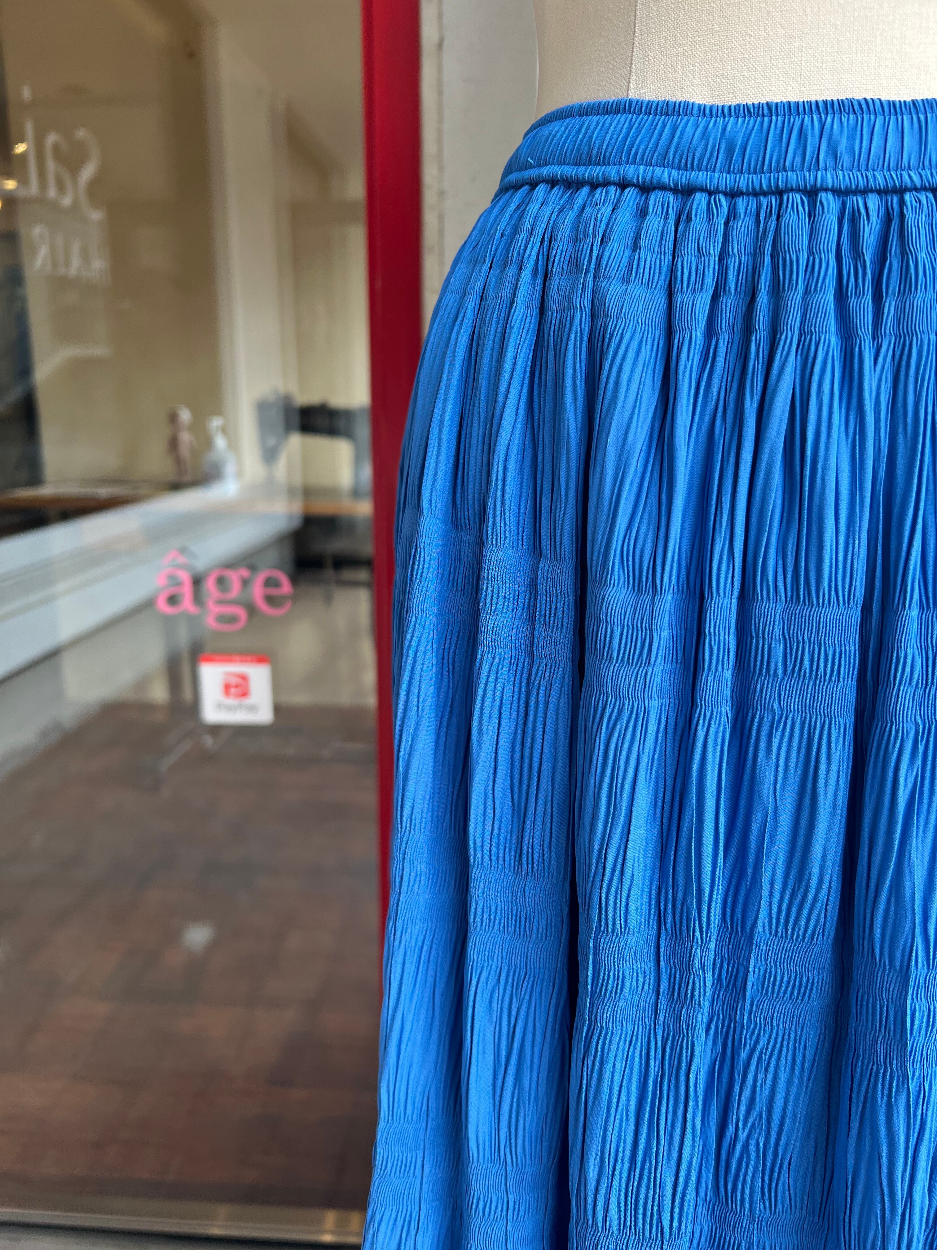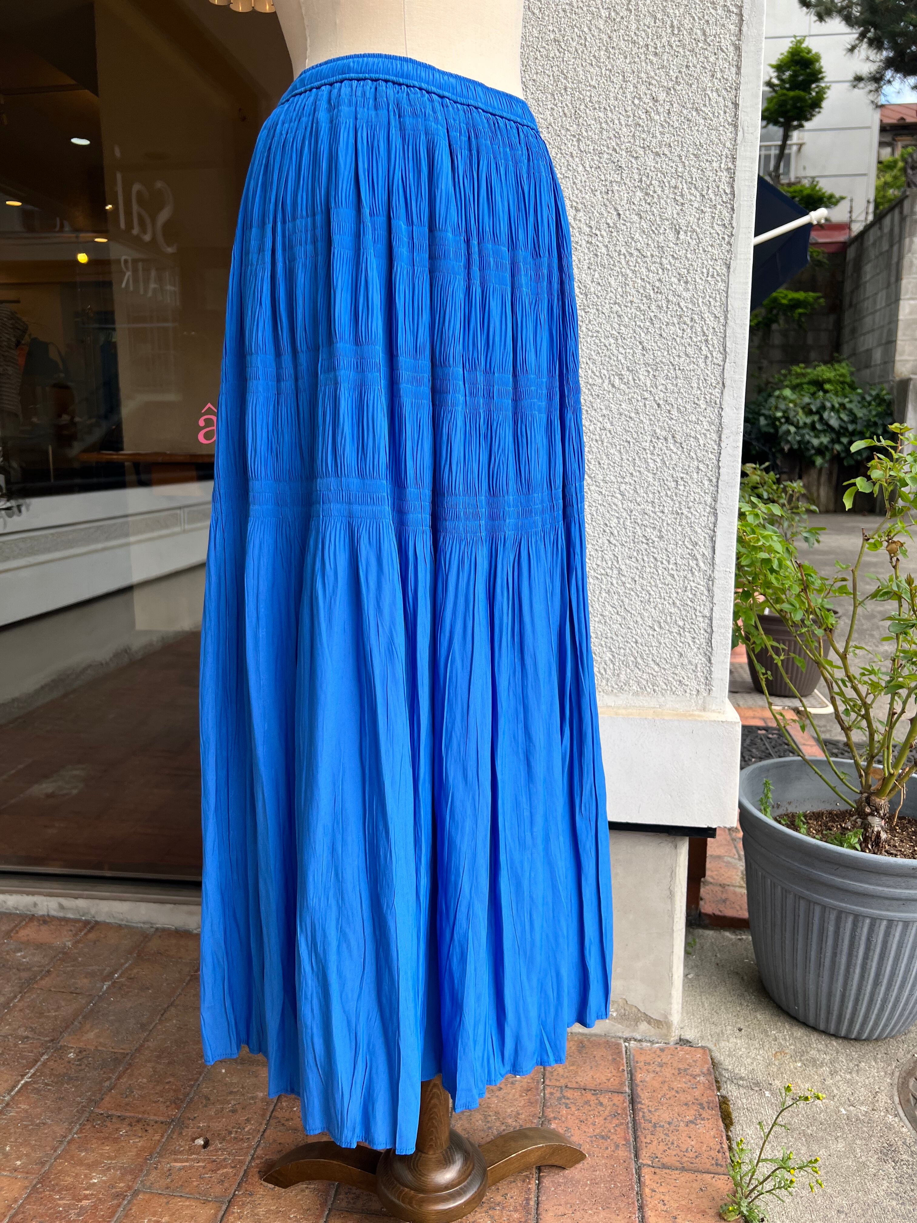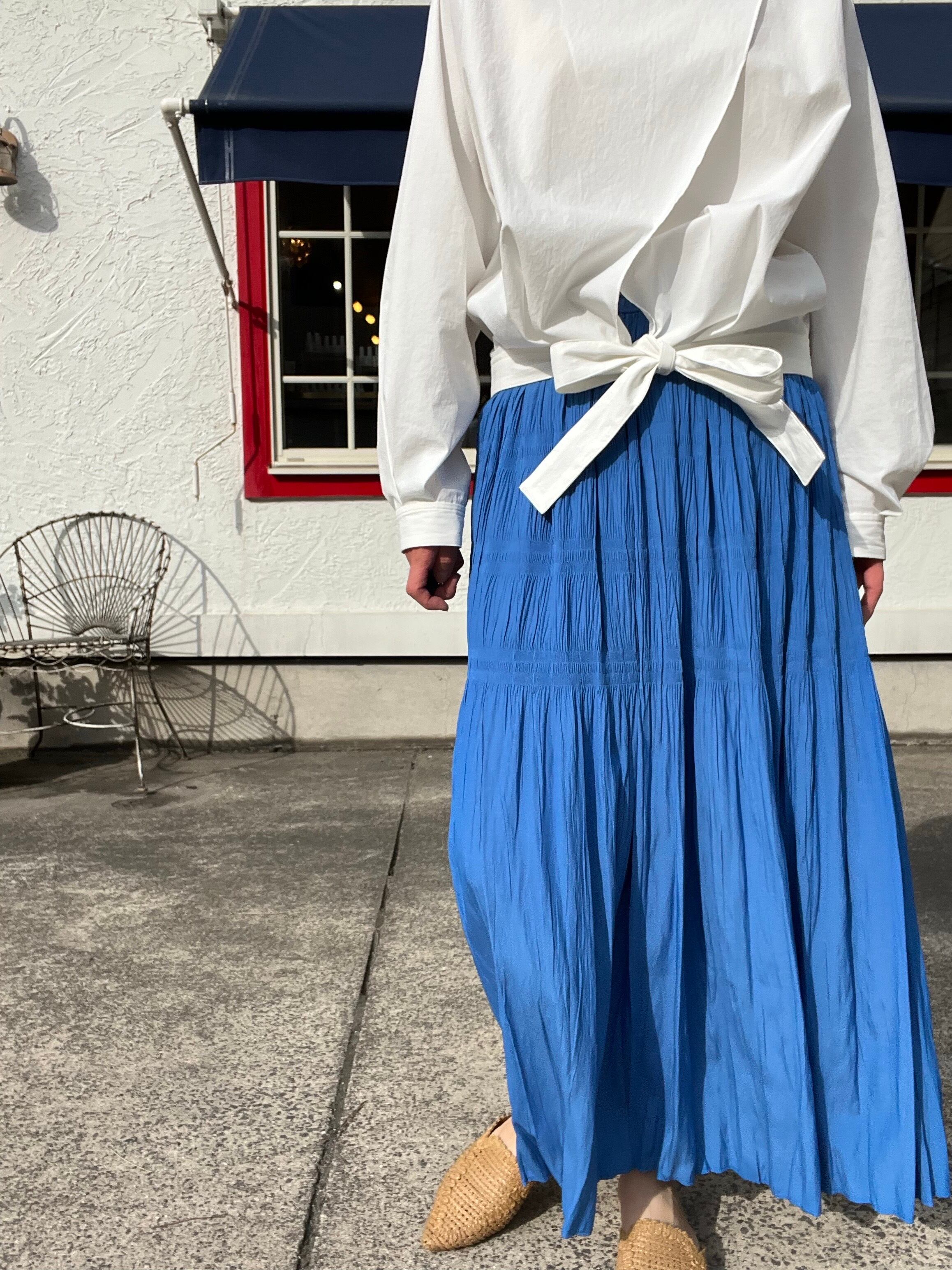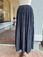 光沢のあるデシン素材にヒップ下までマジョリカプリーツを施したロングスカート