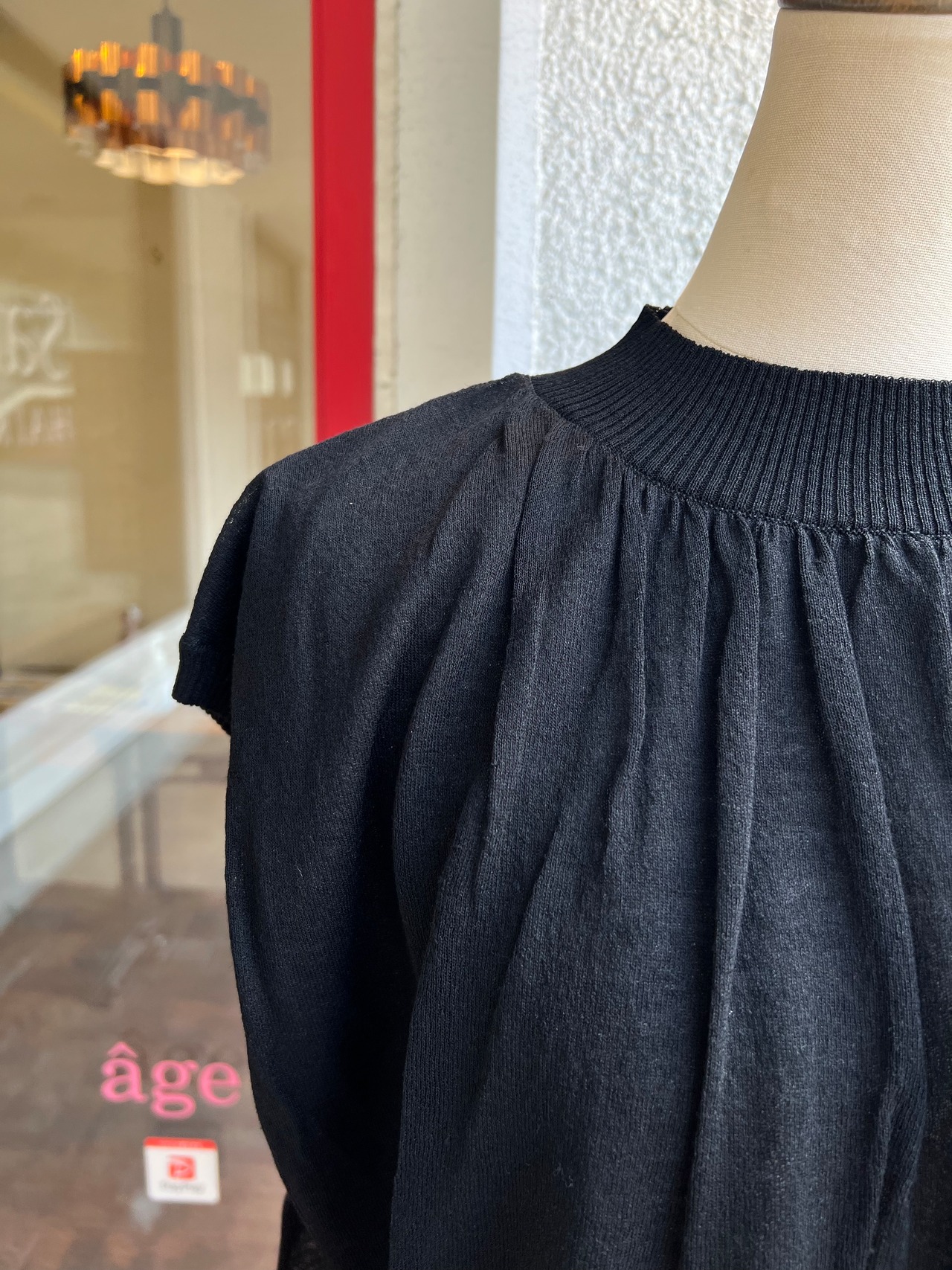 襟元にはたっぷりとギャザーが入り、肩を程よく隠すデザイン