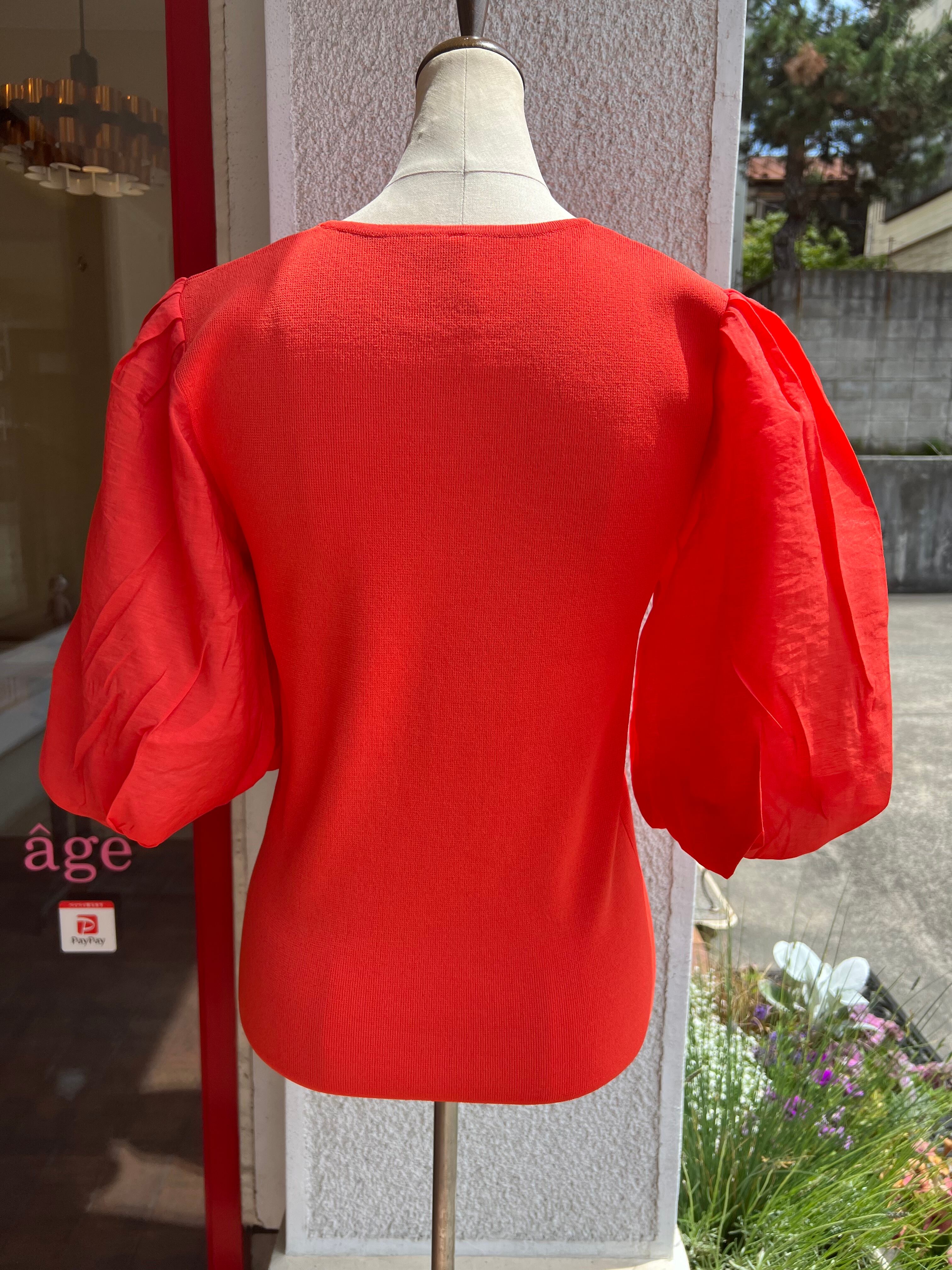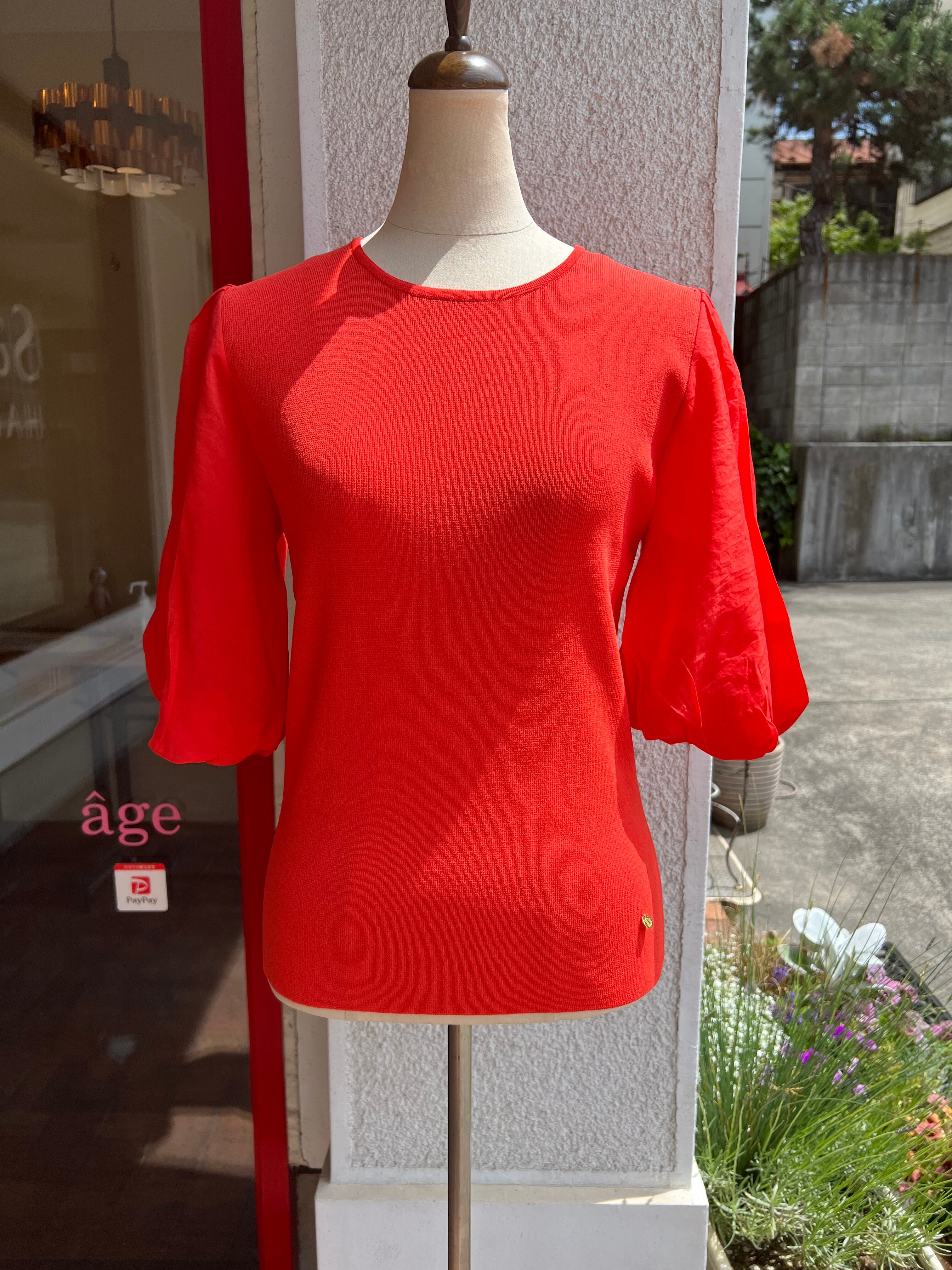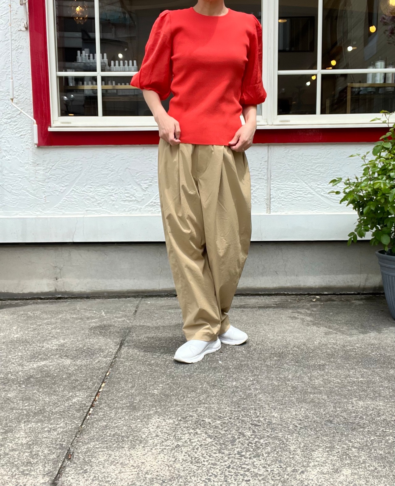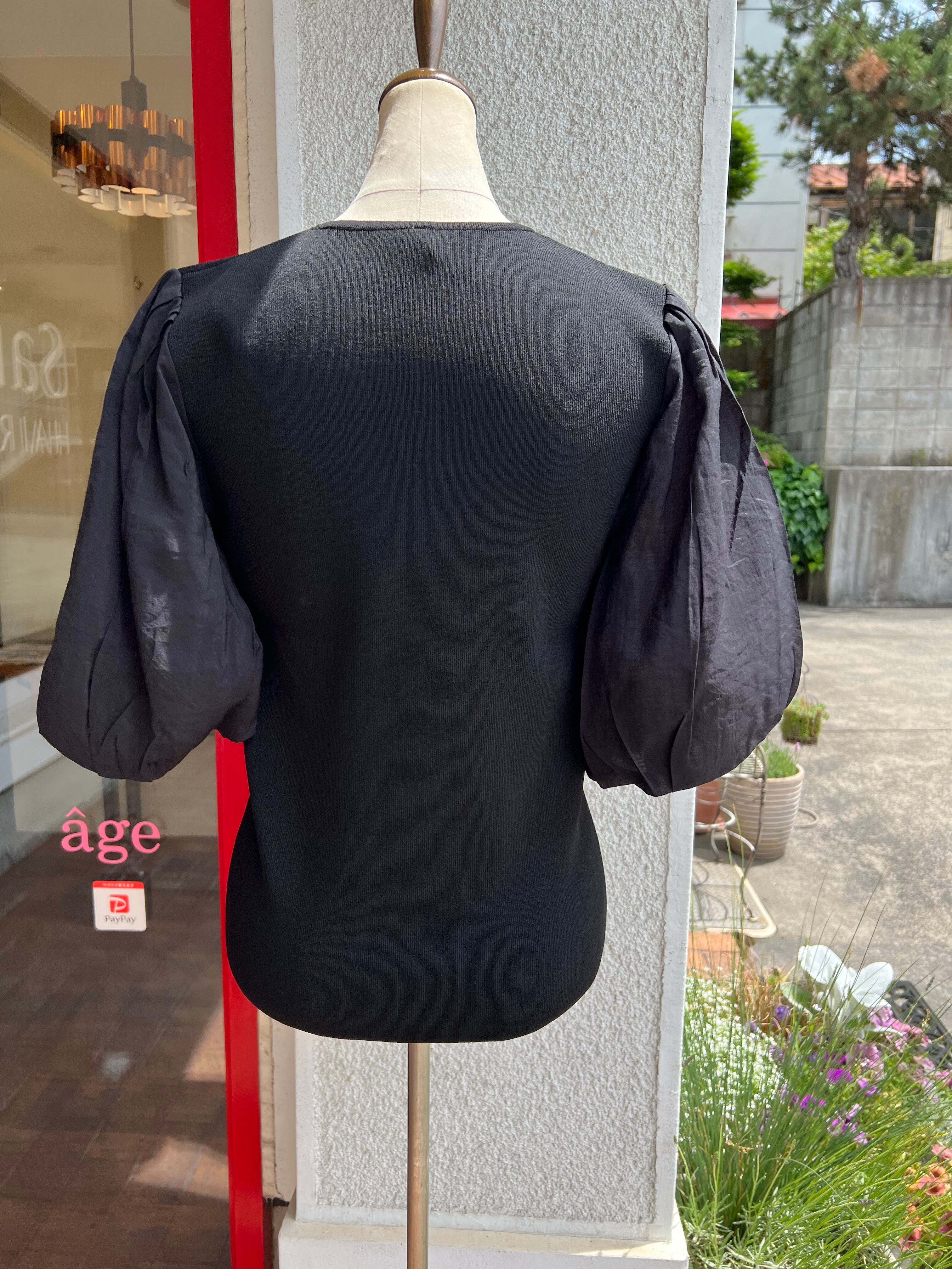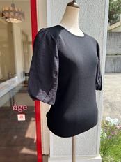 光沢感のあるバルーンスリーブが魅力的なプルオーバーニット