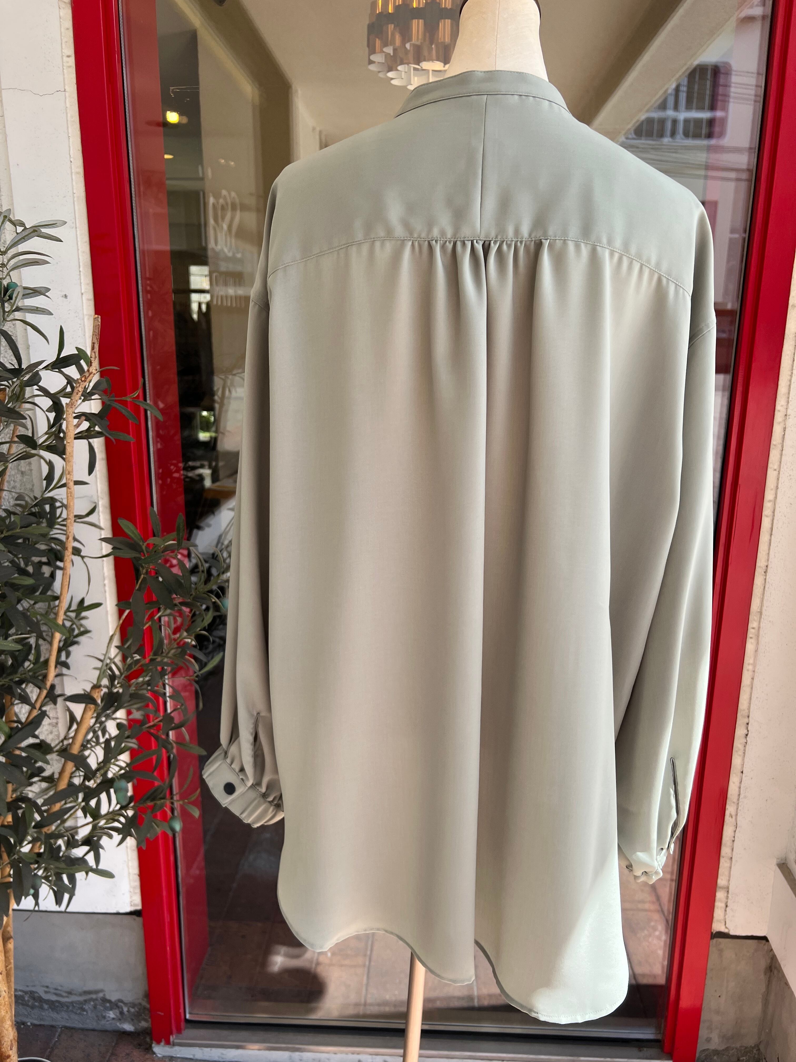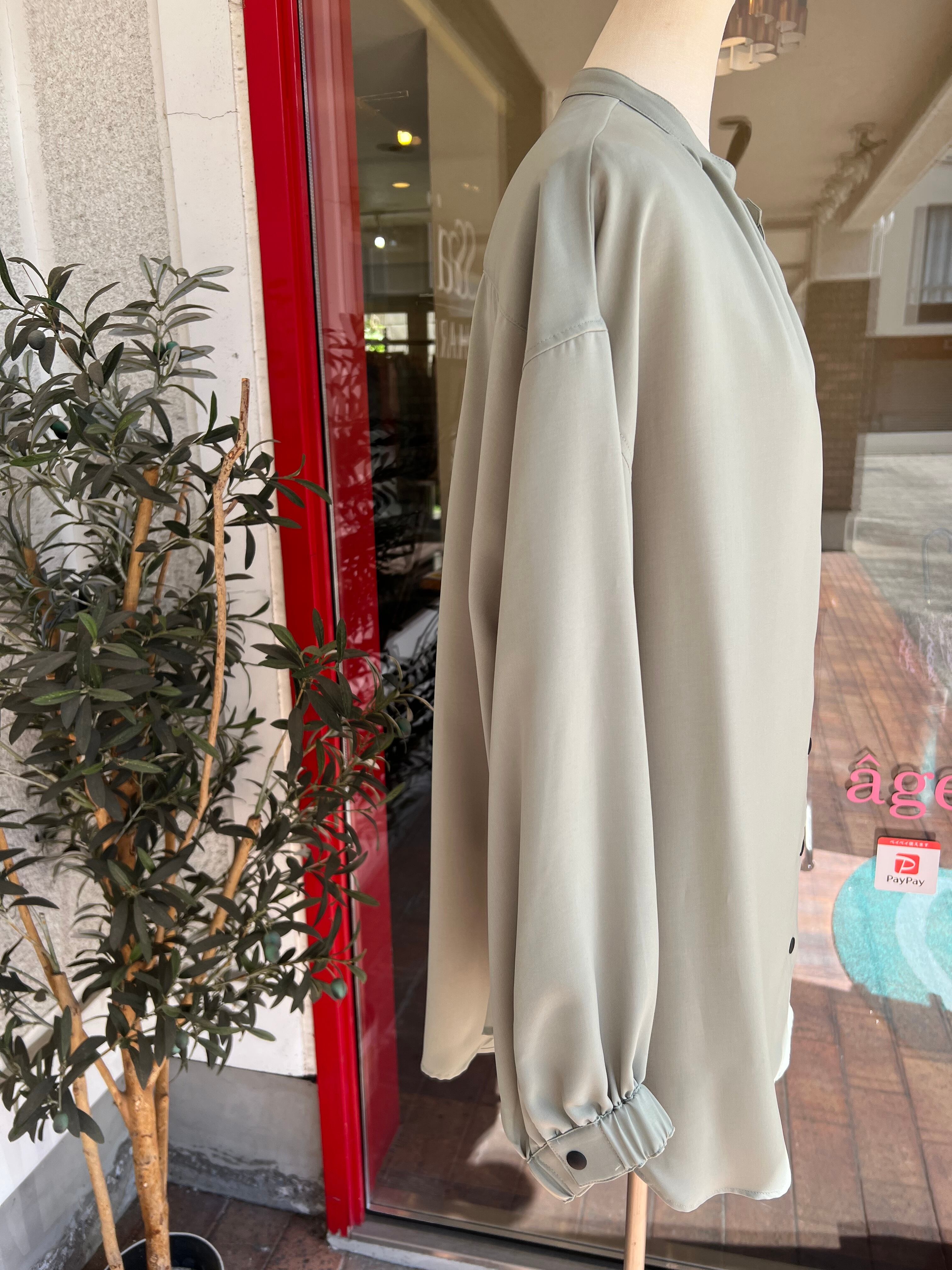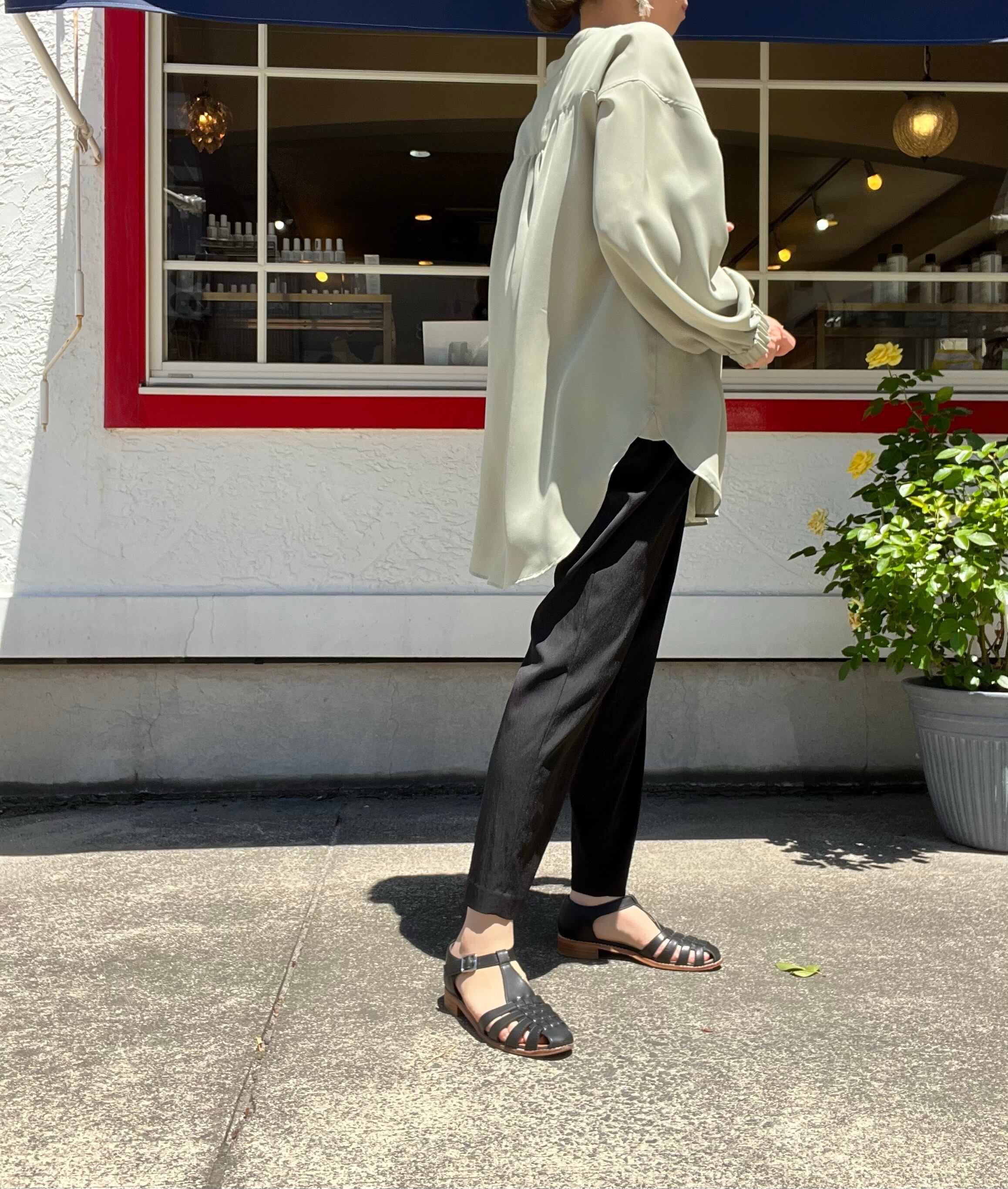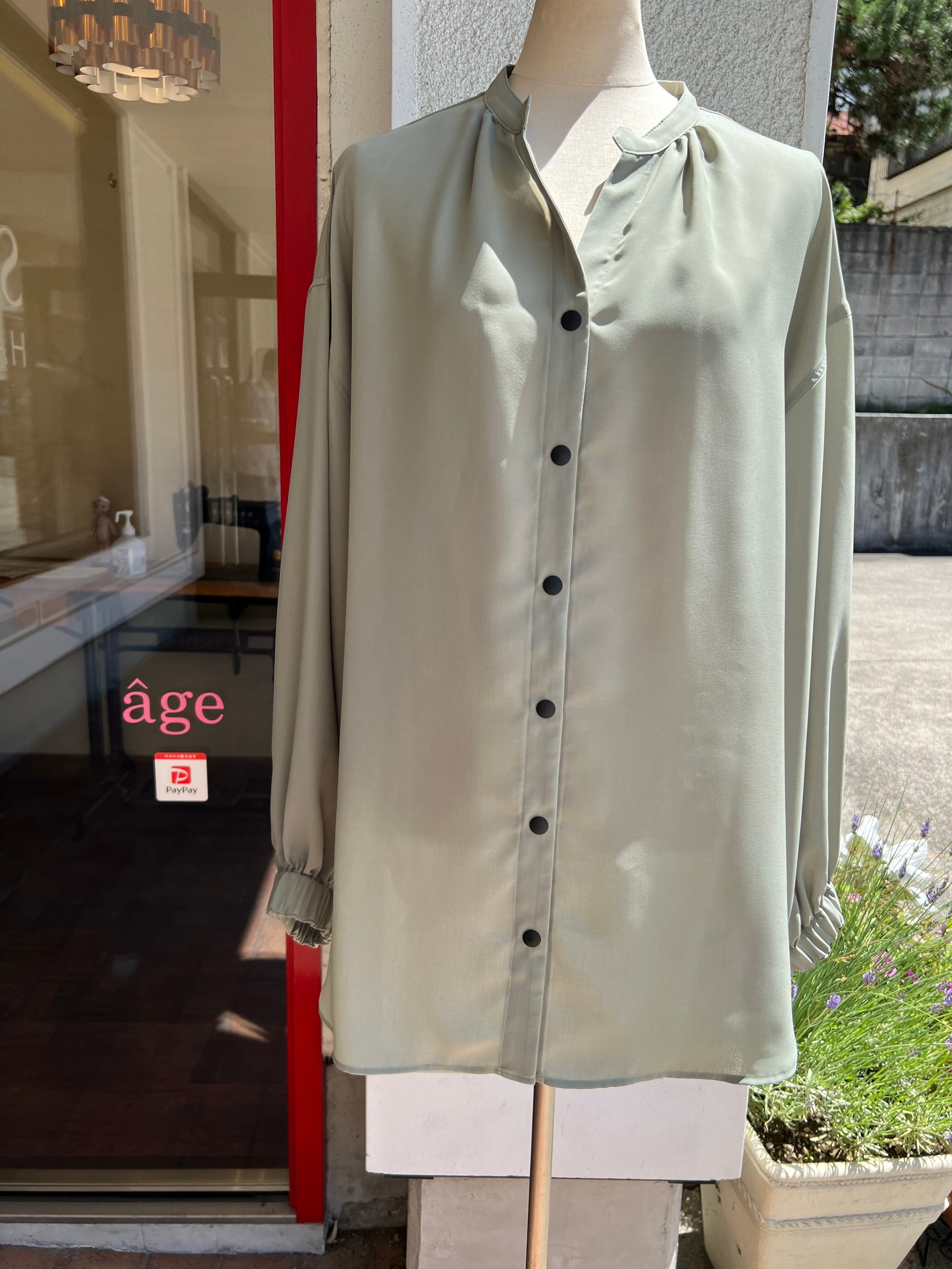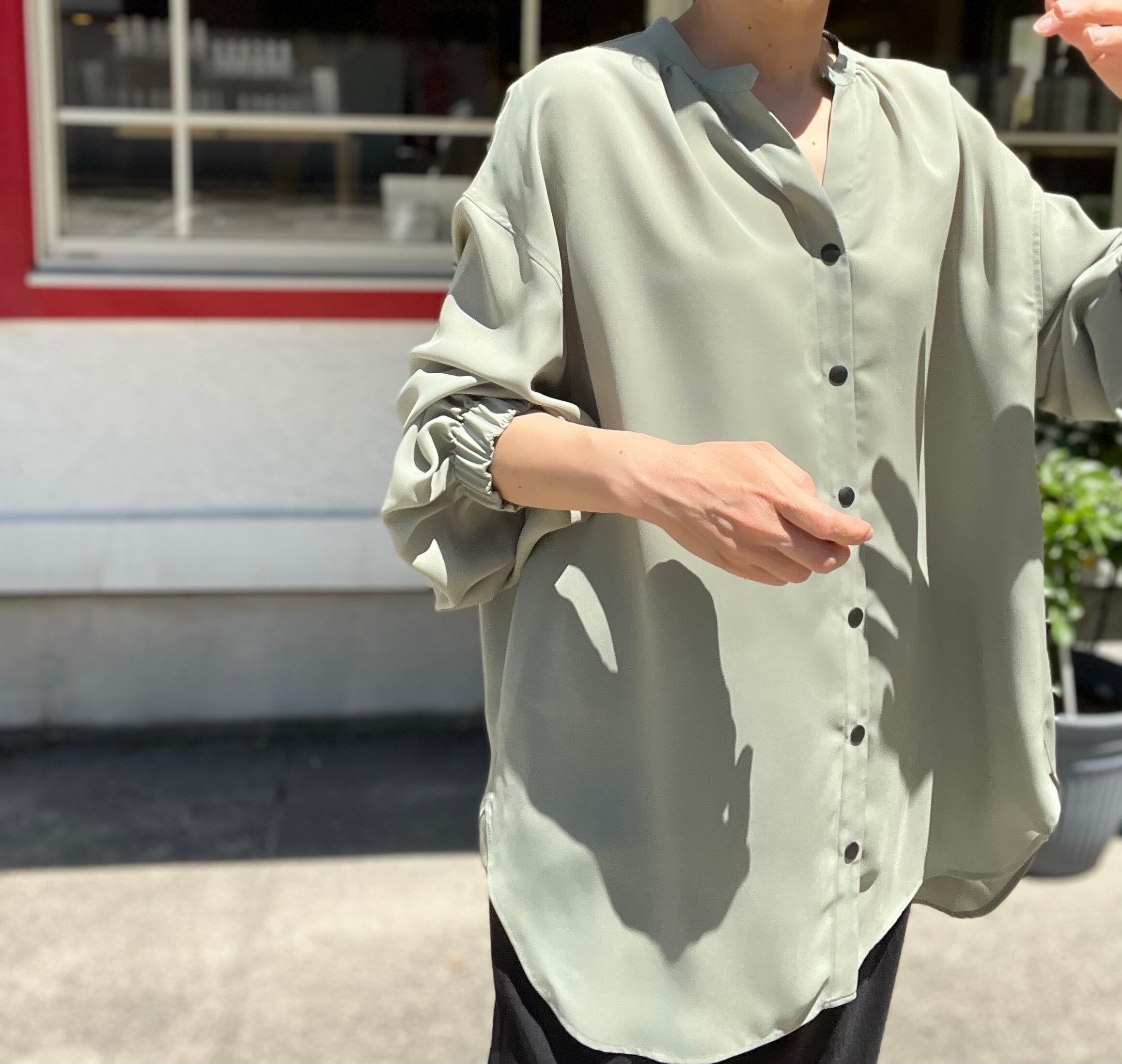ネックにギャザーを寄せ、抜けのある襟元のデザイン
