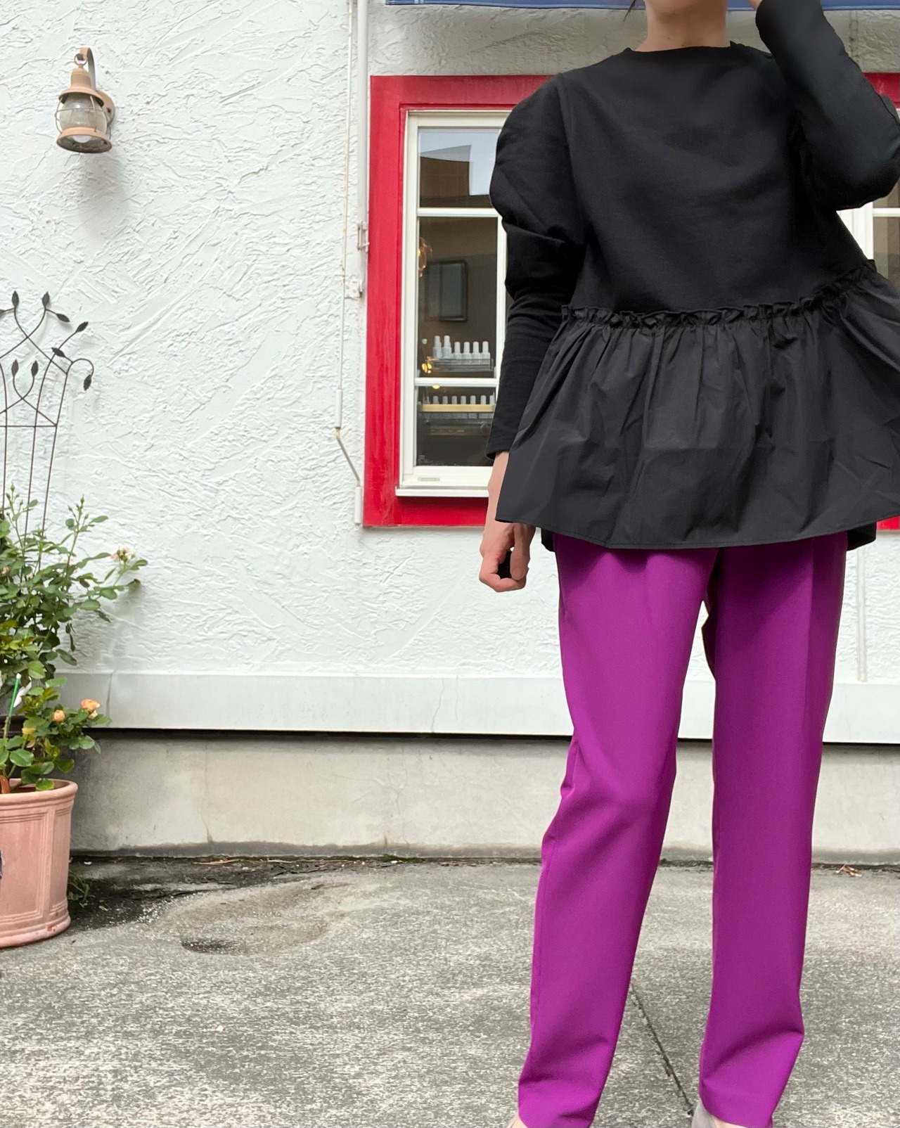 ミニ裏毛に異素材を組み合わせたペプラムカットソー