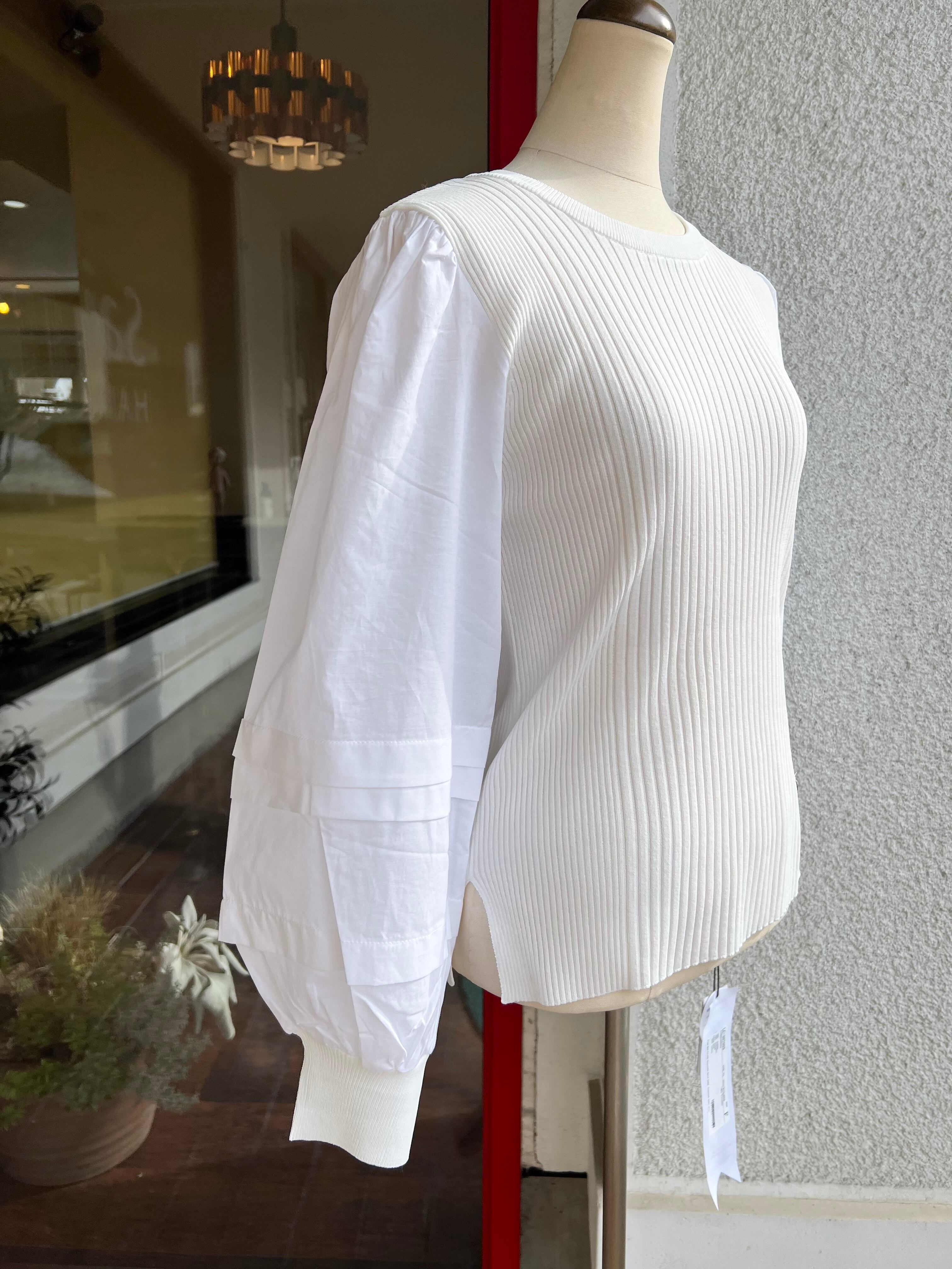ハリのあるスリーブは袖口にはリブが施され、やや透け感もり初夏まで着て頂けます