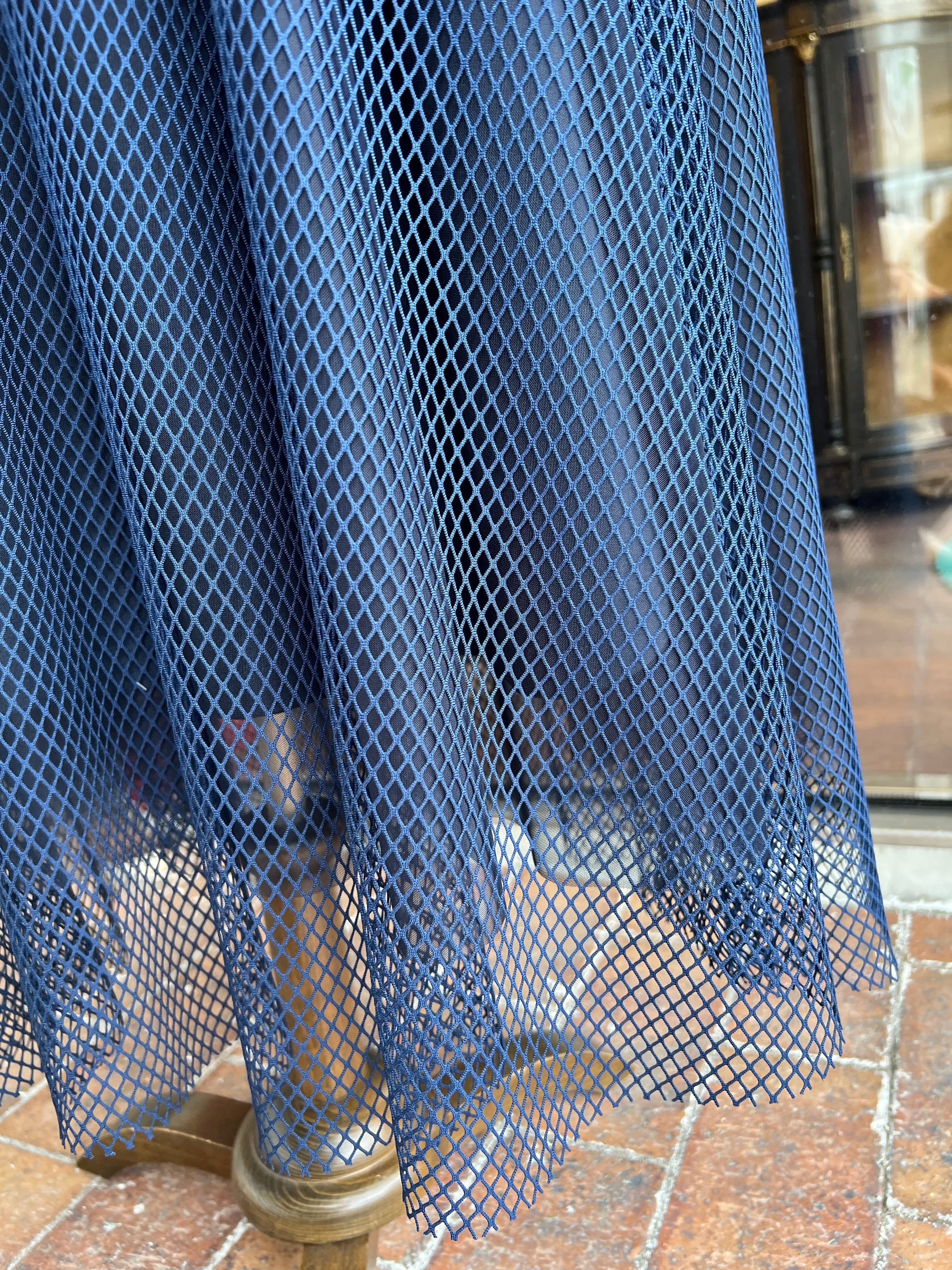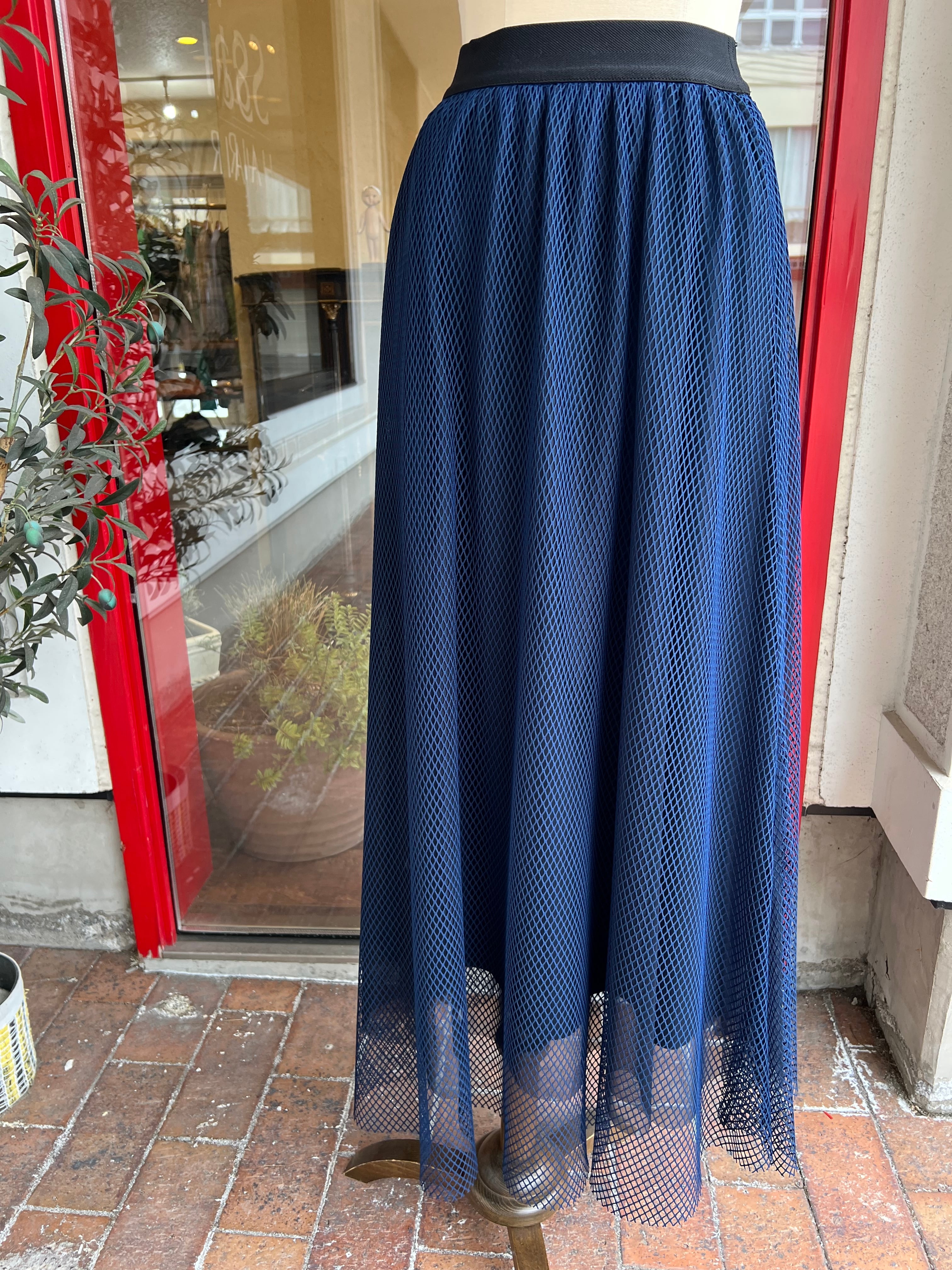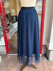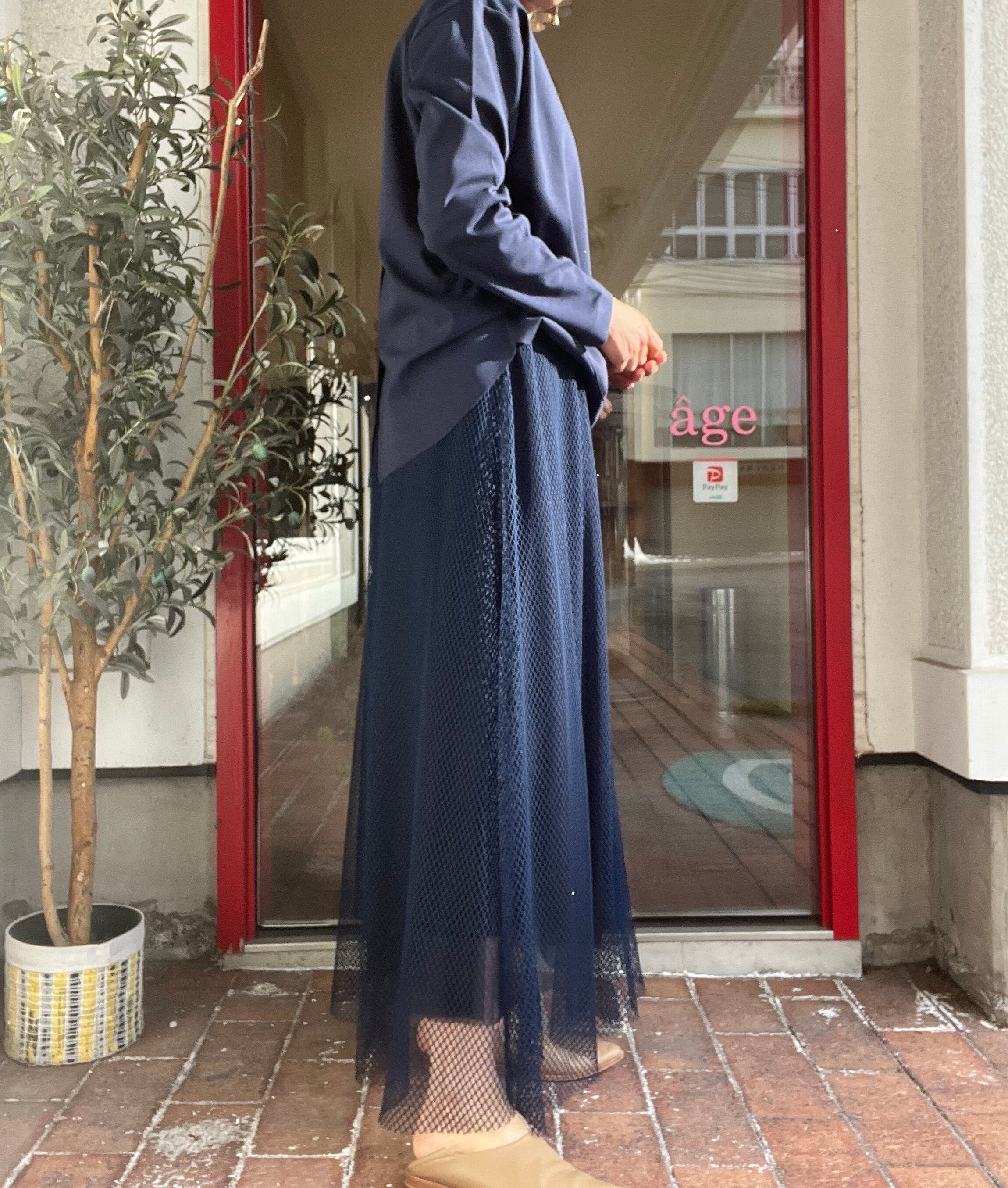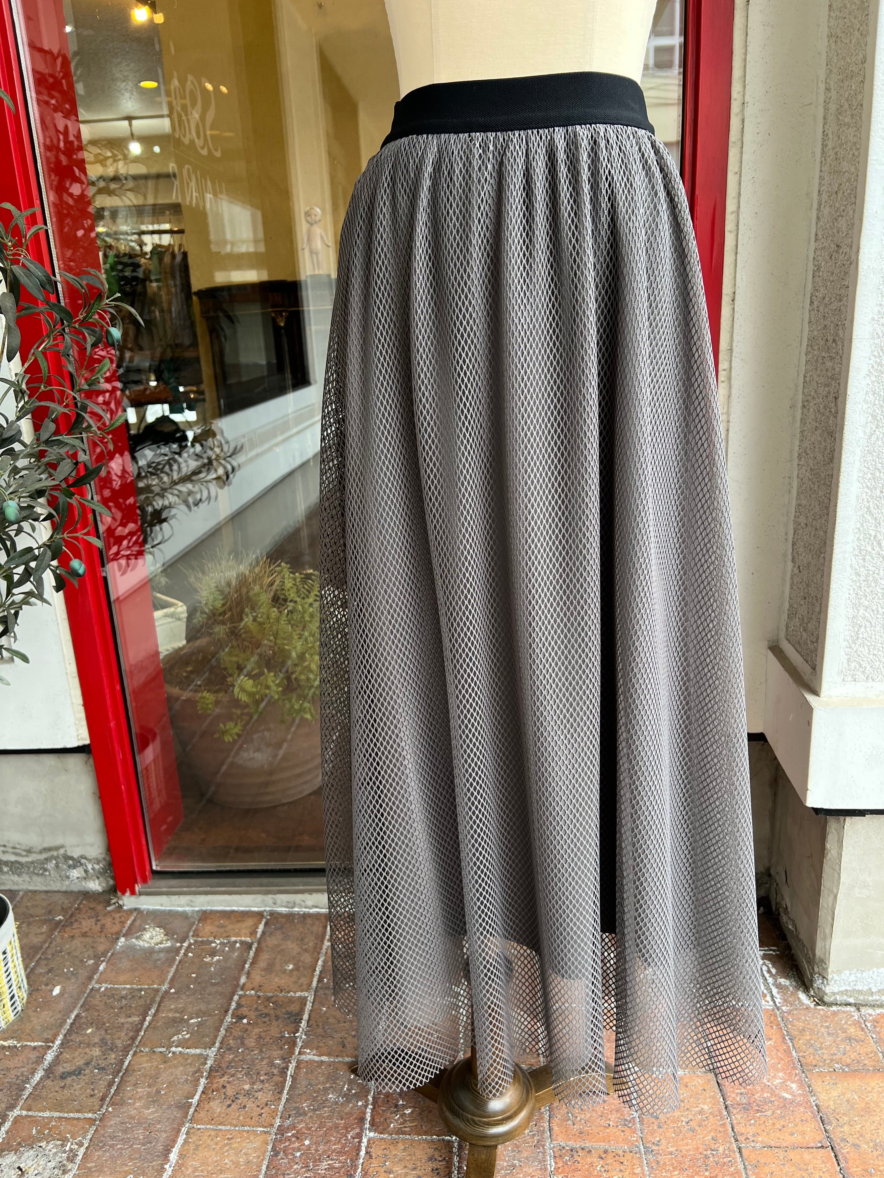 メッシュ生地とチュール素材が重なったフレアシルエットのマキシ丈スカート