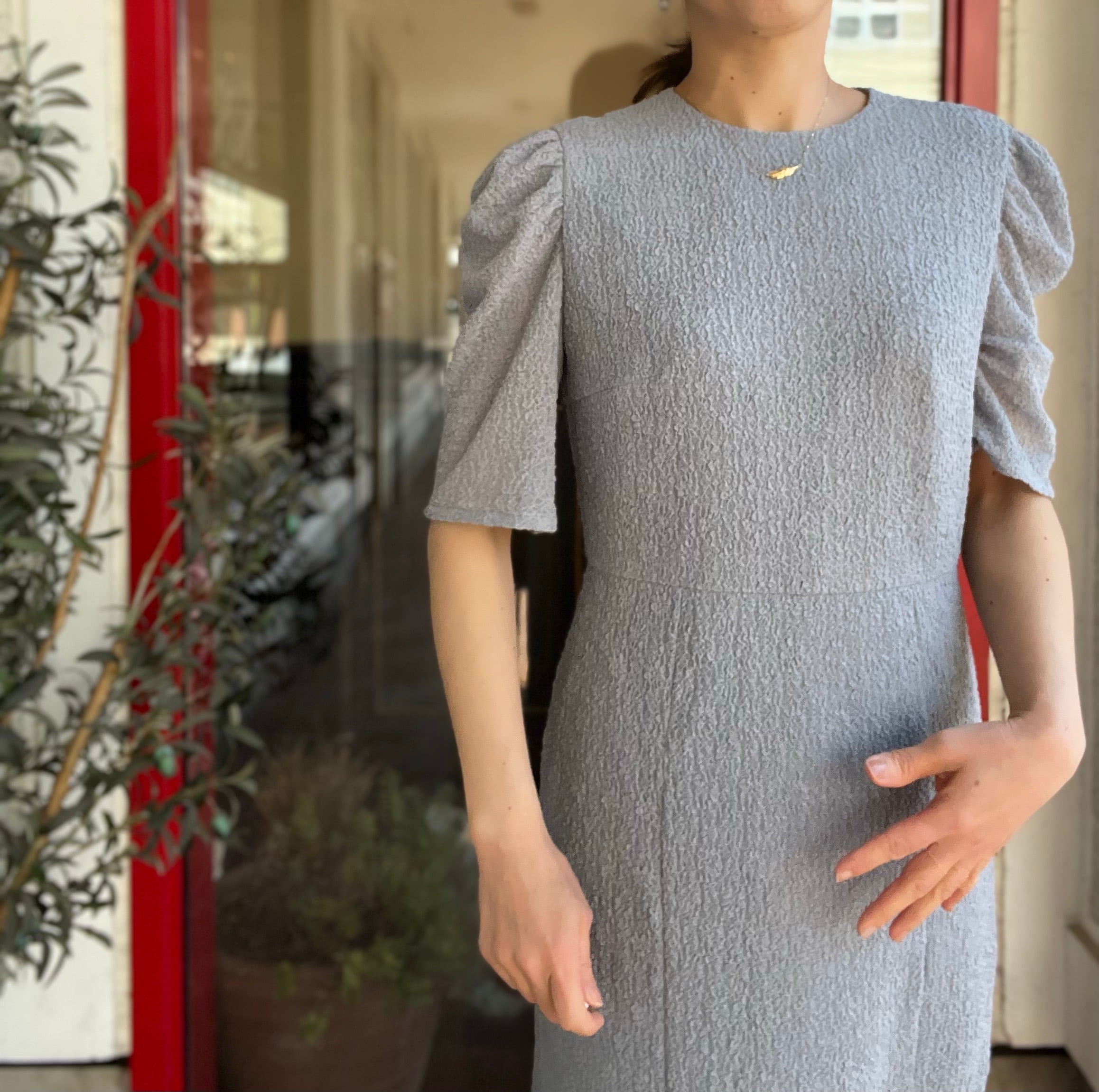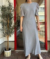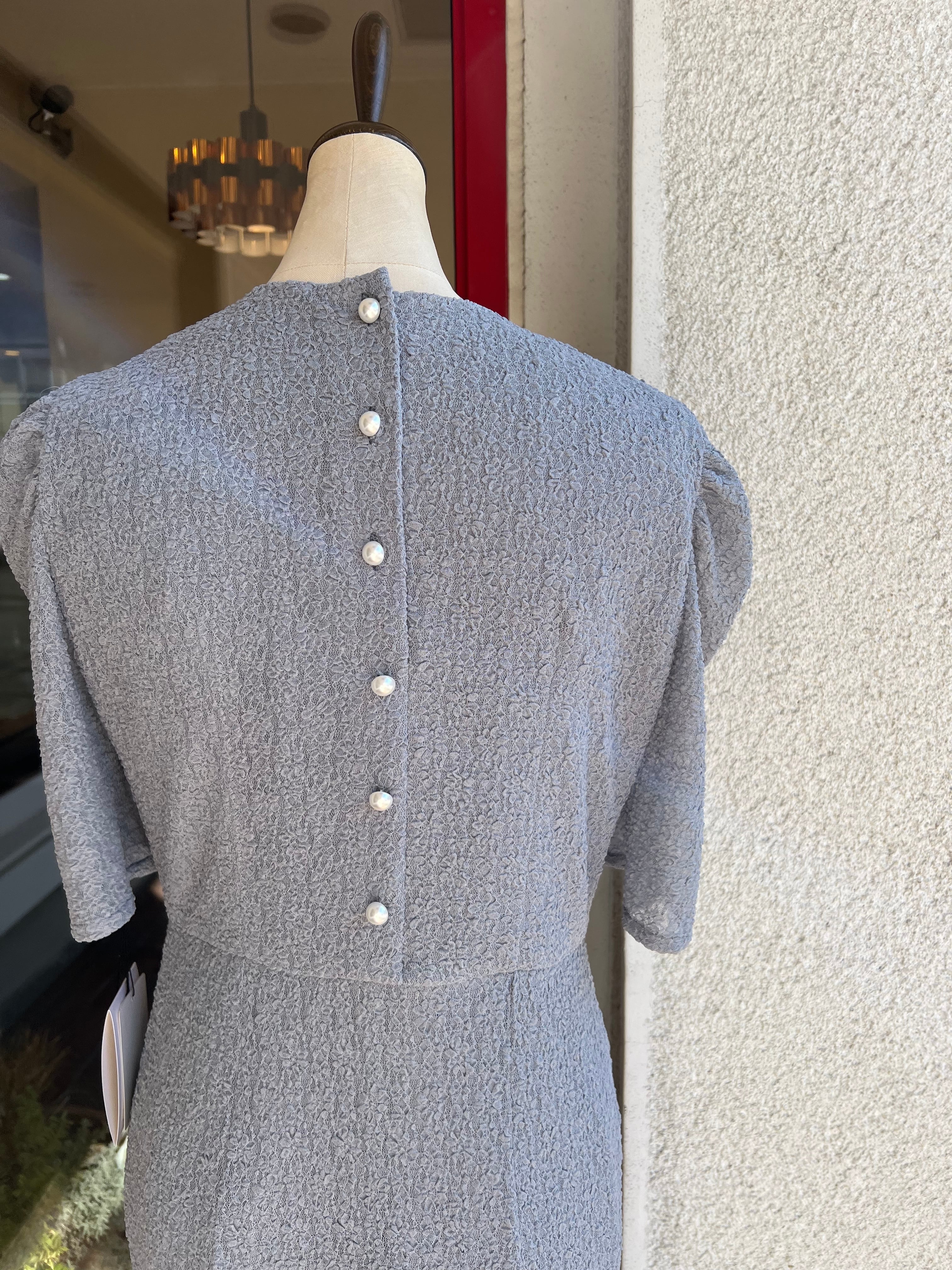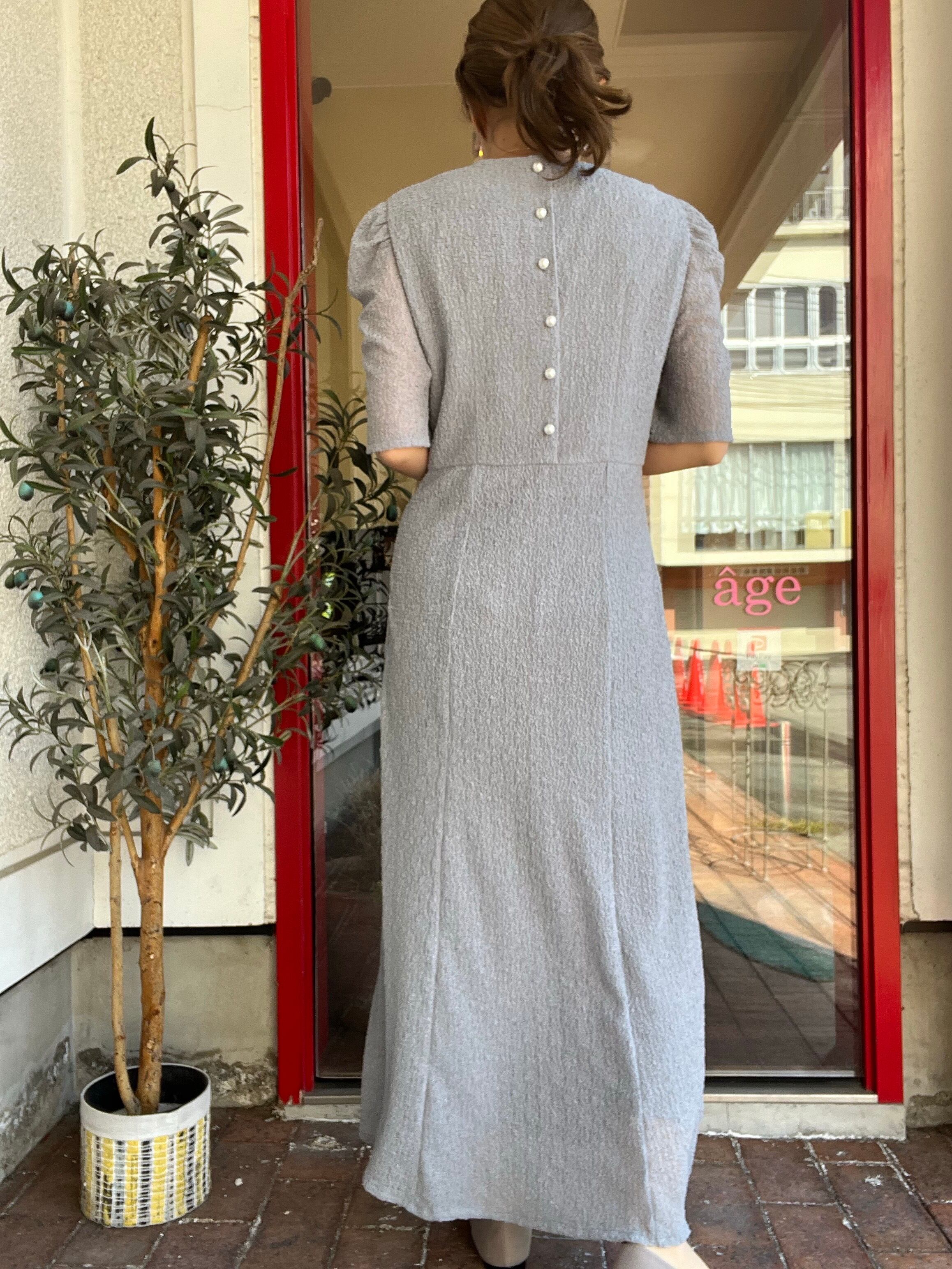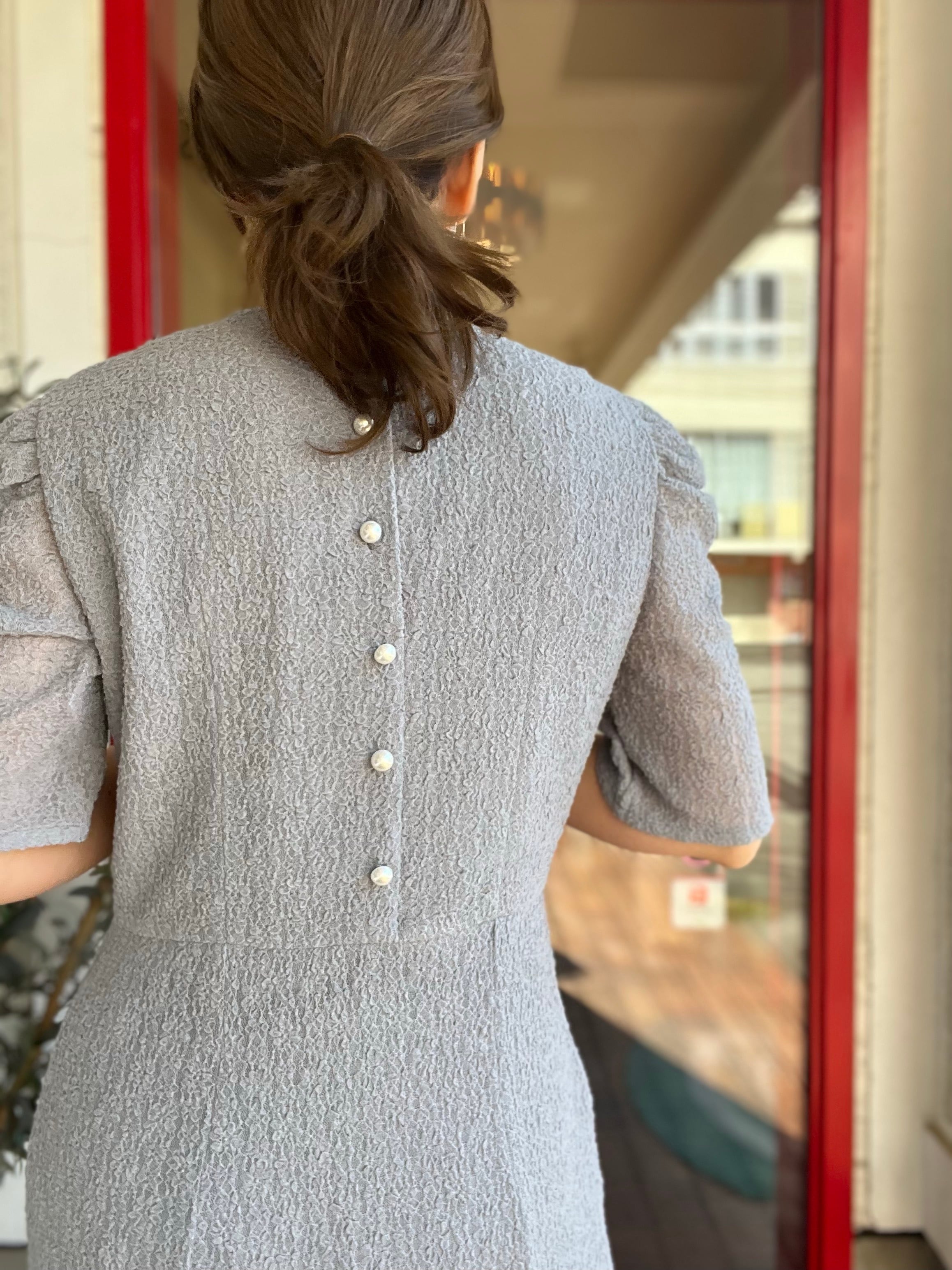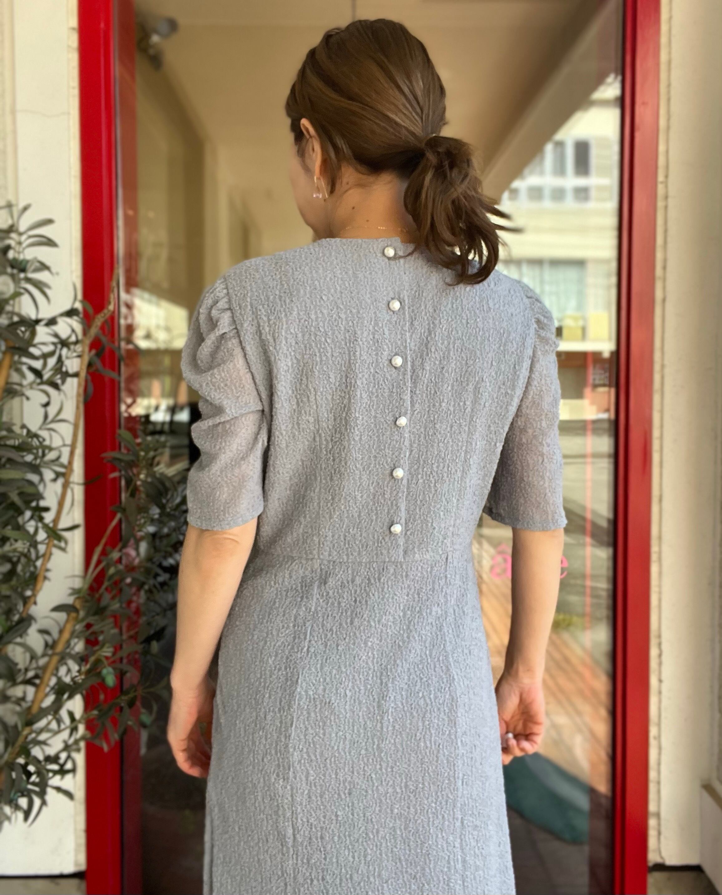 袖のギャザースリーブと、バックのパールボタンが目を引くデザイン