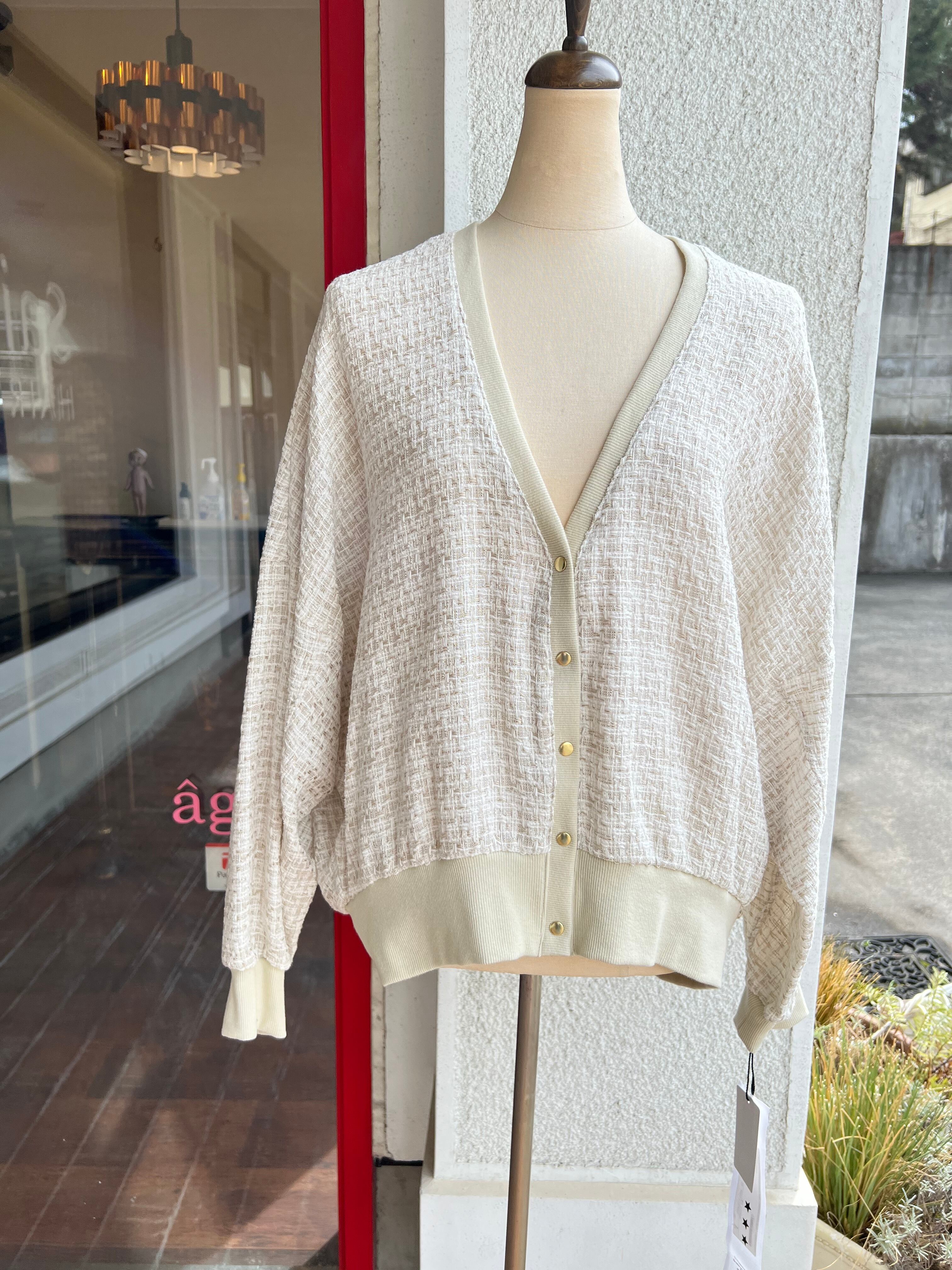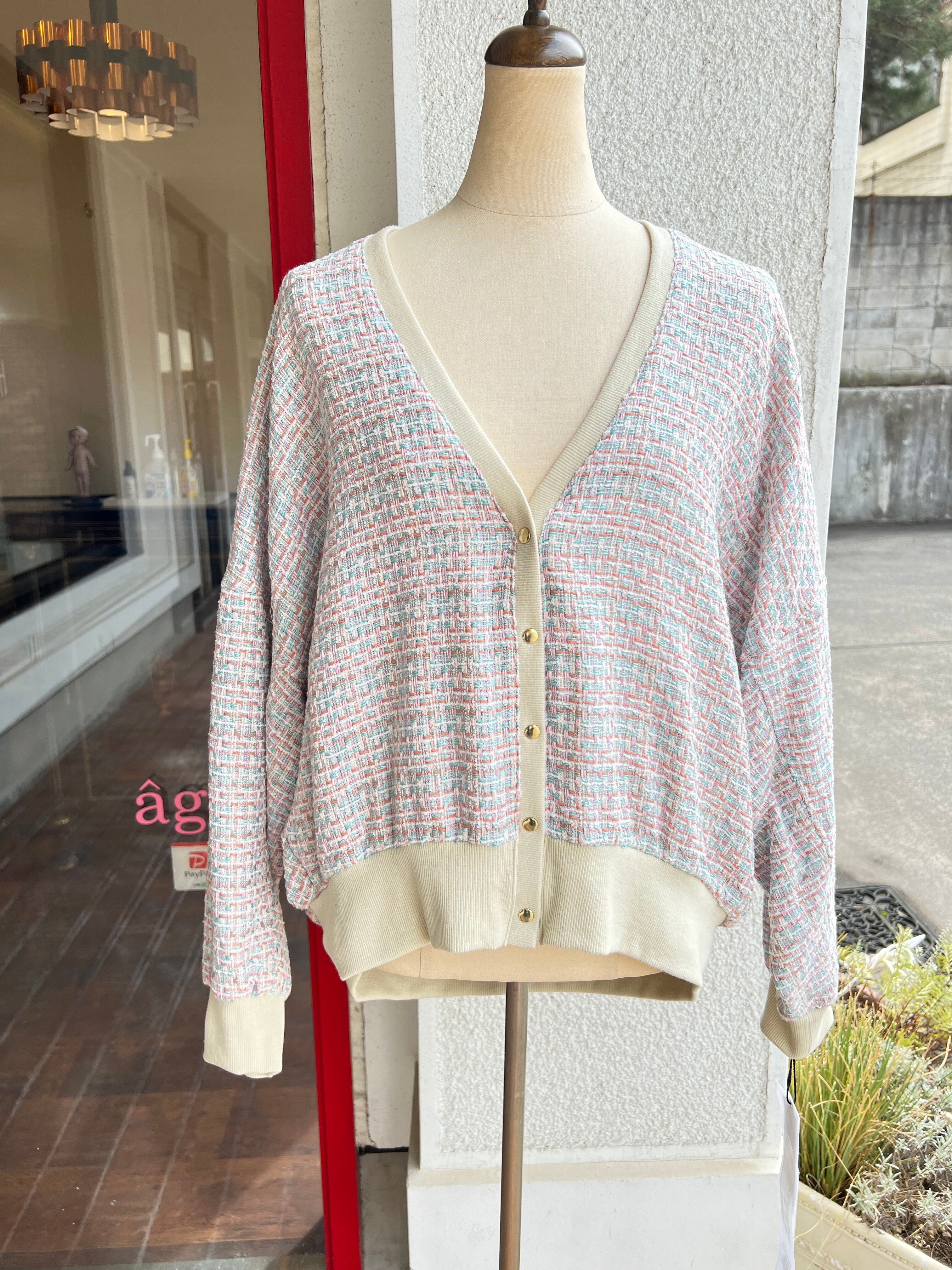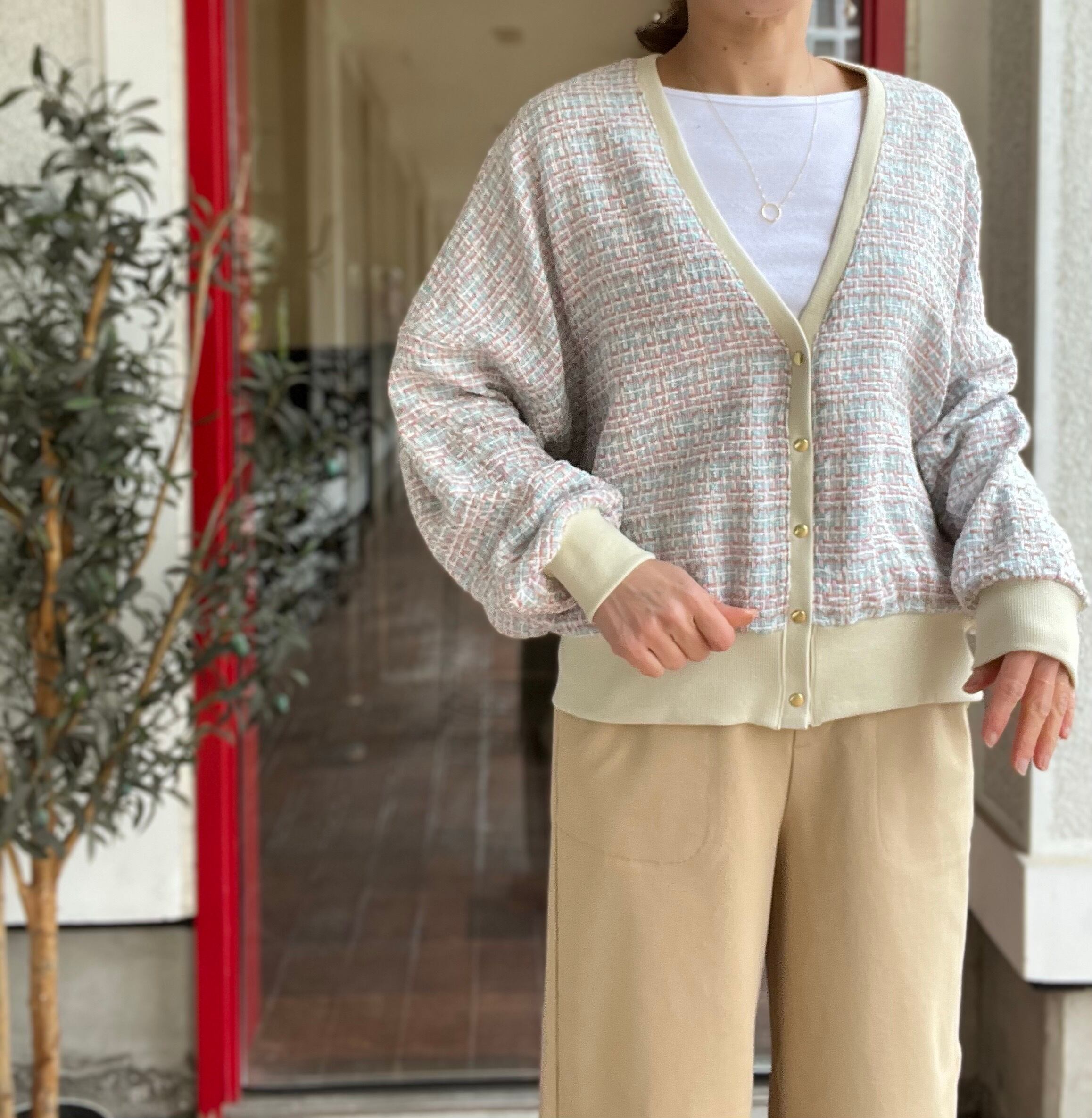 シンプルな着こなしにも気映えるツィードカーディガンです