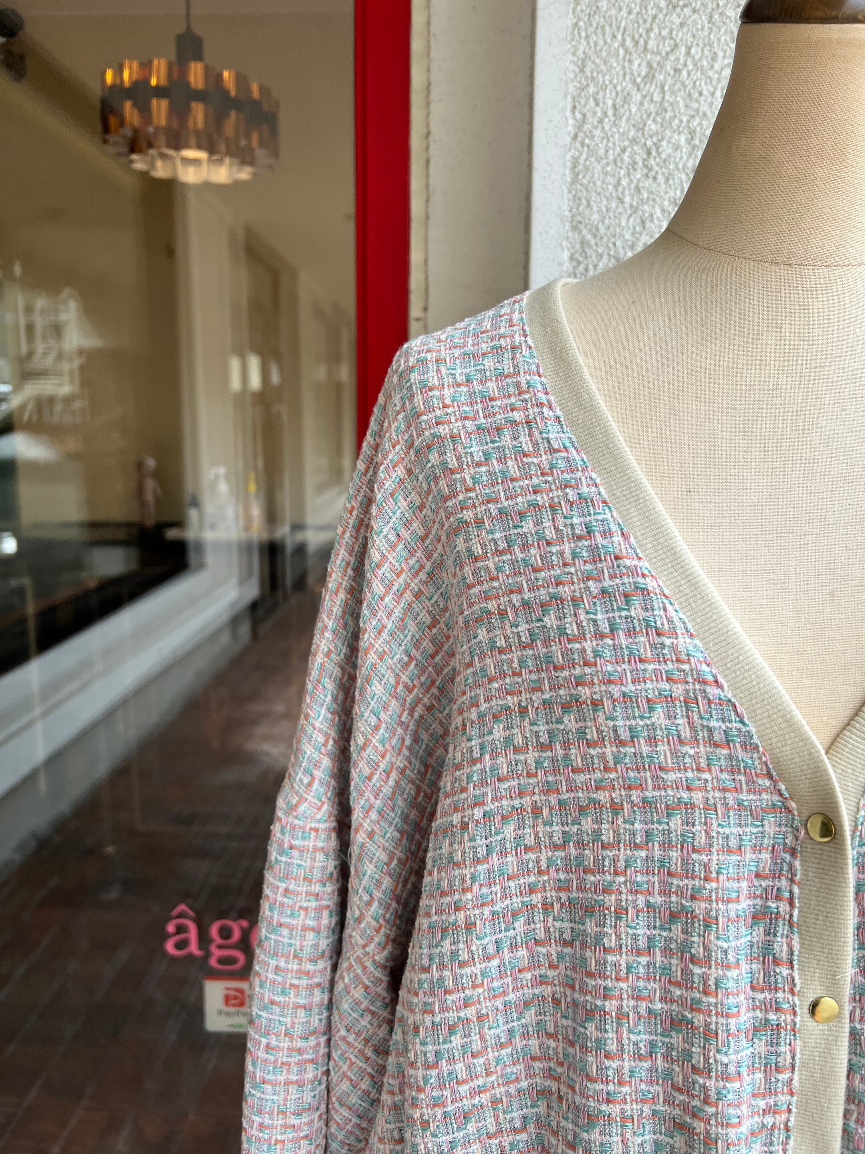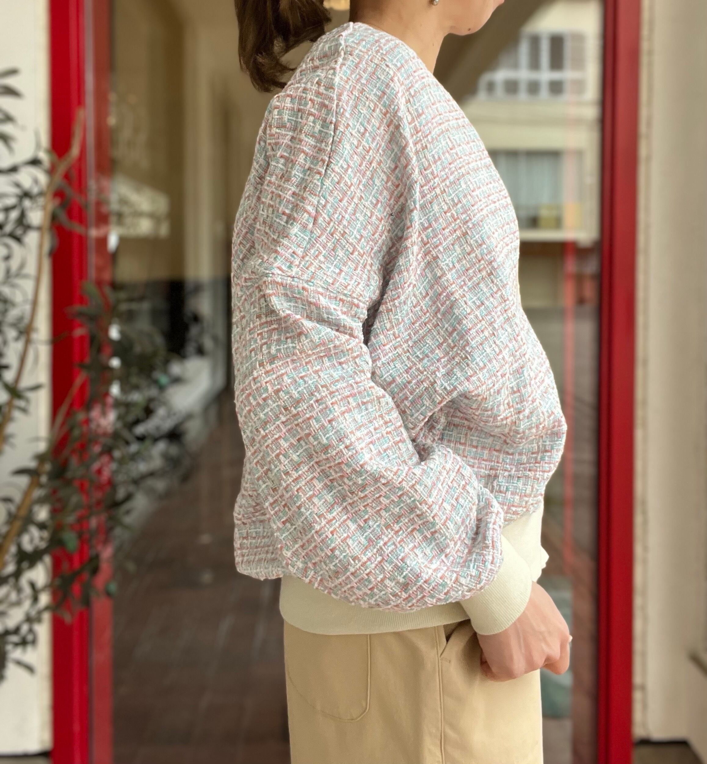 コートの下にも着れる程よい薄さのツィードカーディガン
