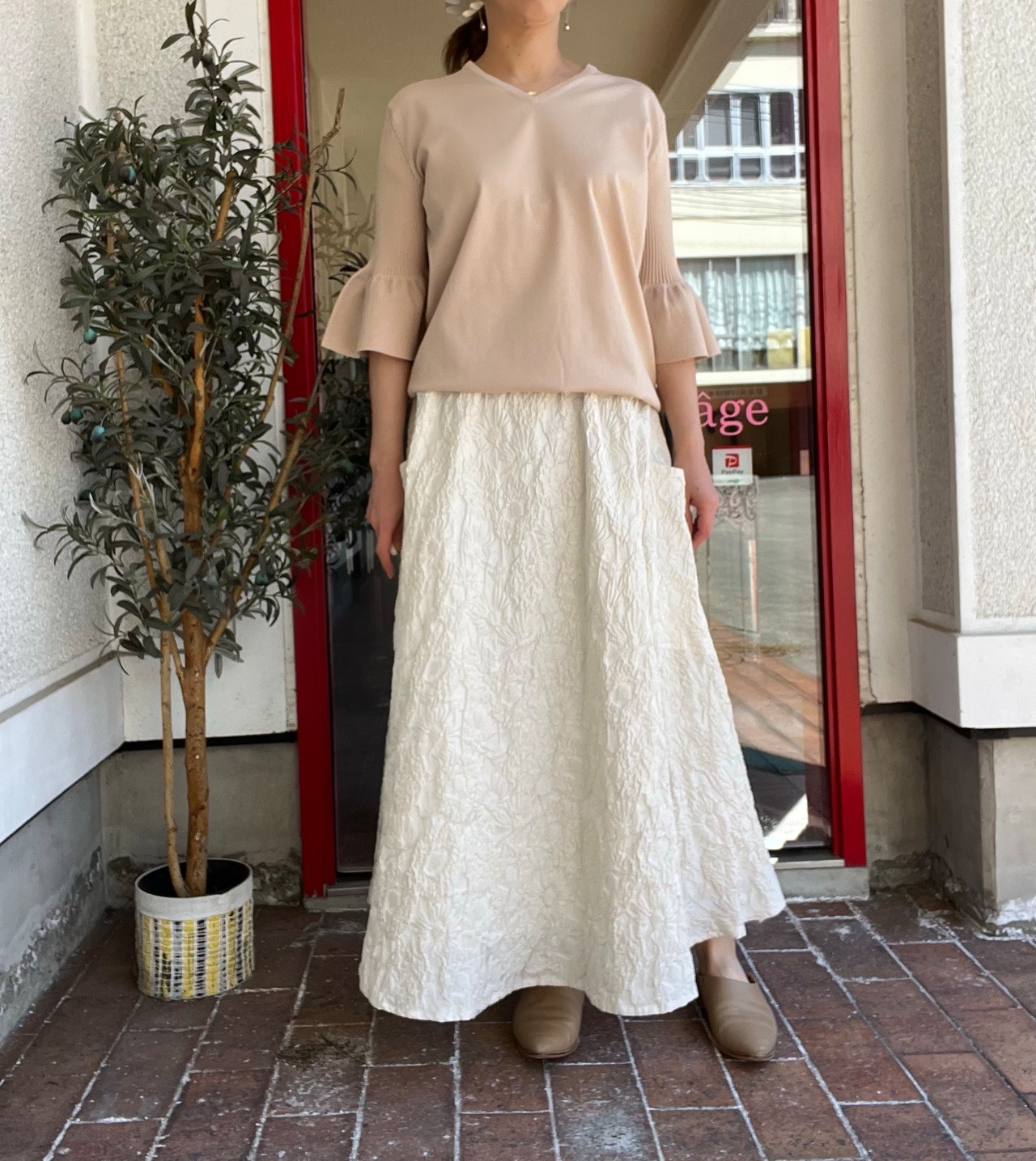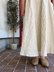 ハリ感のある生地をたっぷりと使用したフレアシルエットは上品な印象です