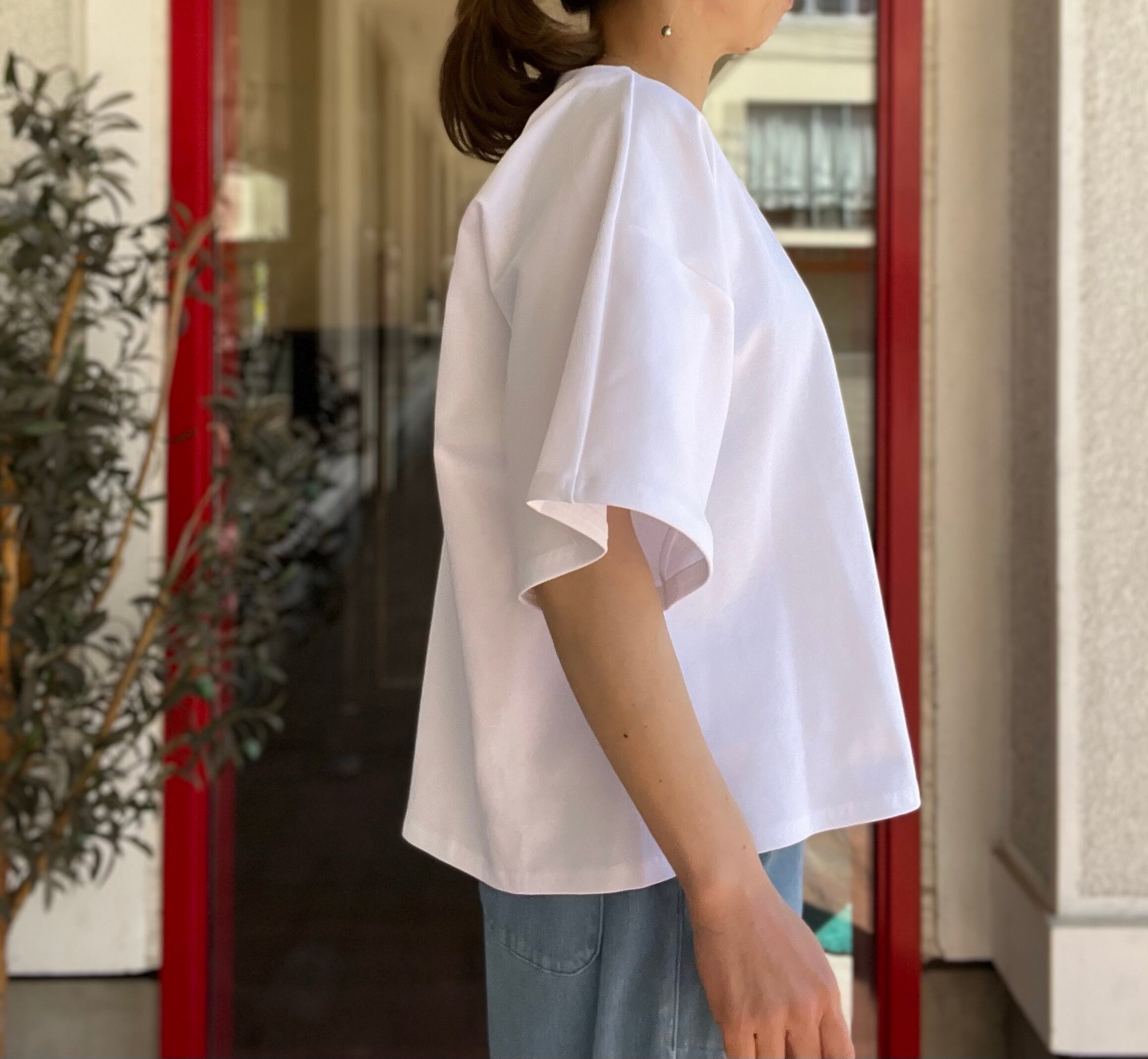 ワイドな袖は五分袖と長めで、肘が隠れる長さです