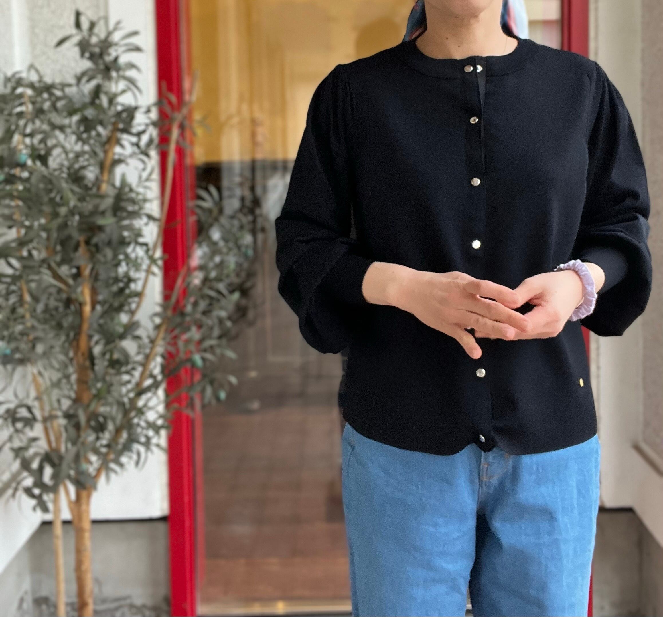 今年らしいスナップ釦のカーディガンは