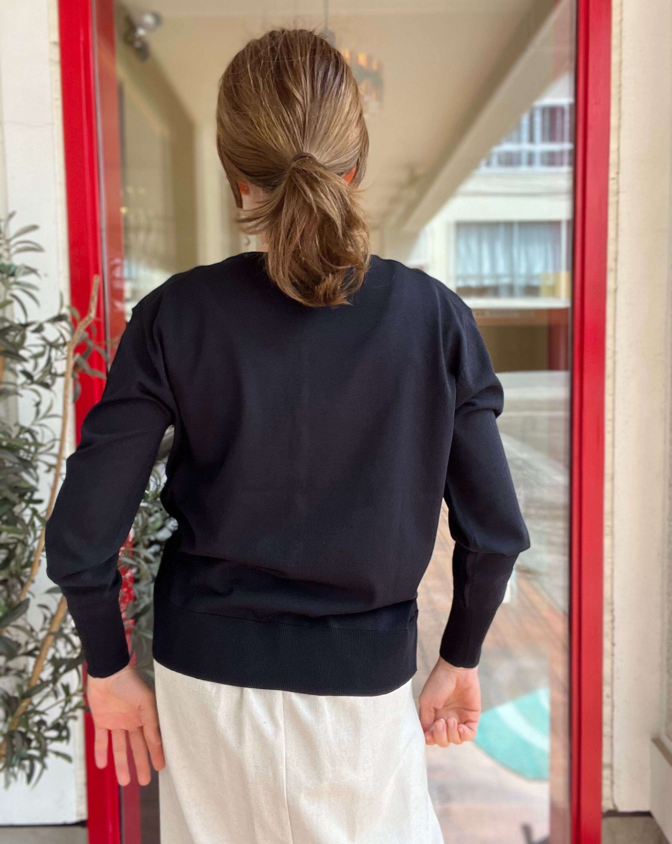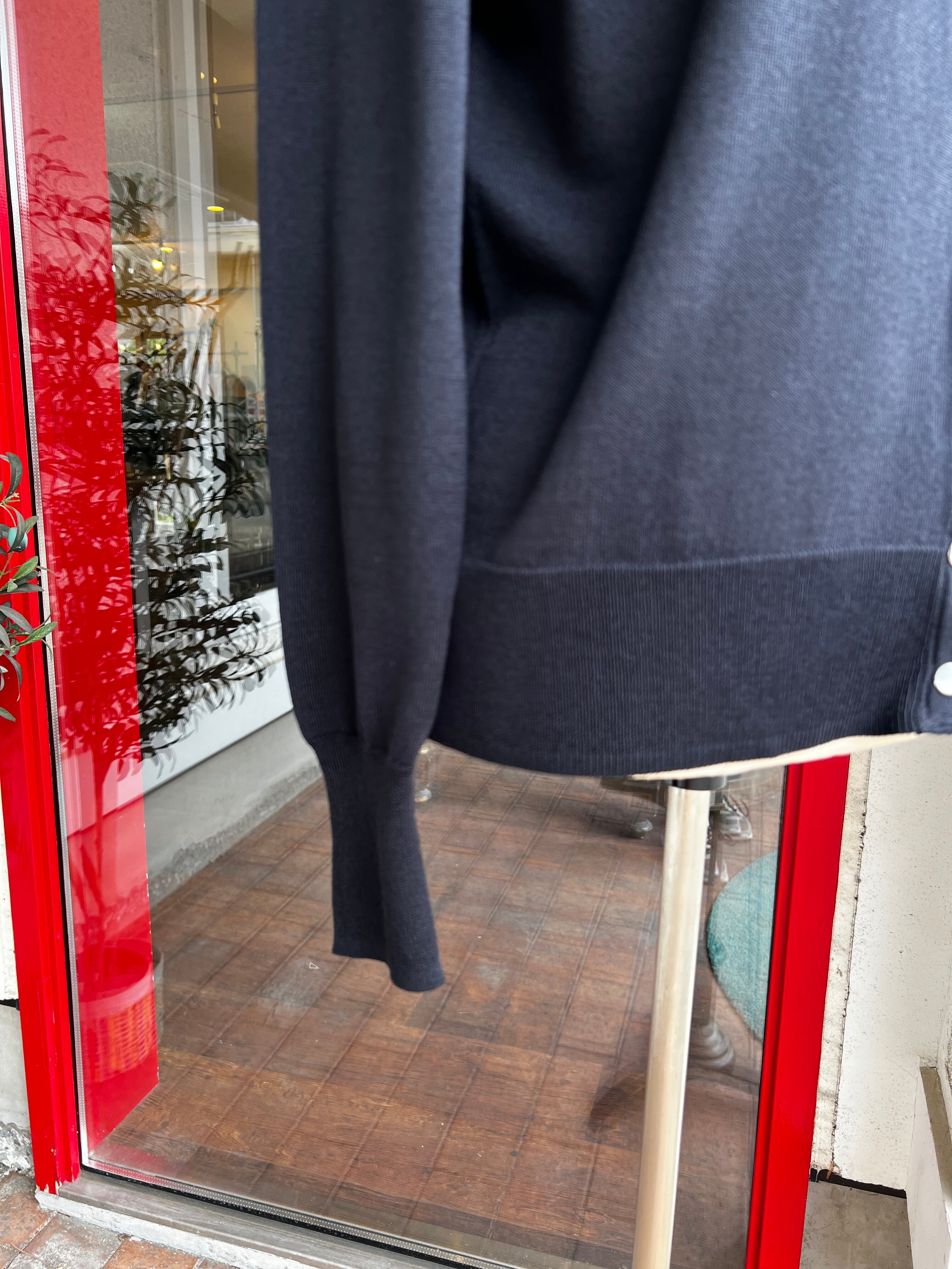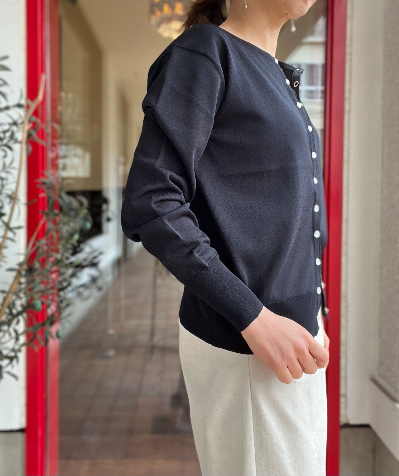 冷房対策の羽織としても、狭い感覚で並んだドット釦をしめて一枚着としても着て頂けます