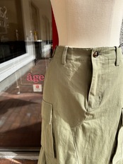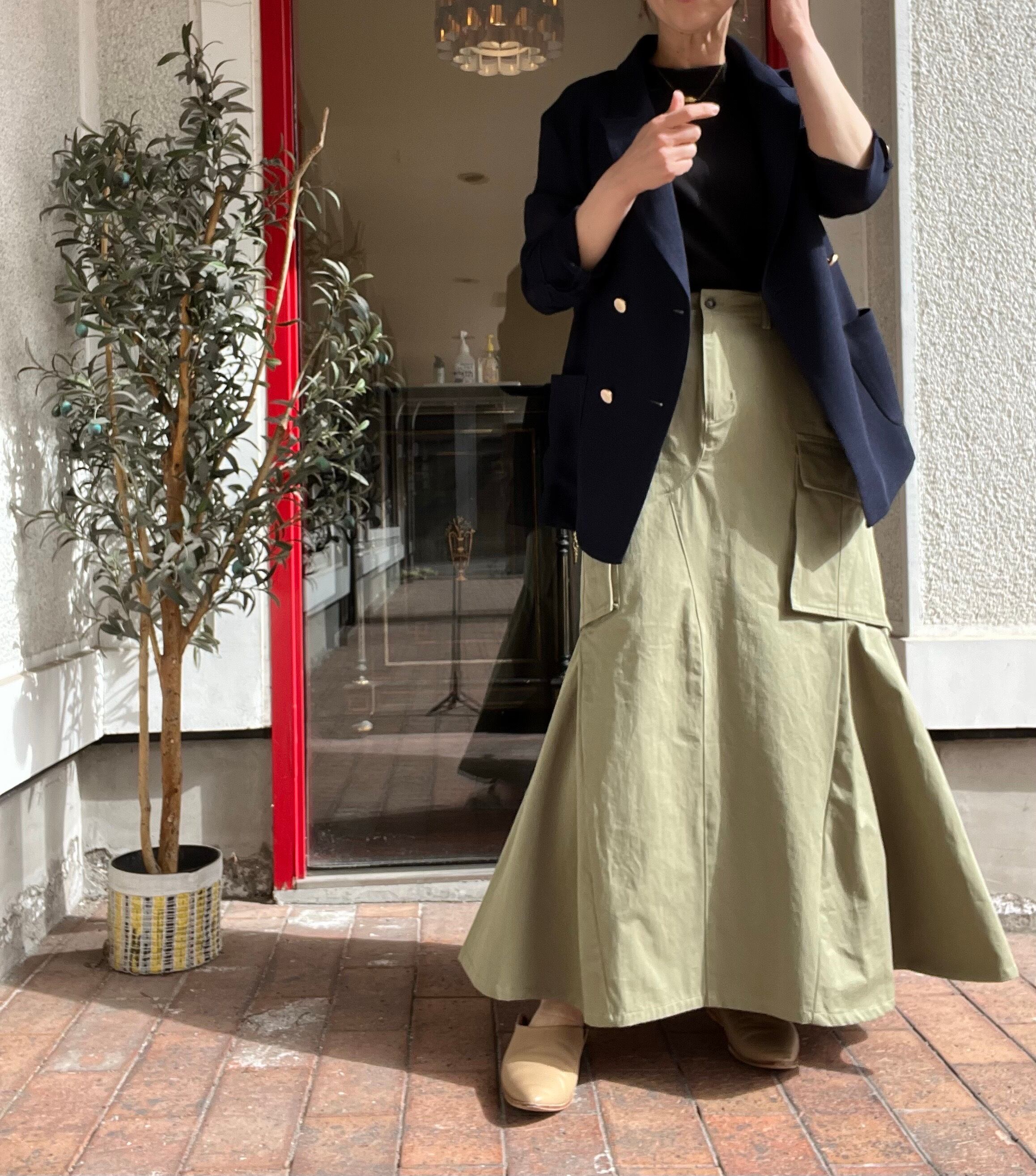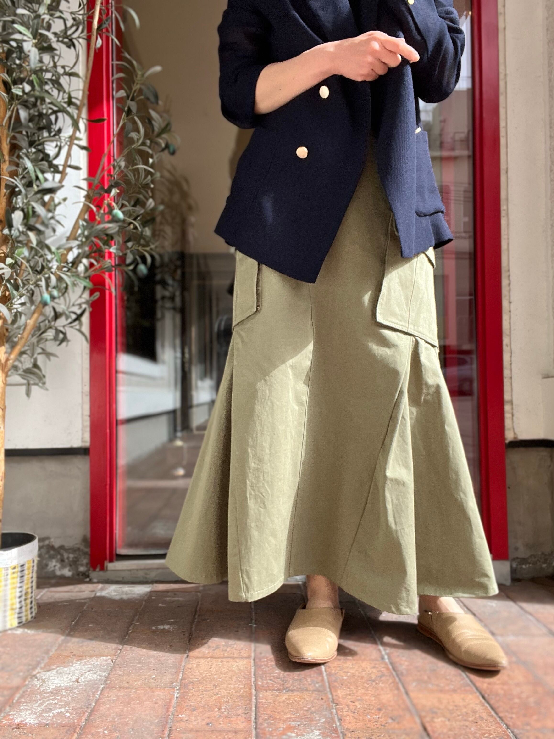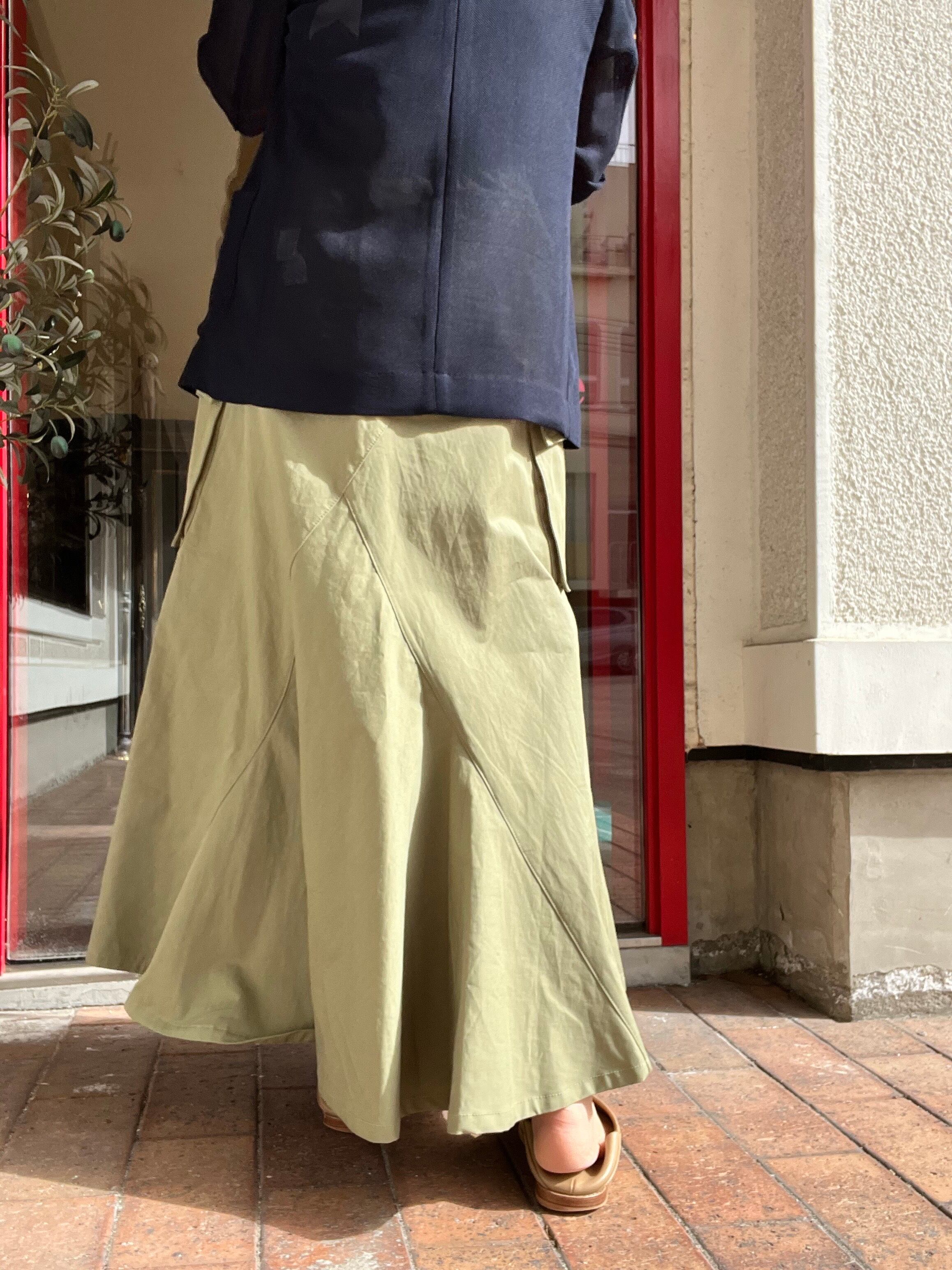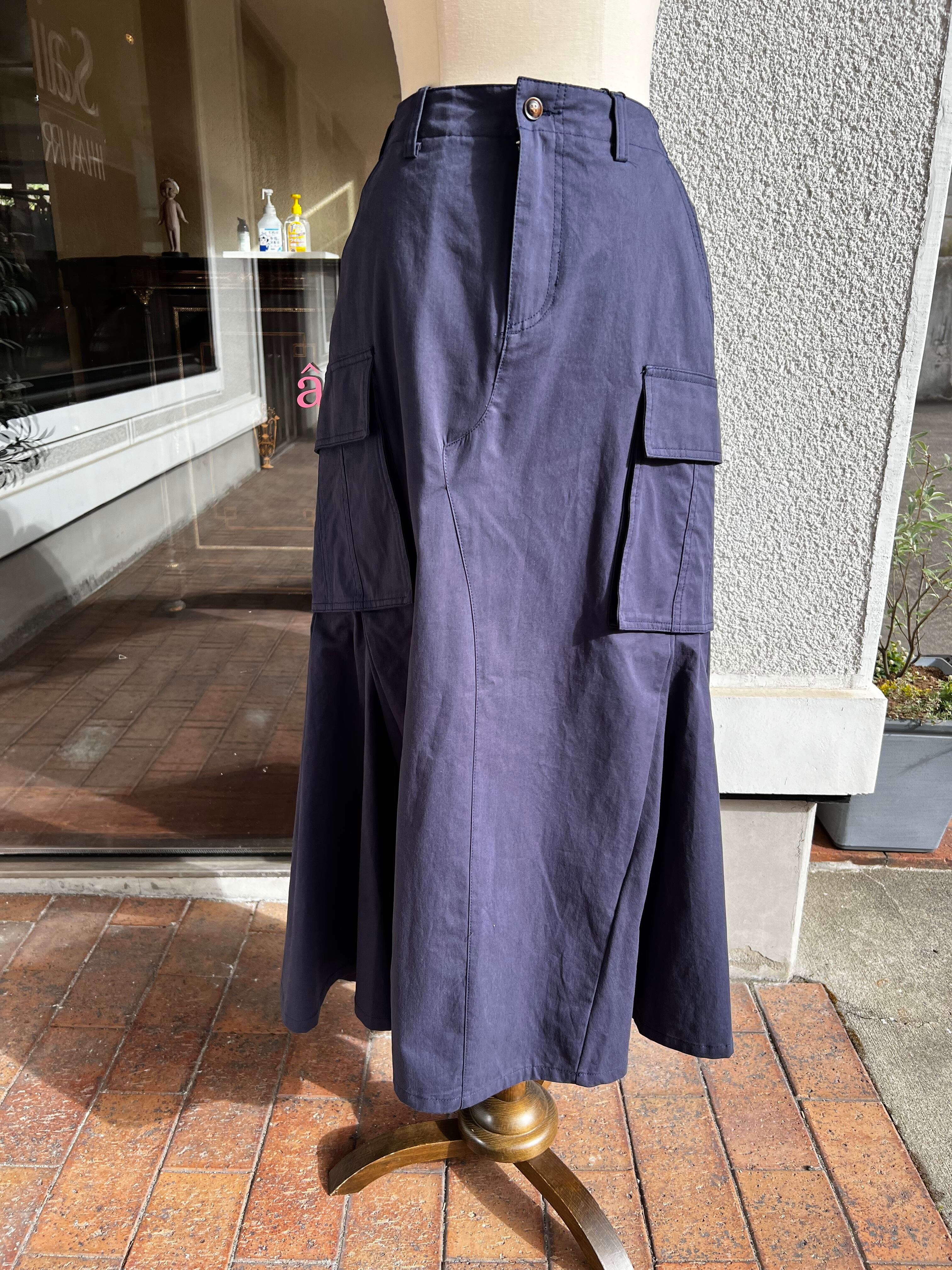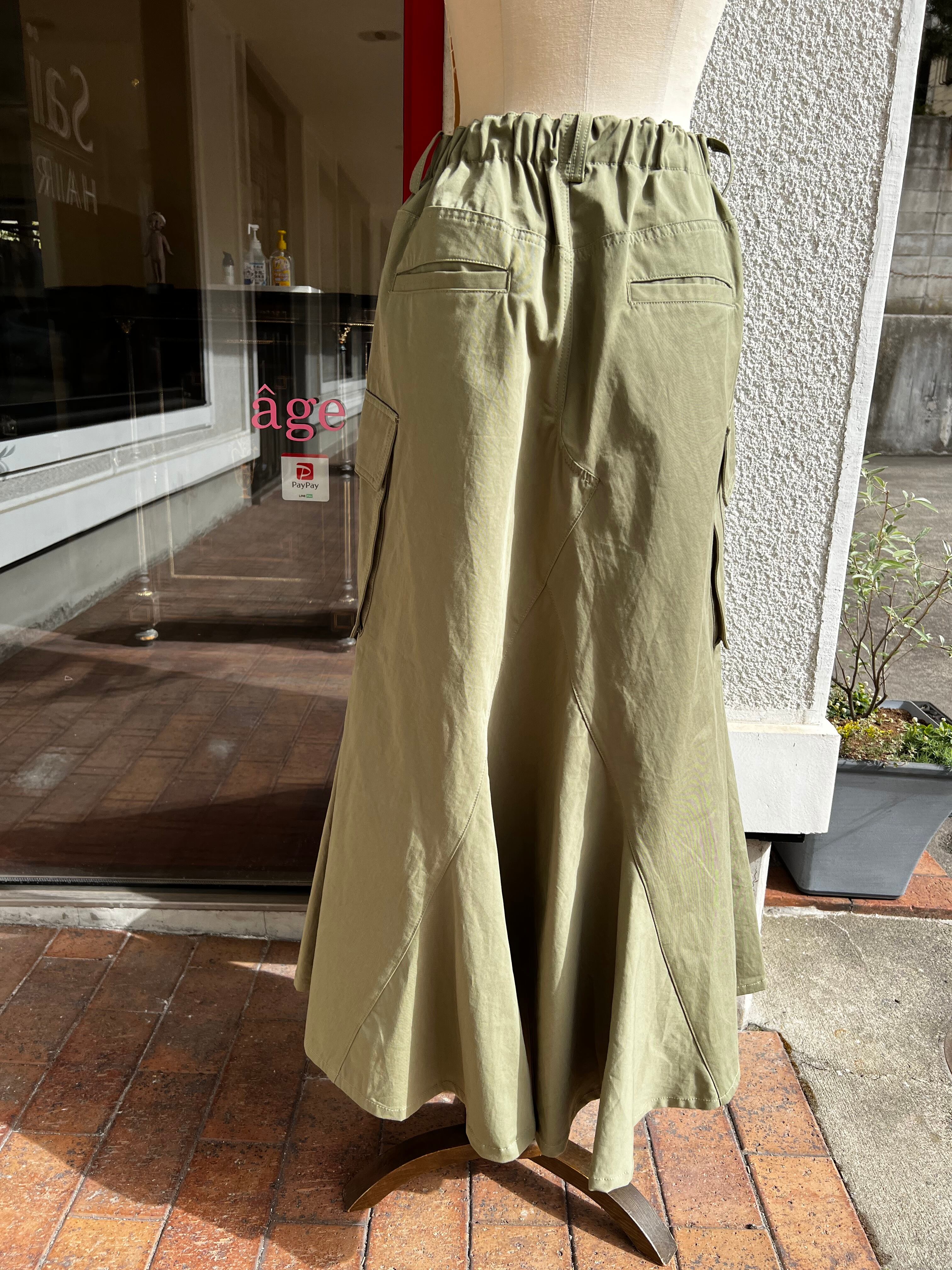 カーゴパンツの雰囲気と裾がふわっと広がるフレアラインが組み合わせられたマキシ丈スカート