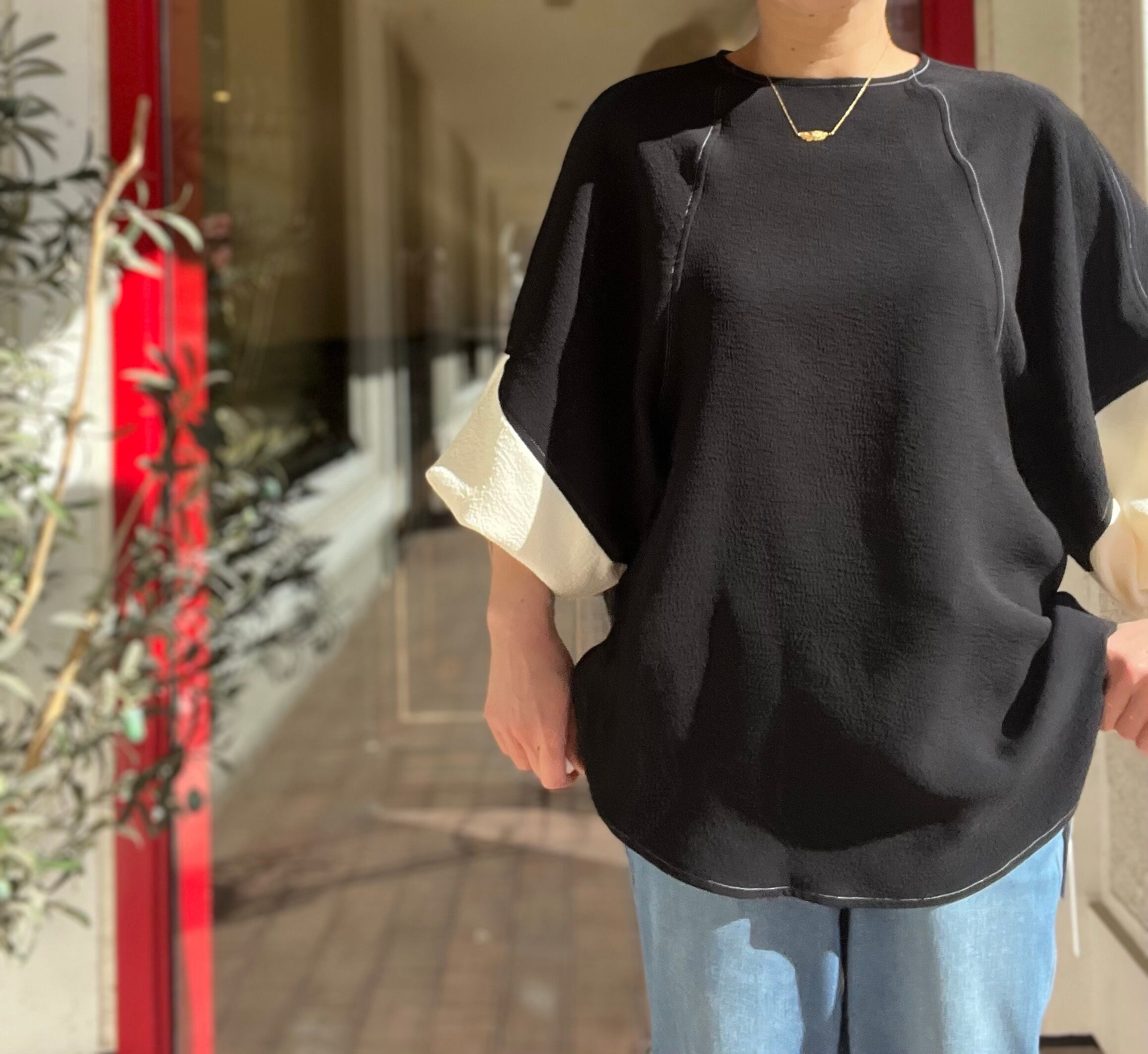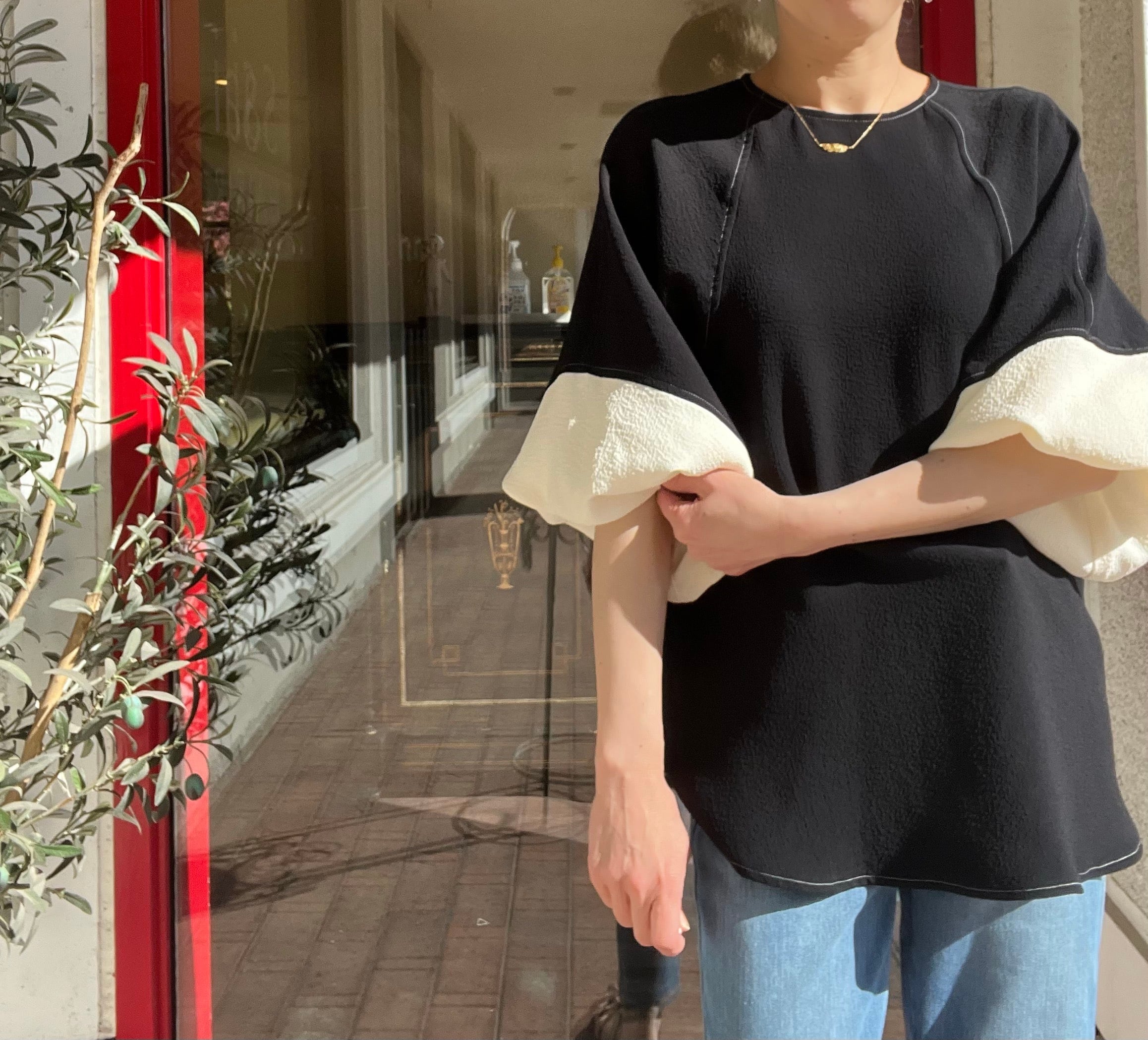 たっぷりと広がるバルーンスリーブは袖口にゴムが施されているので、袖のボリュームを保てます