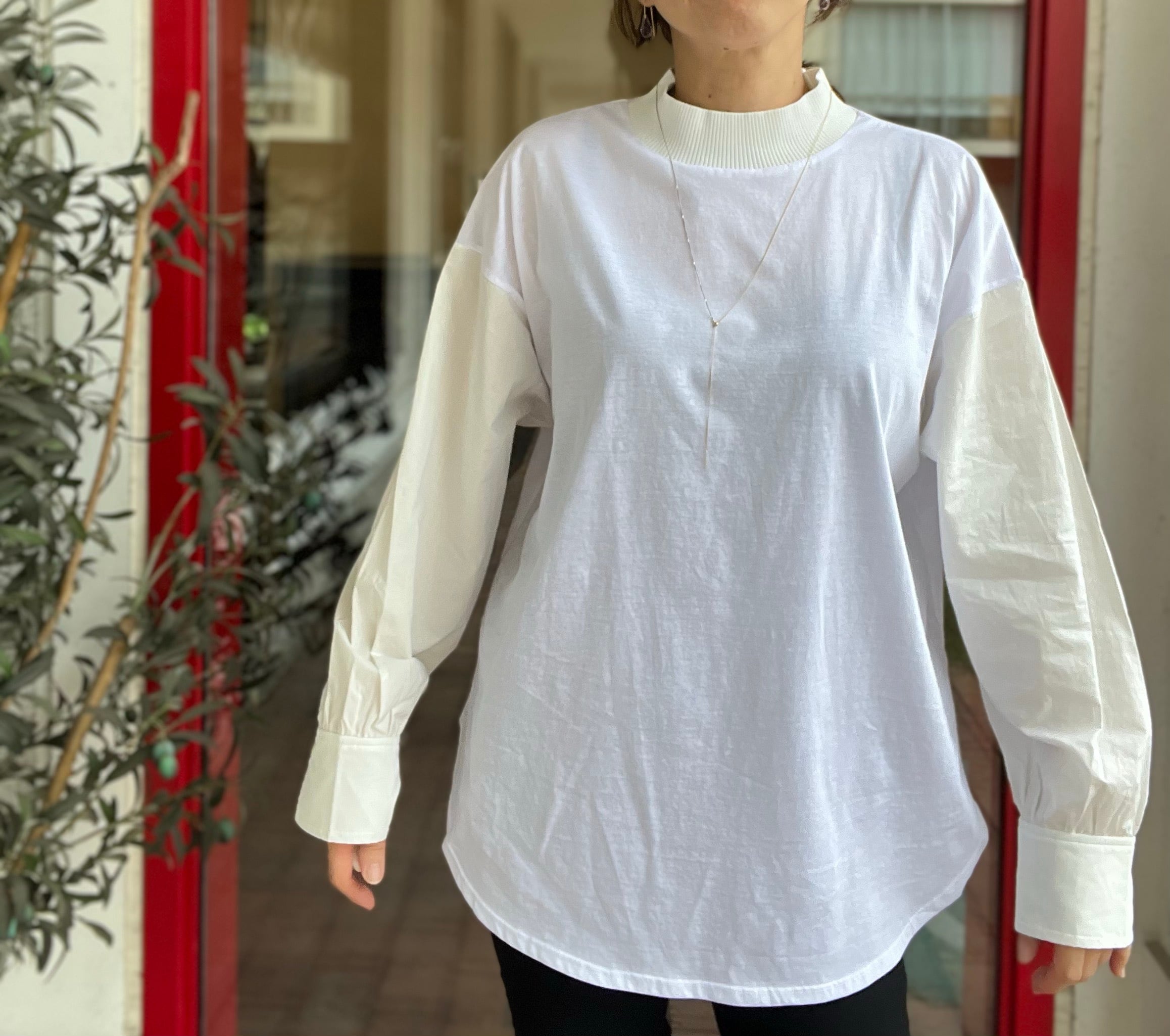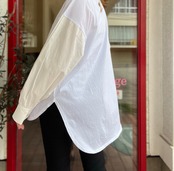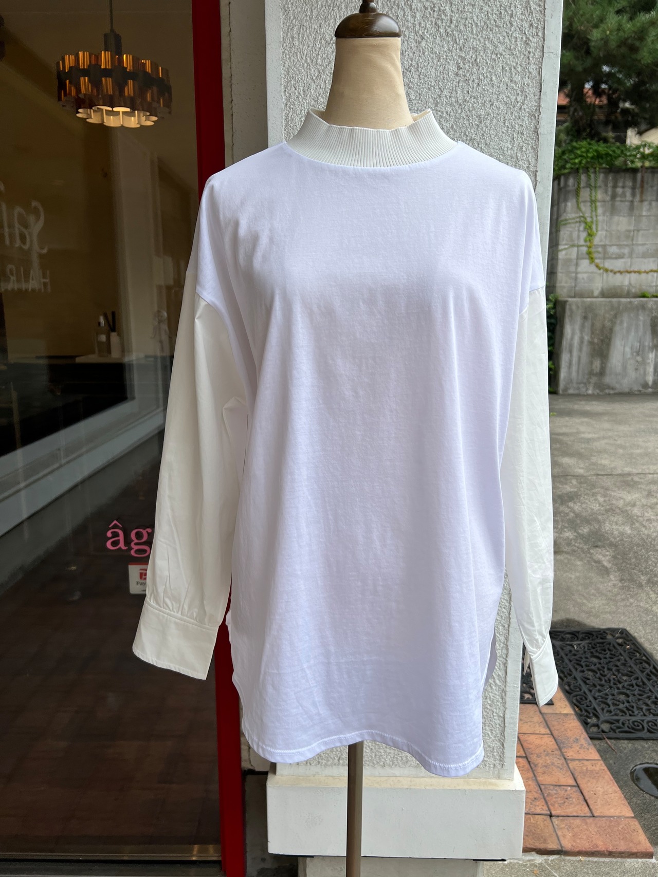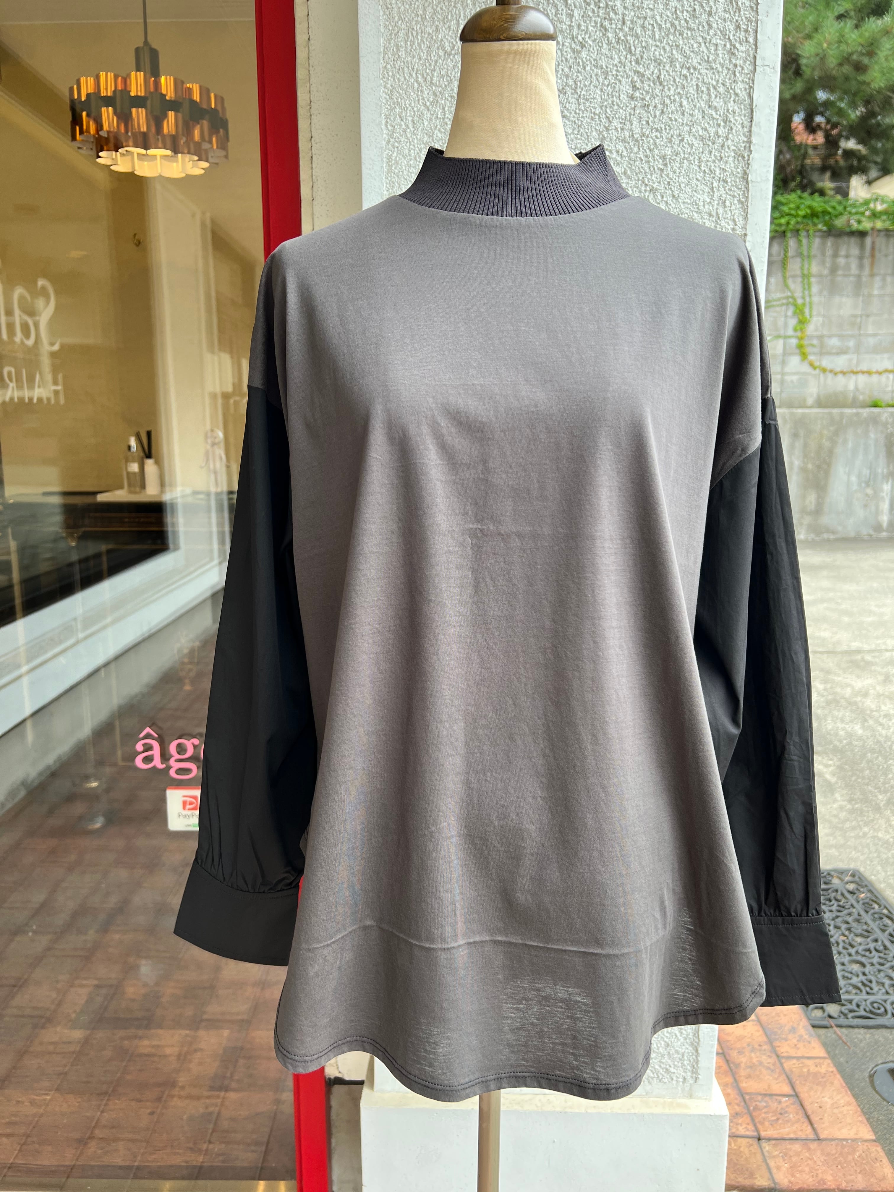 袖は布帛生地でカフス仕立て、身頃はシルケット天竺を使用した光沢感があり