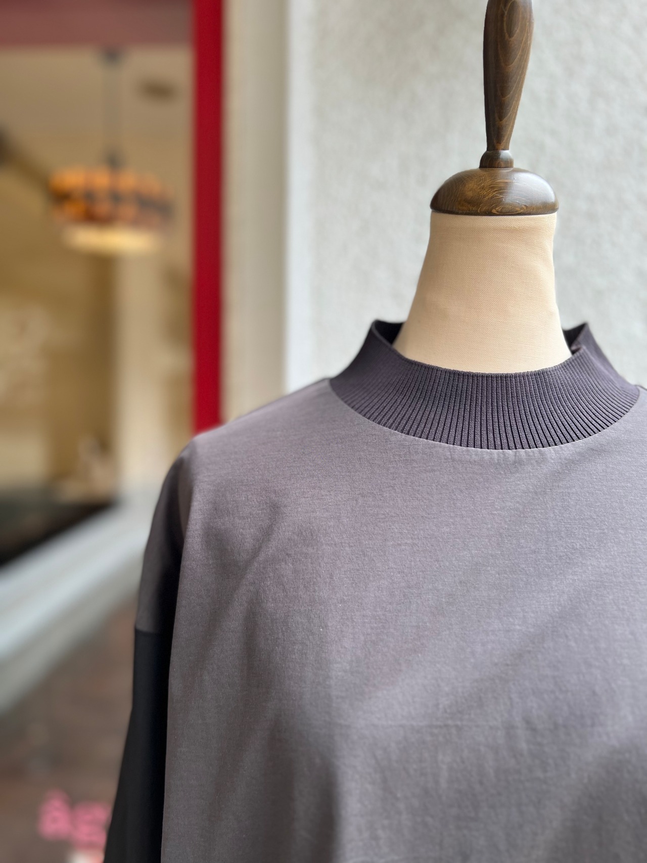 ゆったりとしたリラックスシルエットの異素材組み合わせハイネックプルオーバー