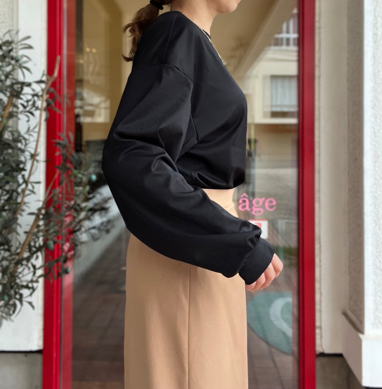 横に広がるネックラインとボリュームのあるスリーブデザインは