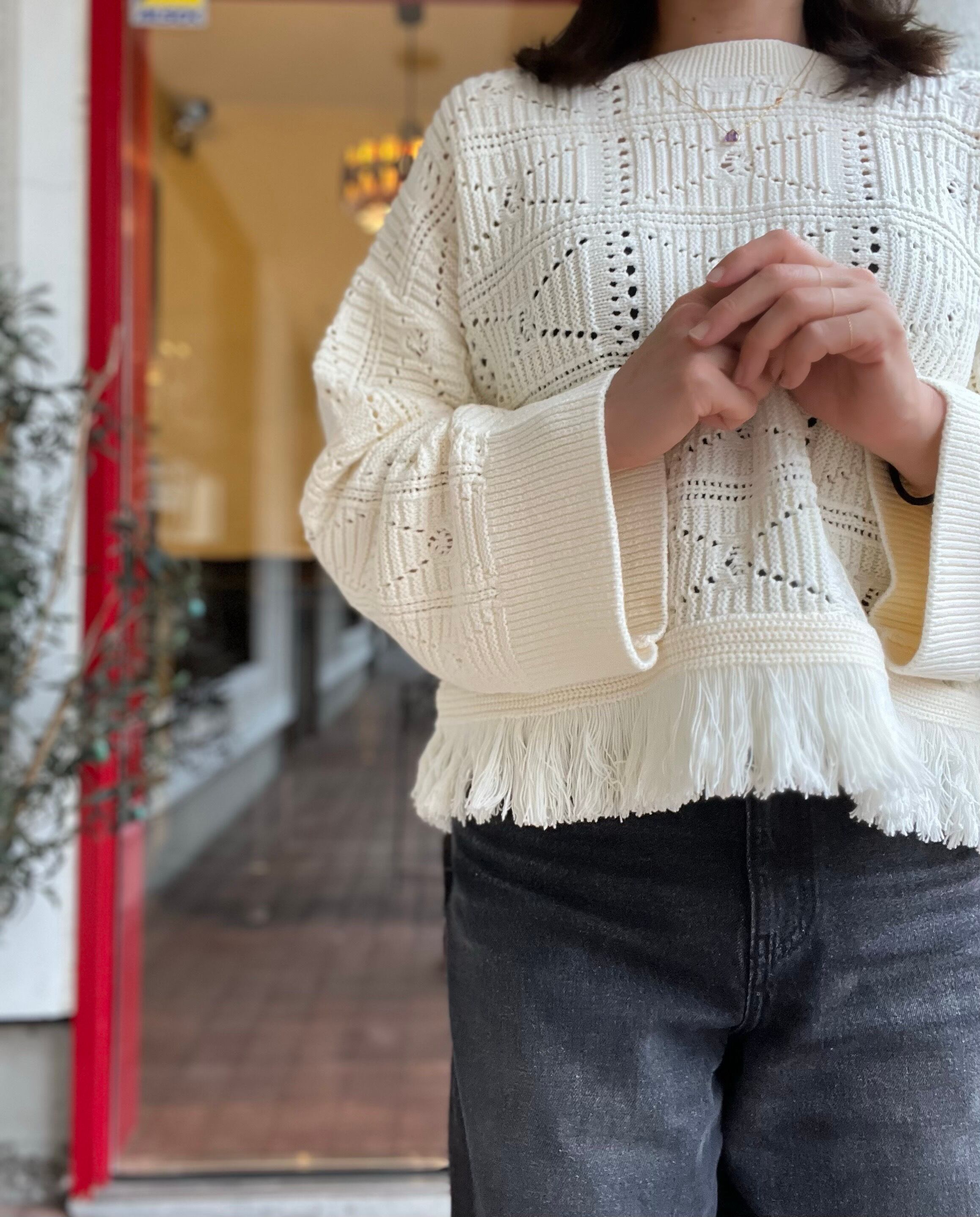 裾のフリンジが目を惹くバルキーニット