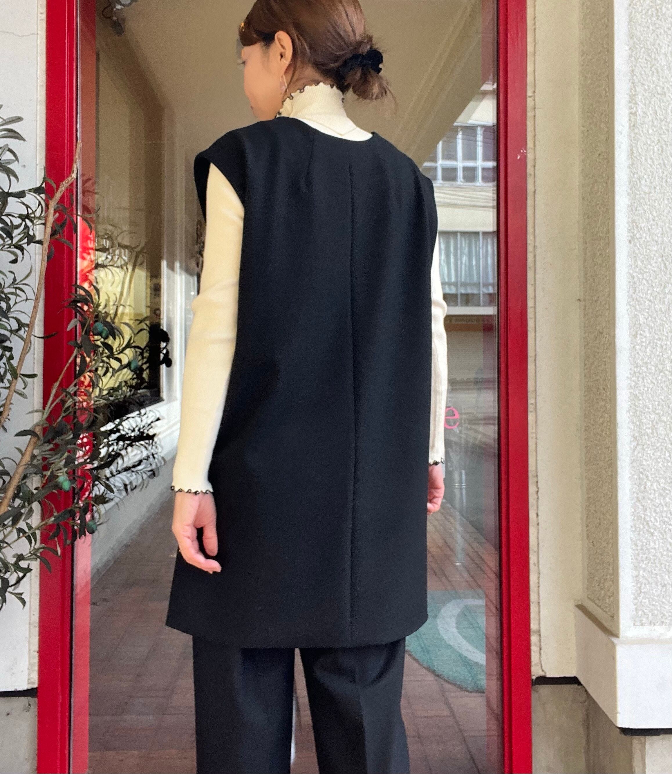 適度な開きのV開きはインナーをコーディネートしやすく、ブラウスやタートル