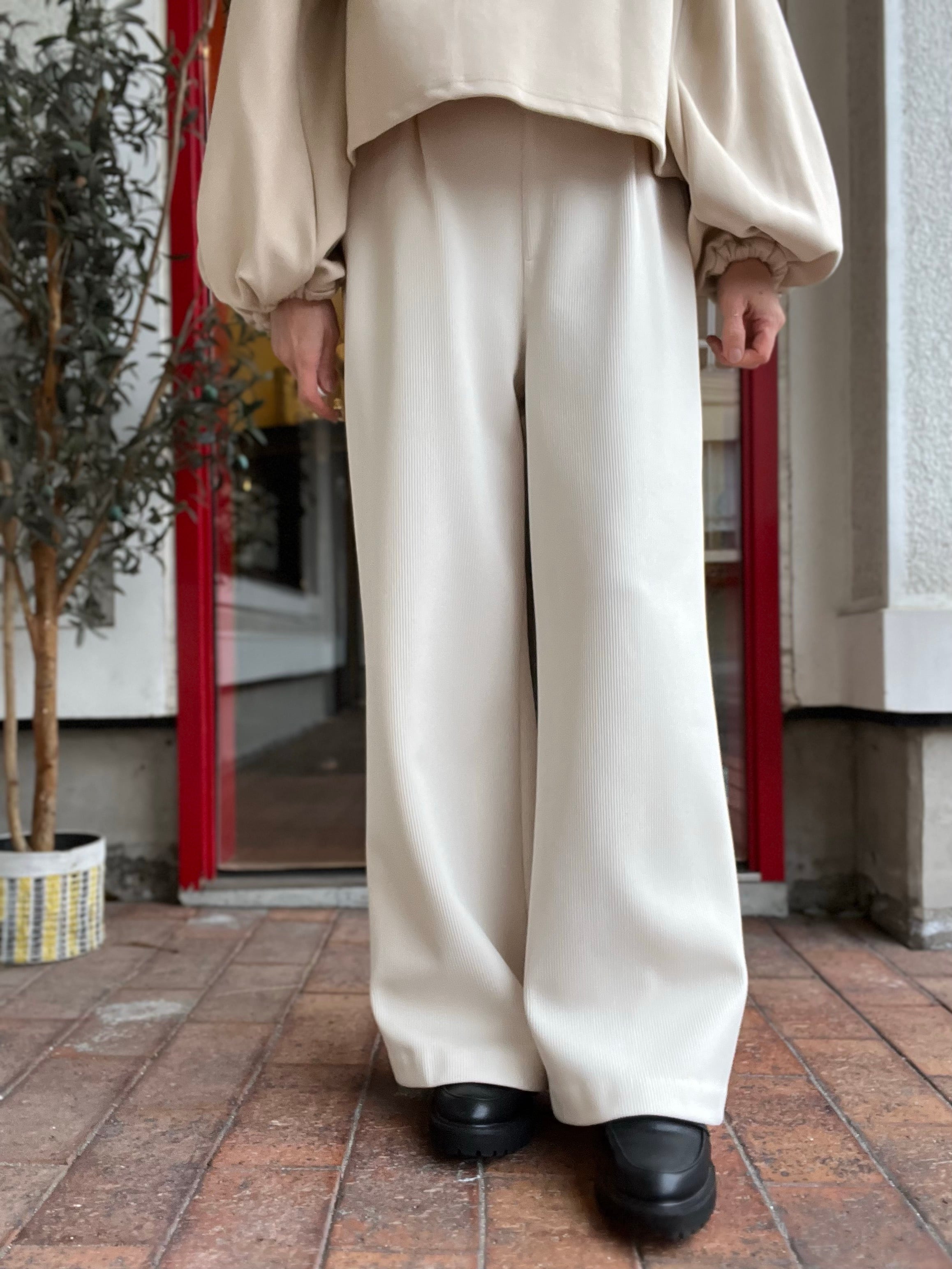 微光沢感、凹凸のある生地の裏起毛ワイドパンツ