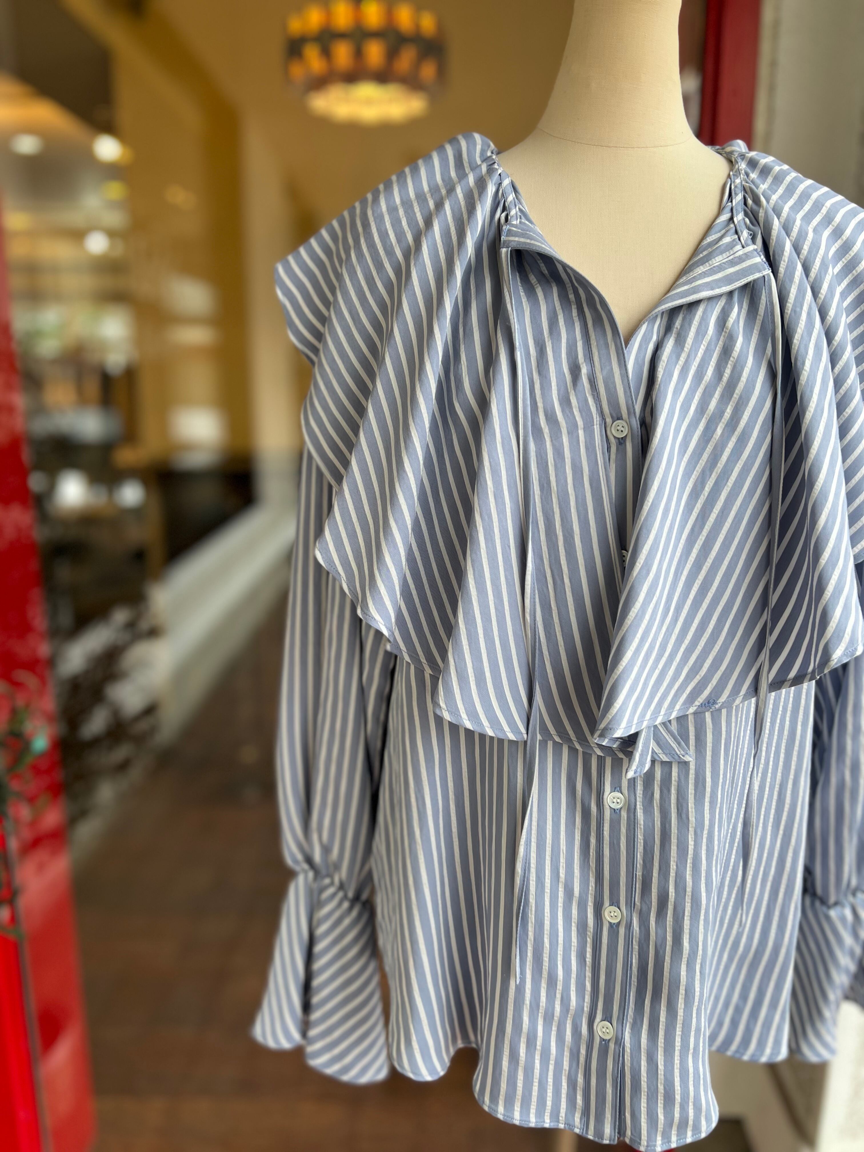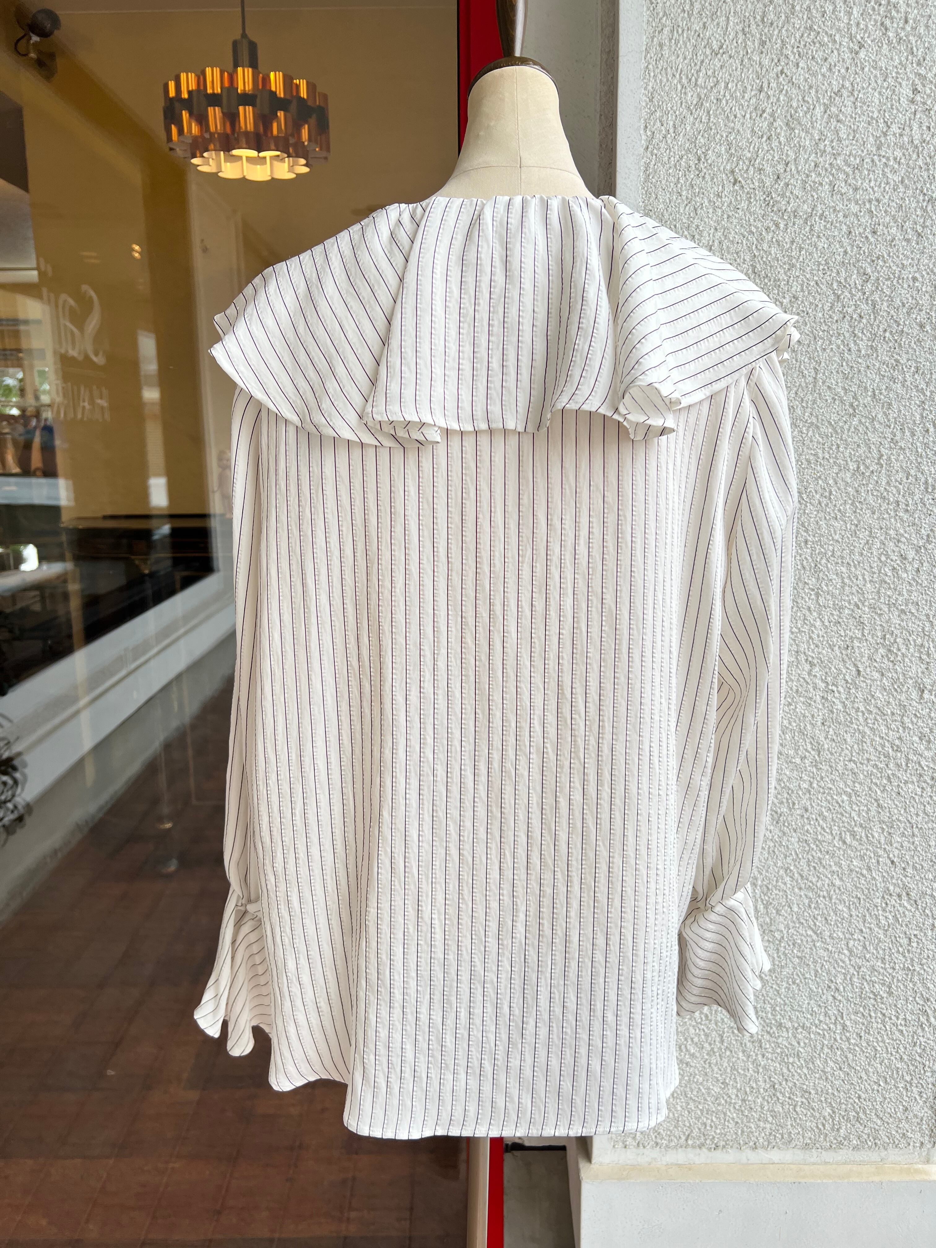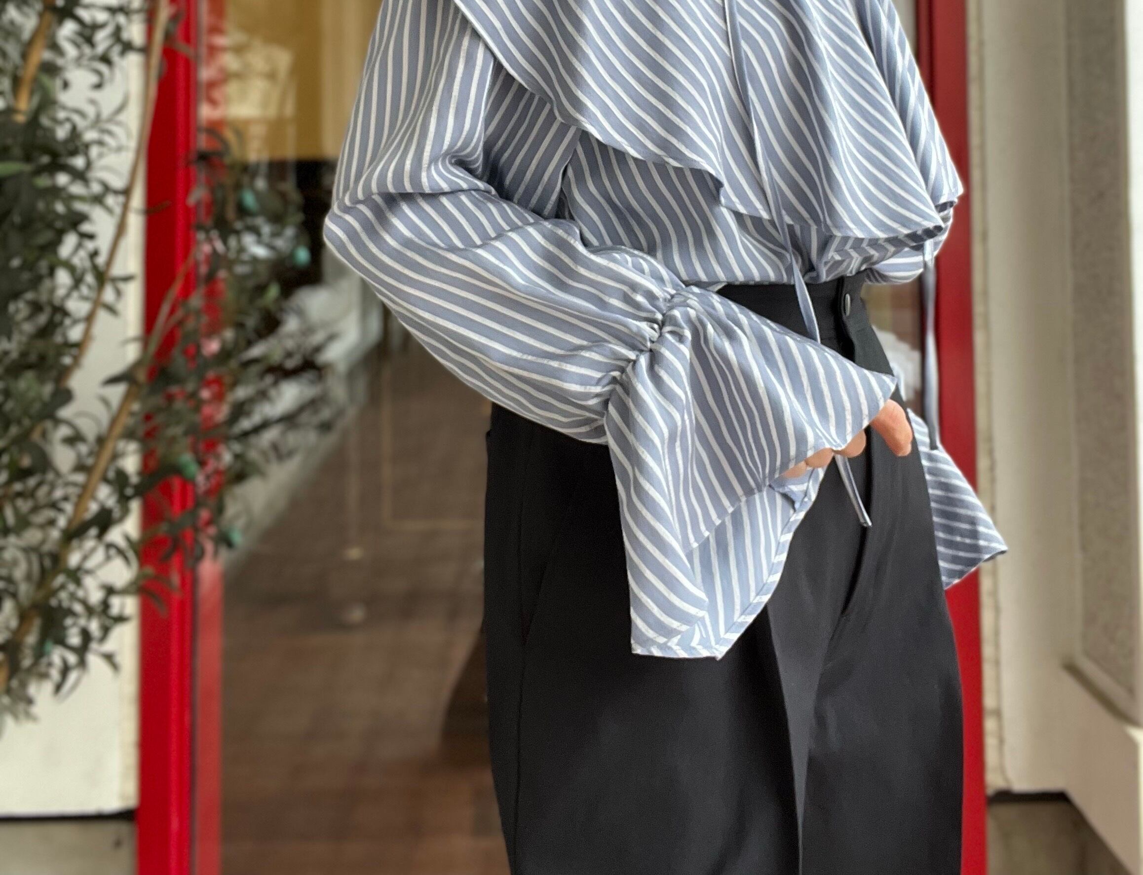 ラッフルカラーとキャンディースリーブが華やかな印象のブラウス
