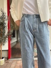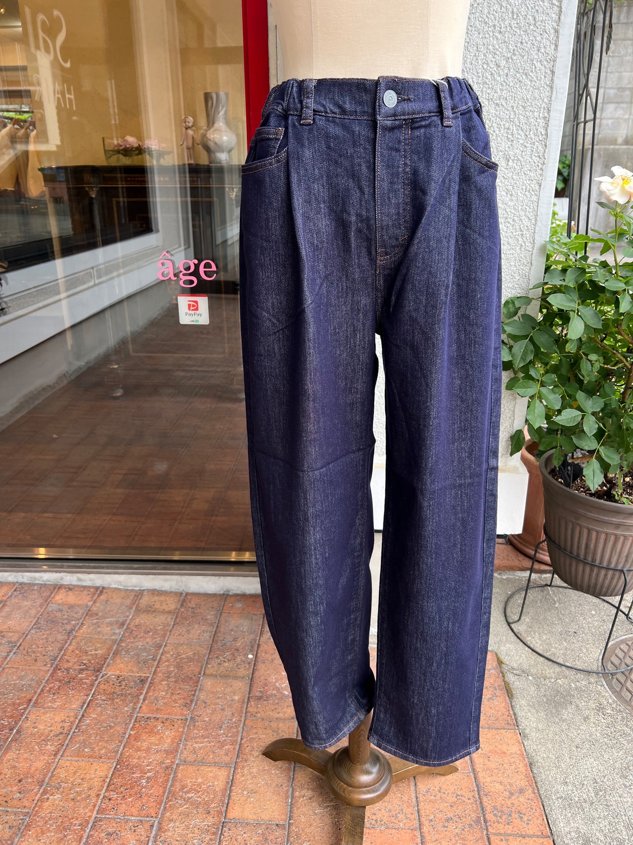 5ポケットのデニムディテールに、フロントタックをとり腰回りにボリュームを持たせ立体的なカーブラインを強調したシルエット