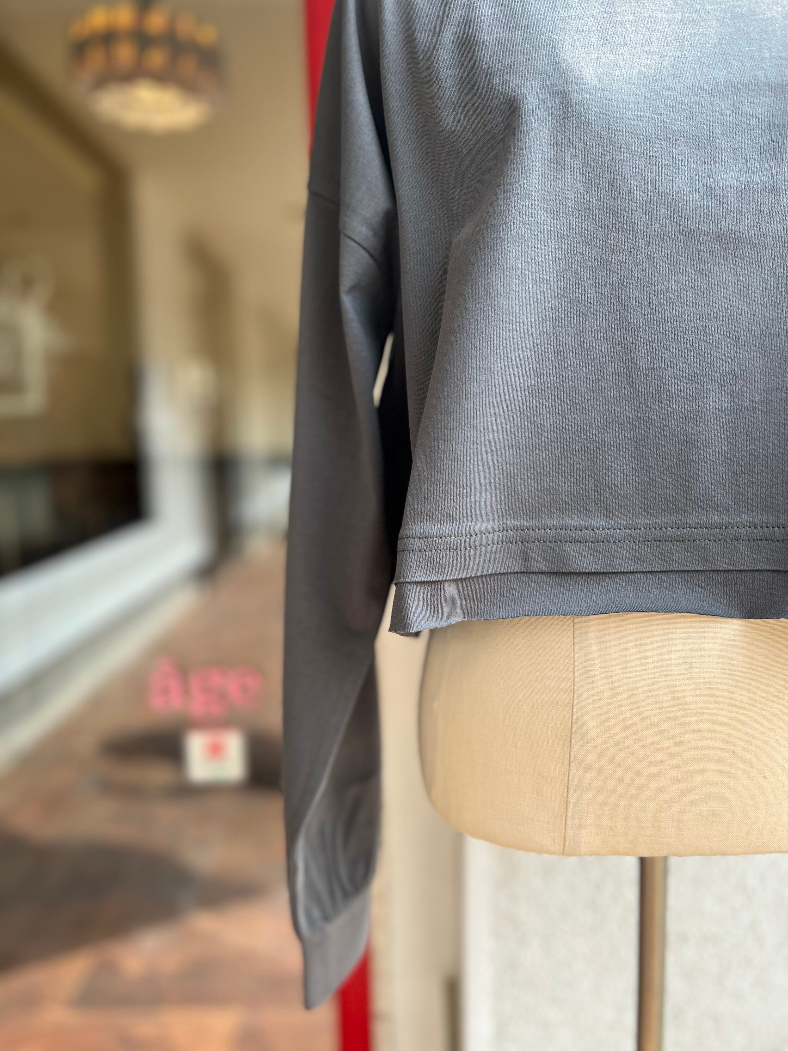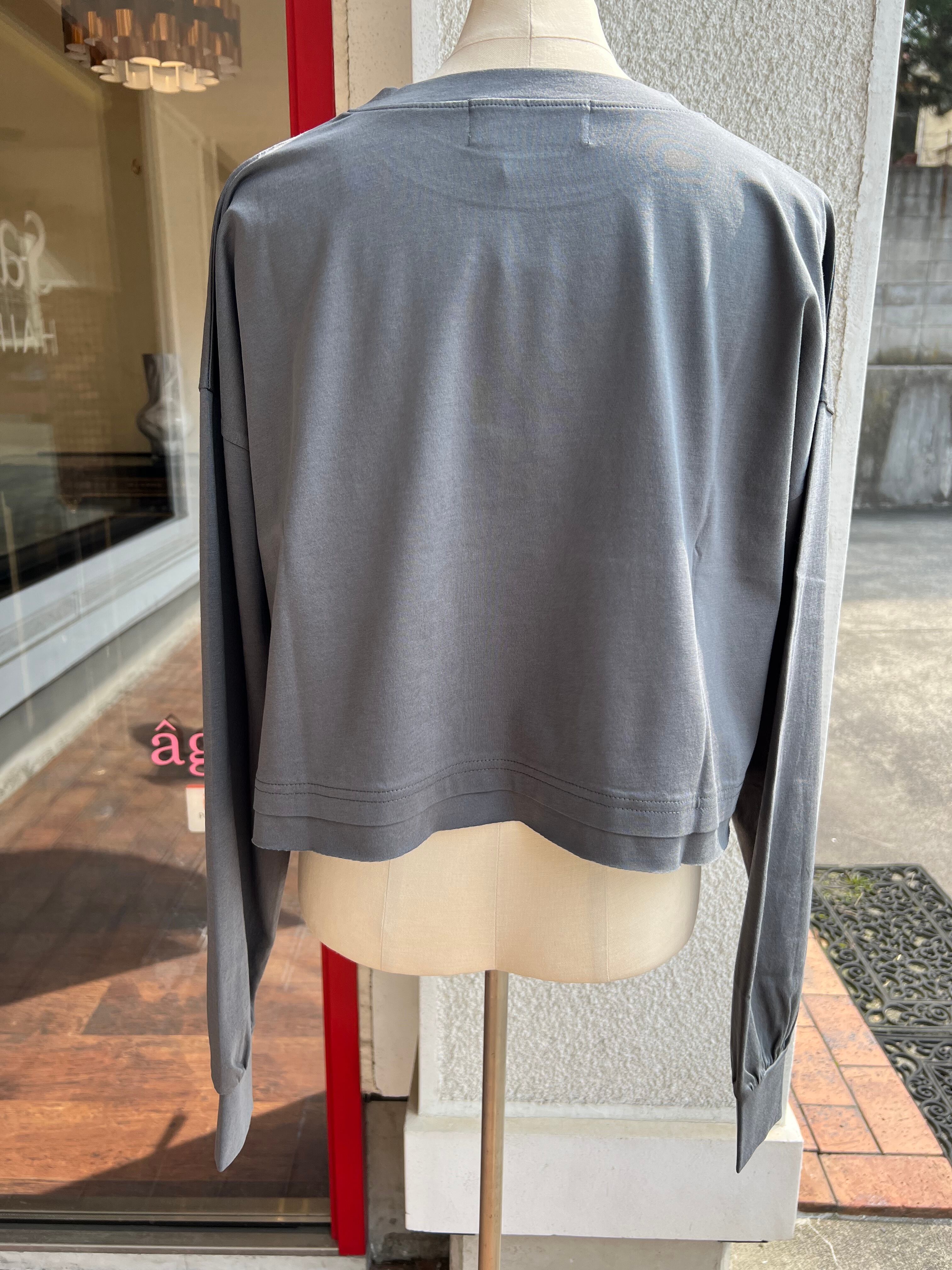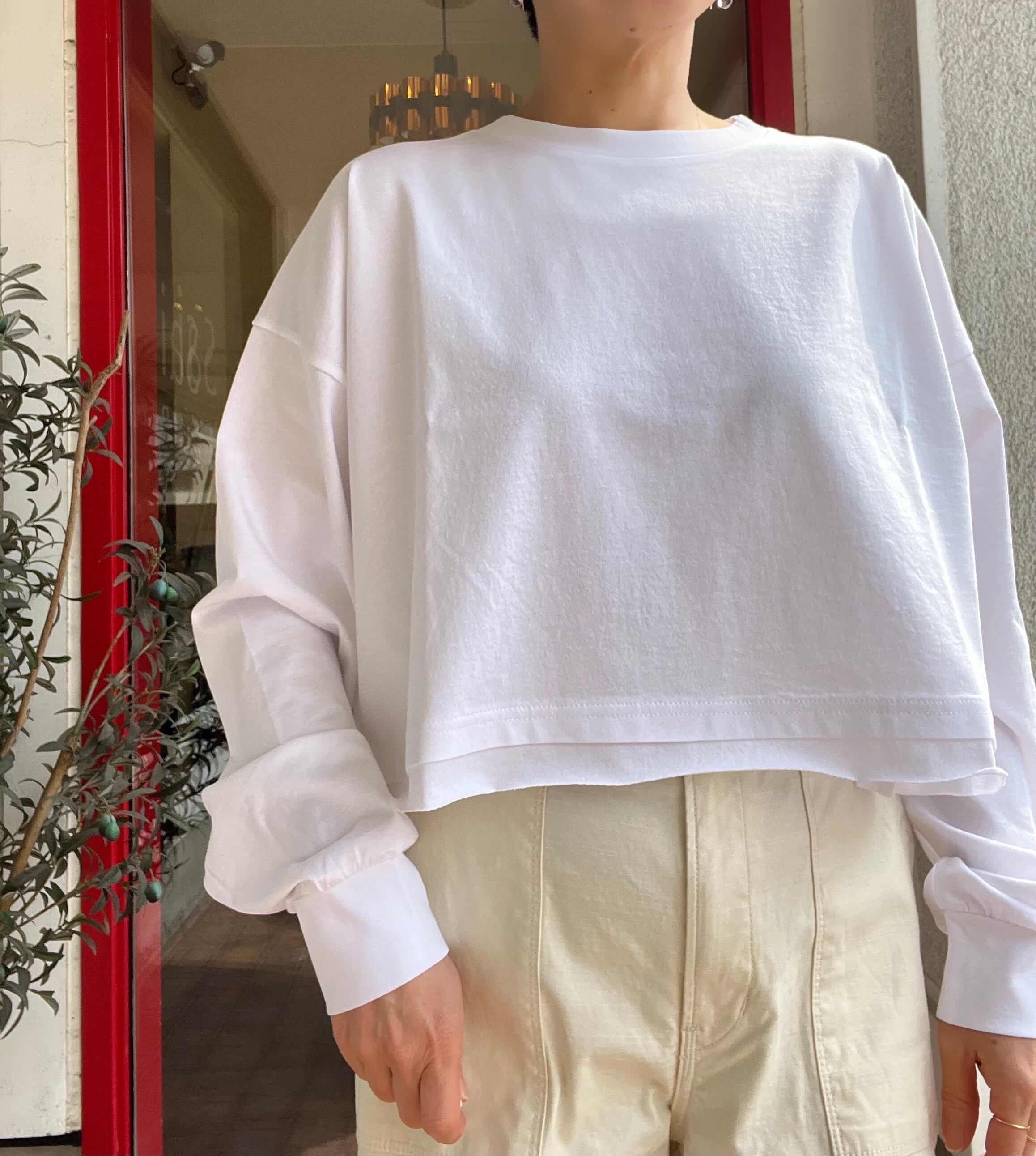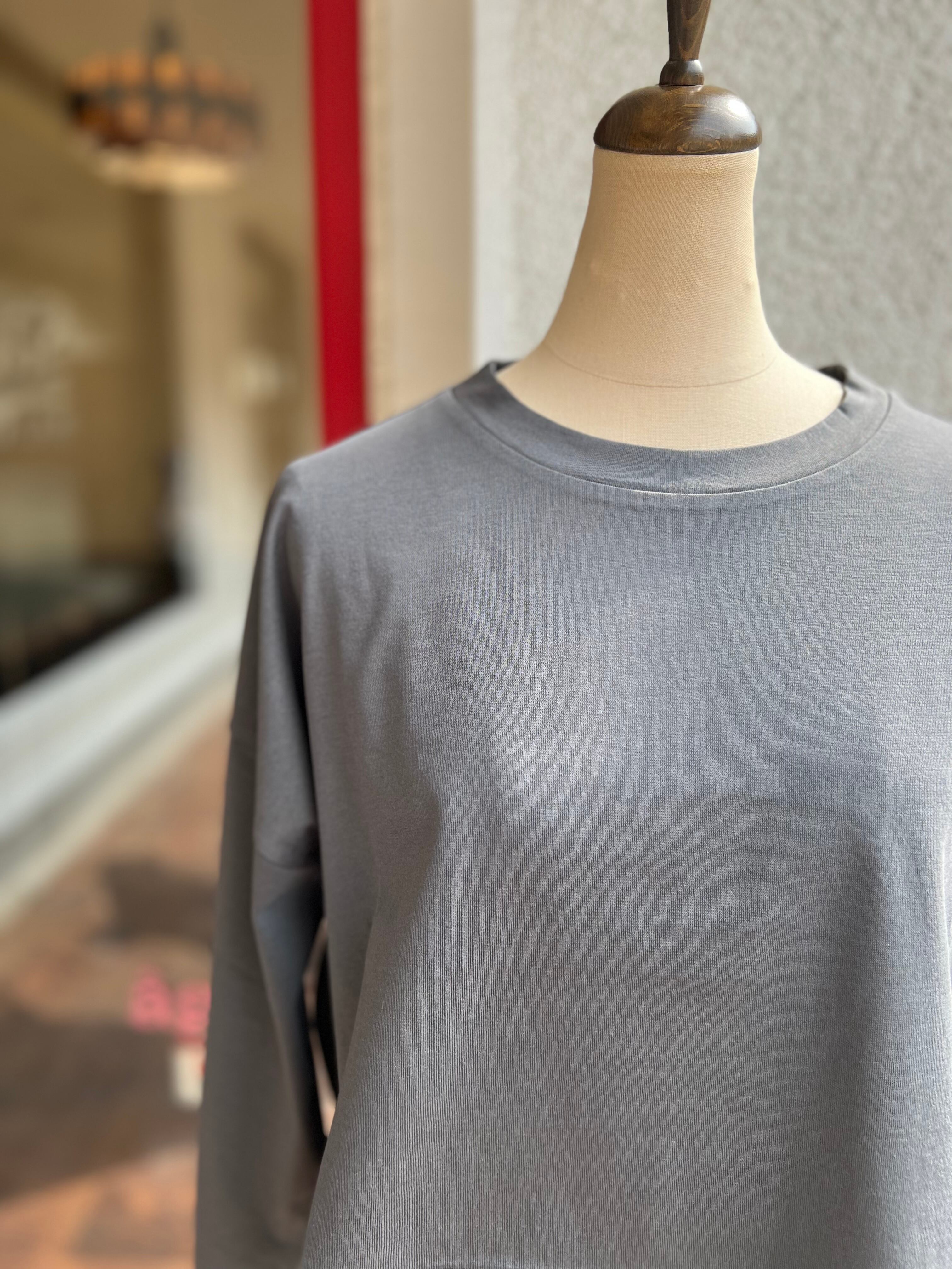 ドロップショルダーにほど良く詰まったクルーネック、袖はカフス仕立てでたくし上げても止まりが良く、滑らかな肌触りです