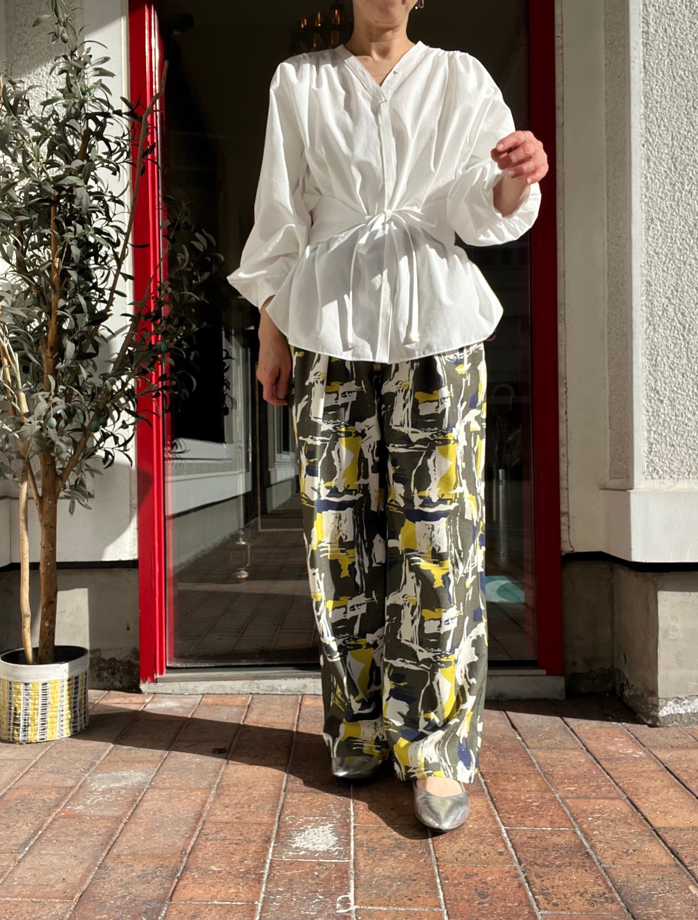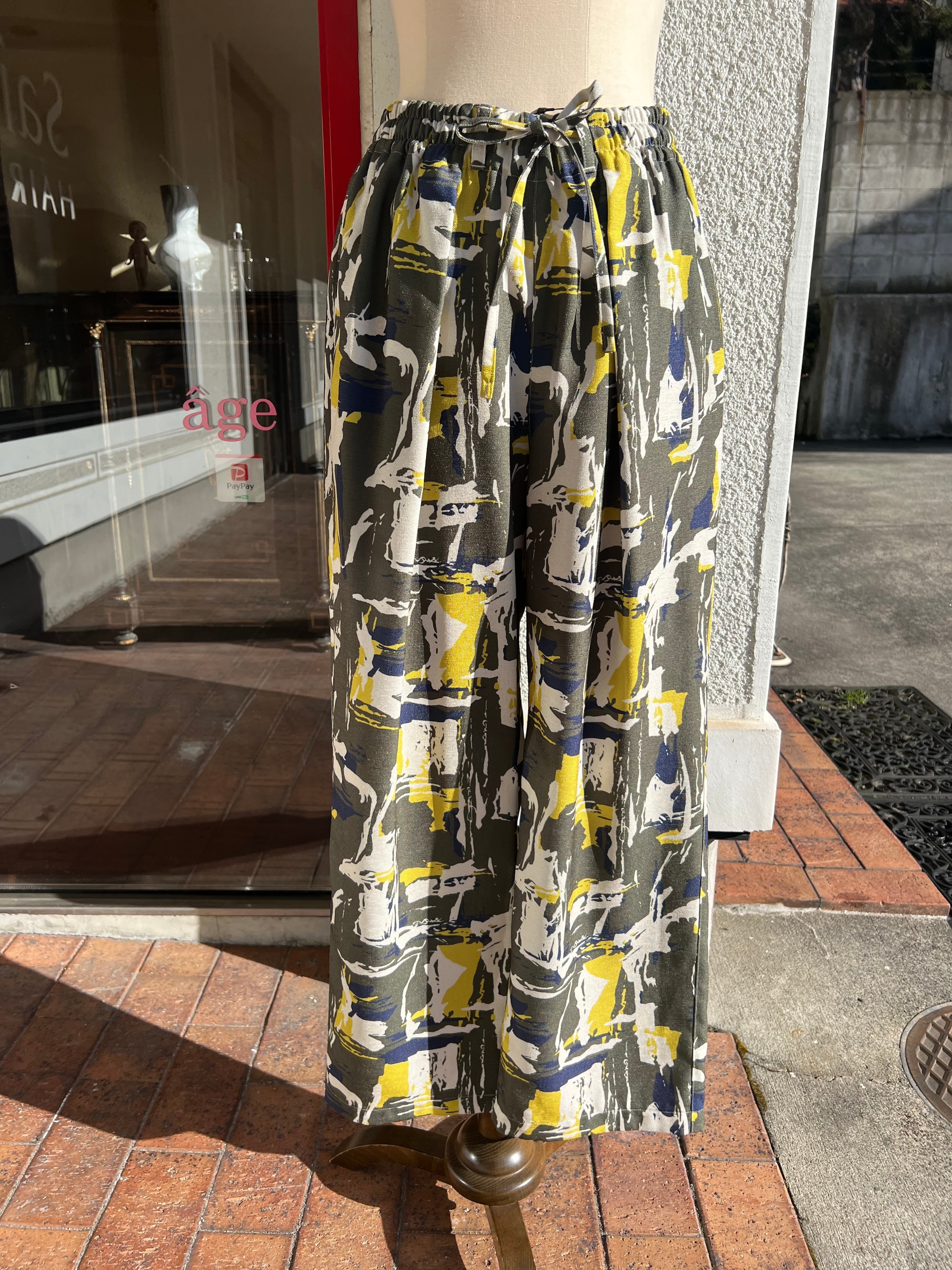 ポリエステルブッチャーに幾何学のペイントをプリントしたワイドパンツ