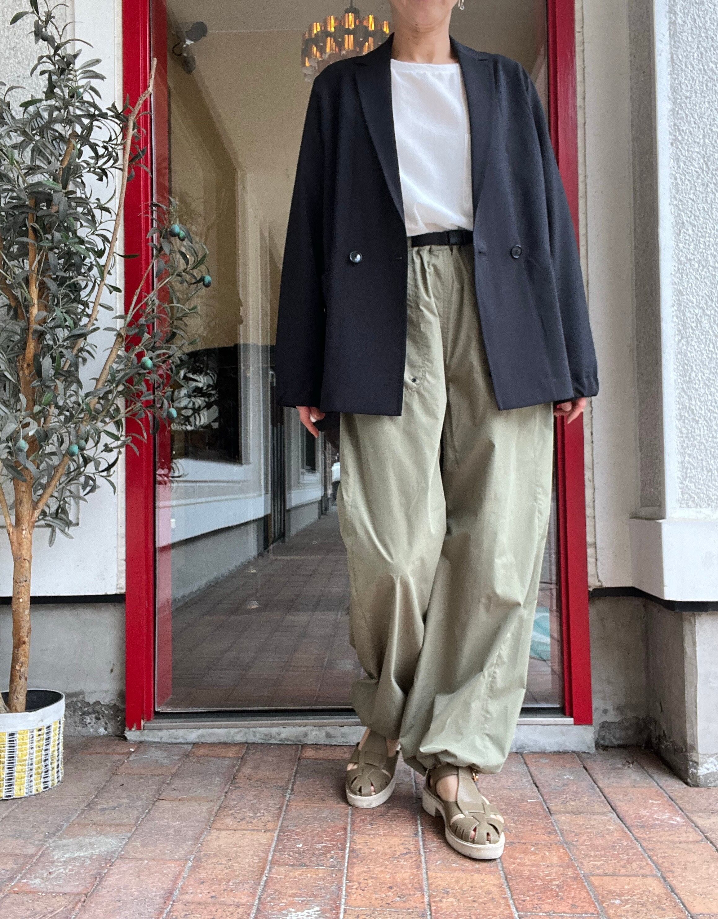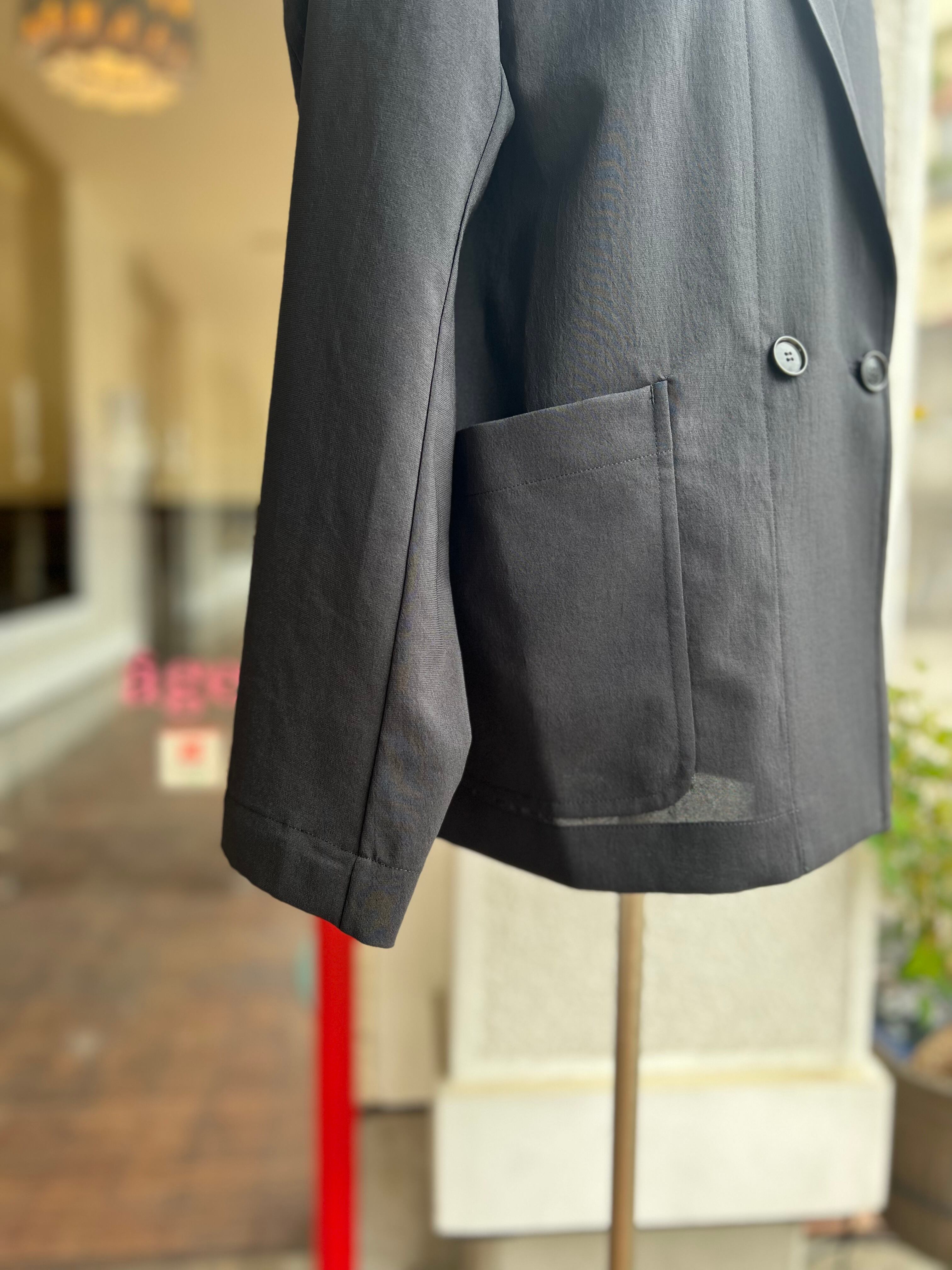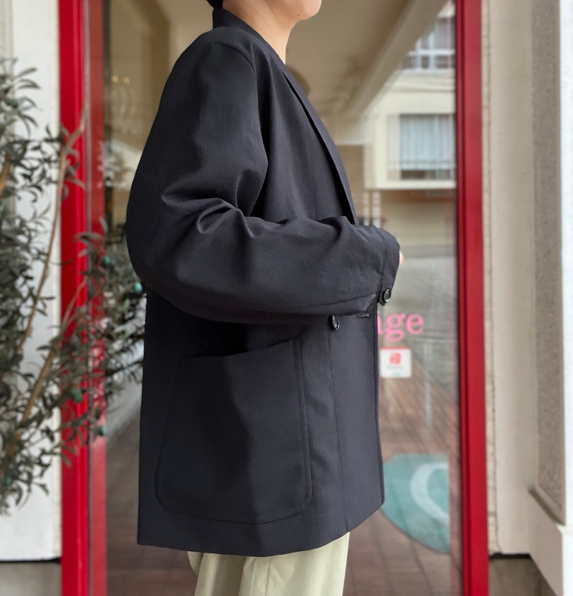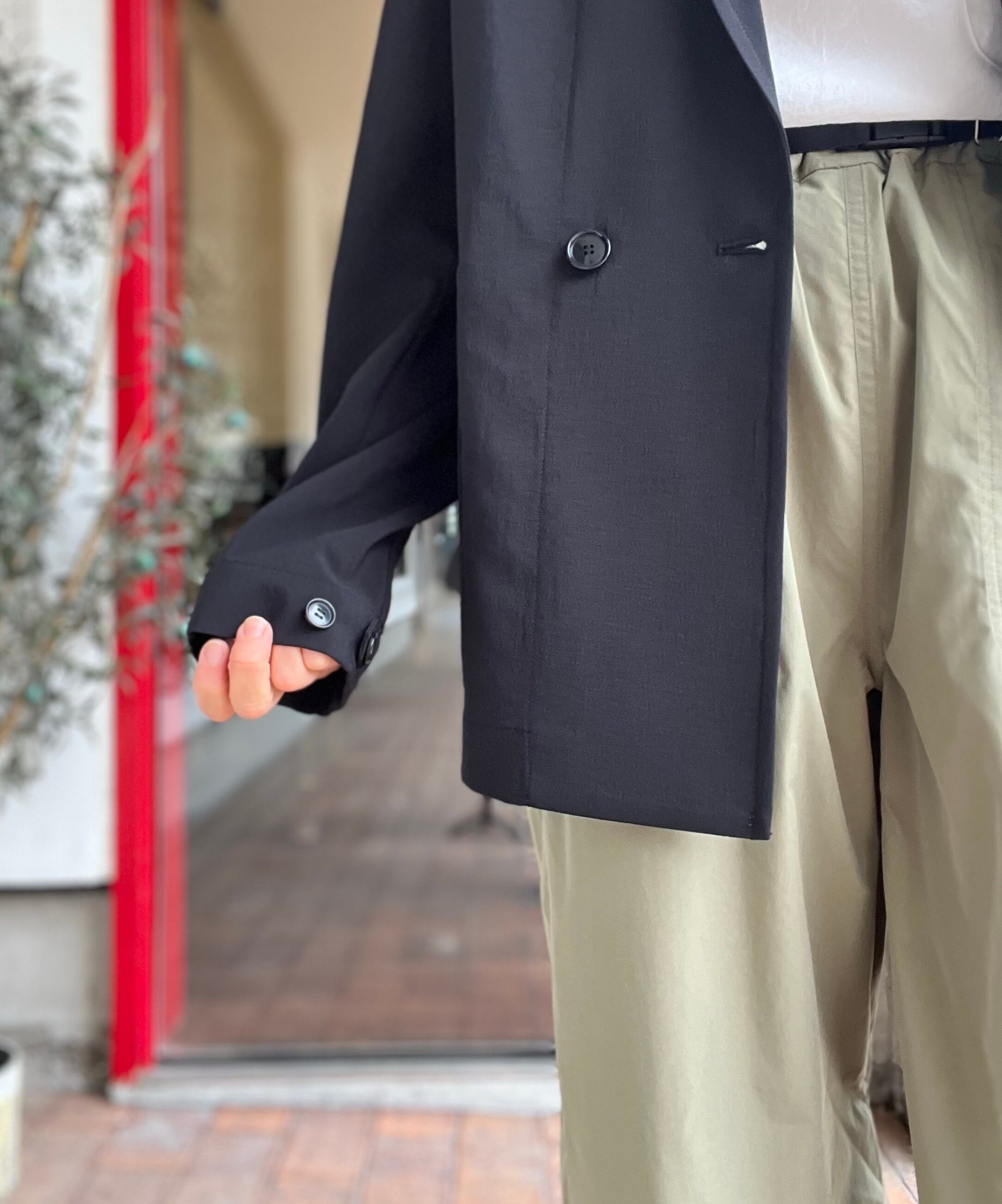ダブルの合わせが深くないので、ボタンを外すとシングル仕立てのような雰囲気で着て頂け