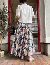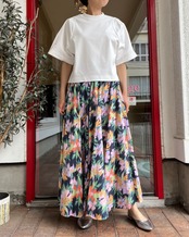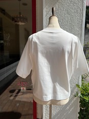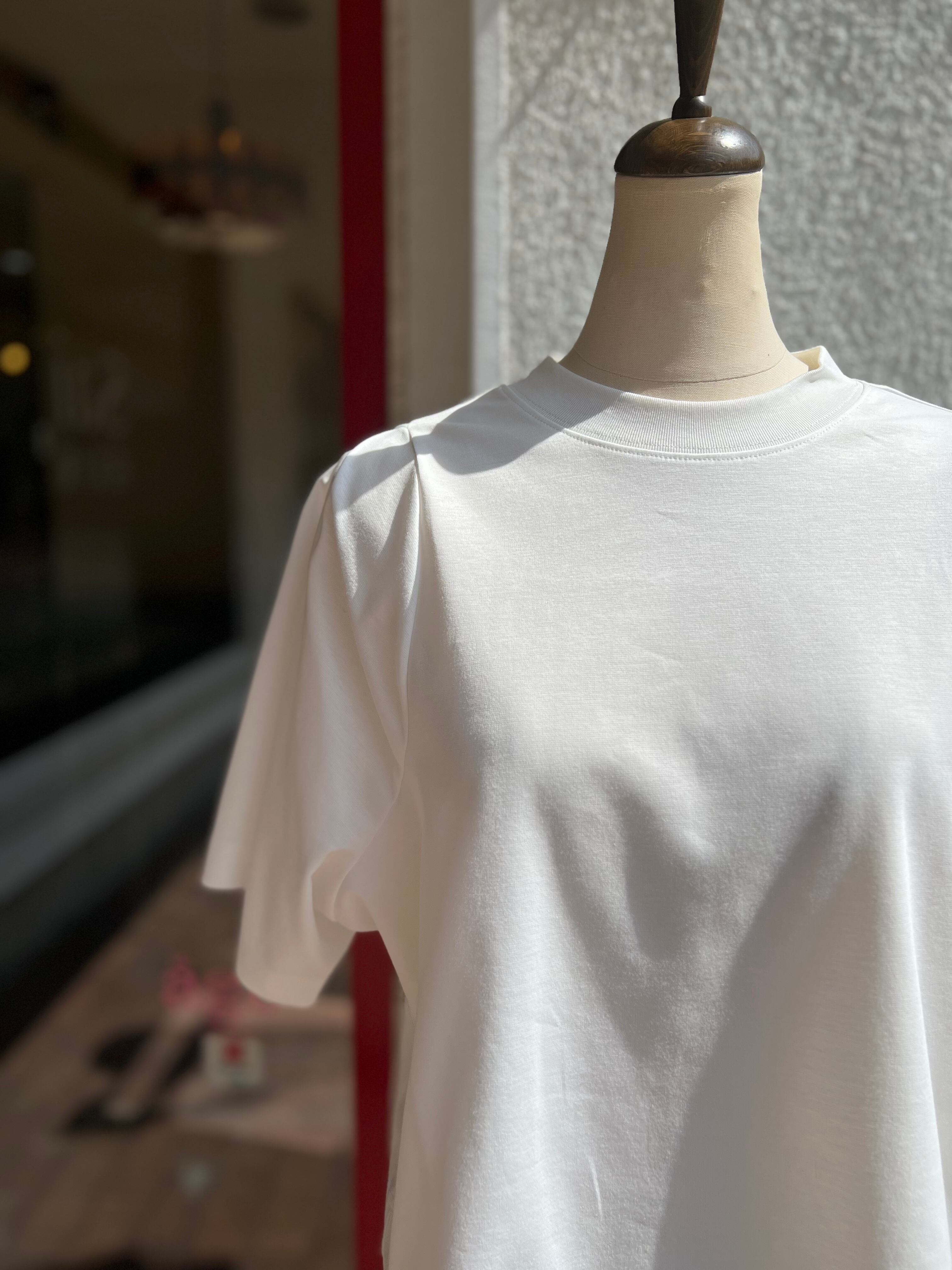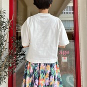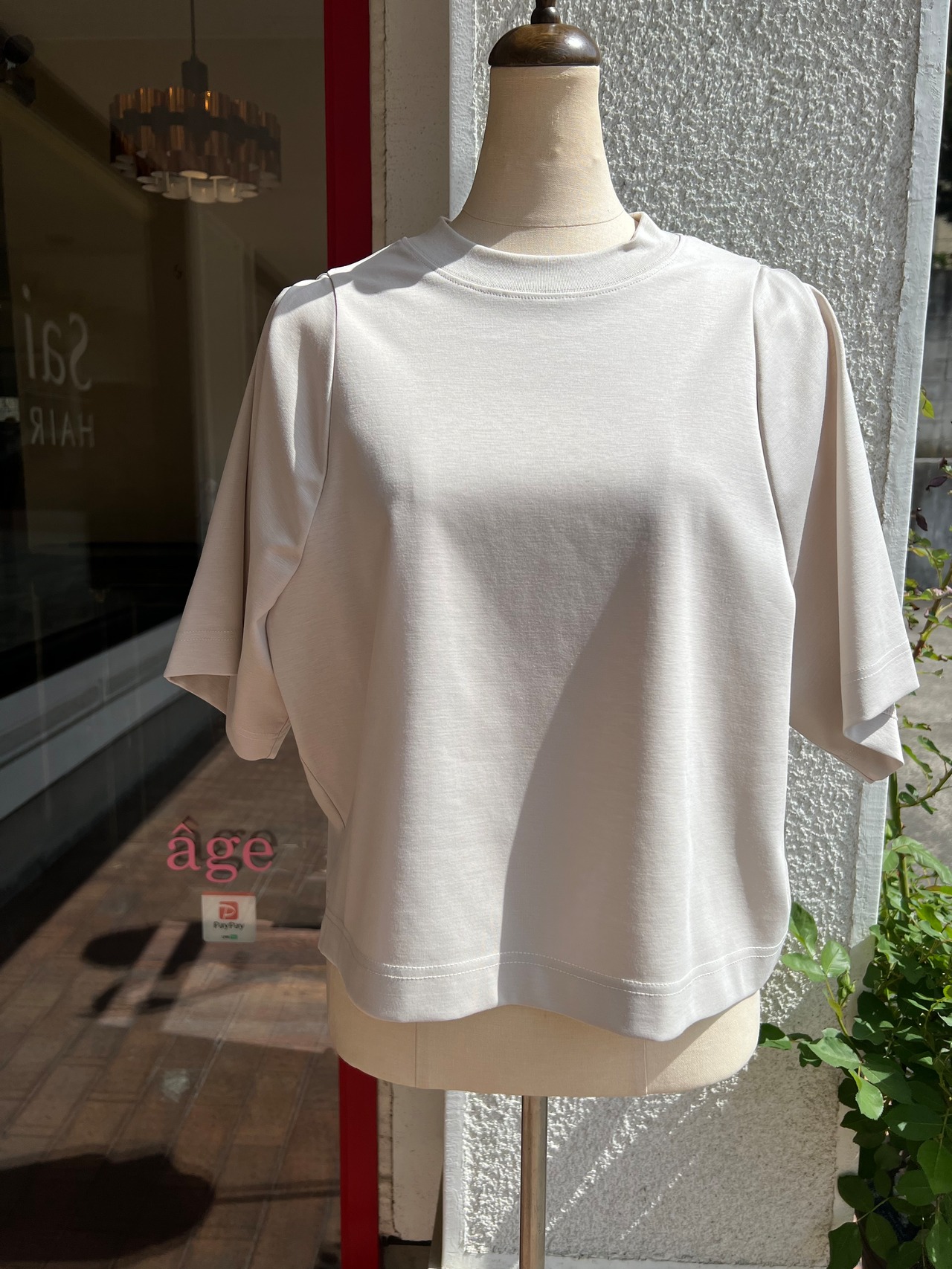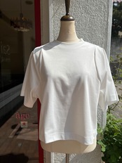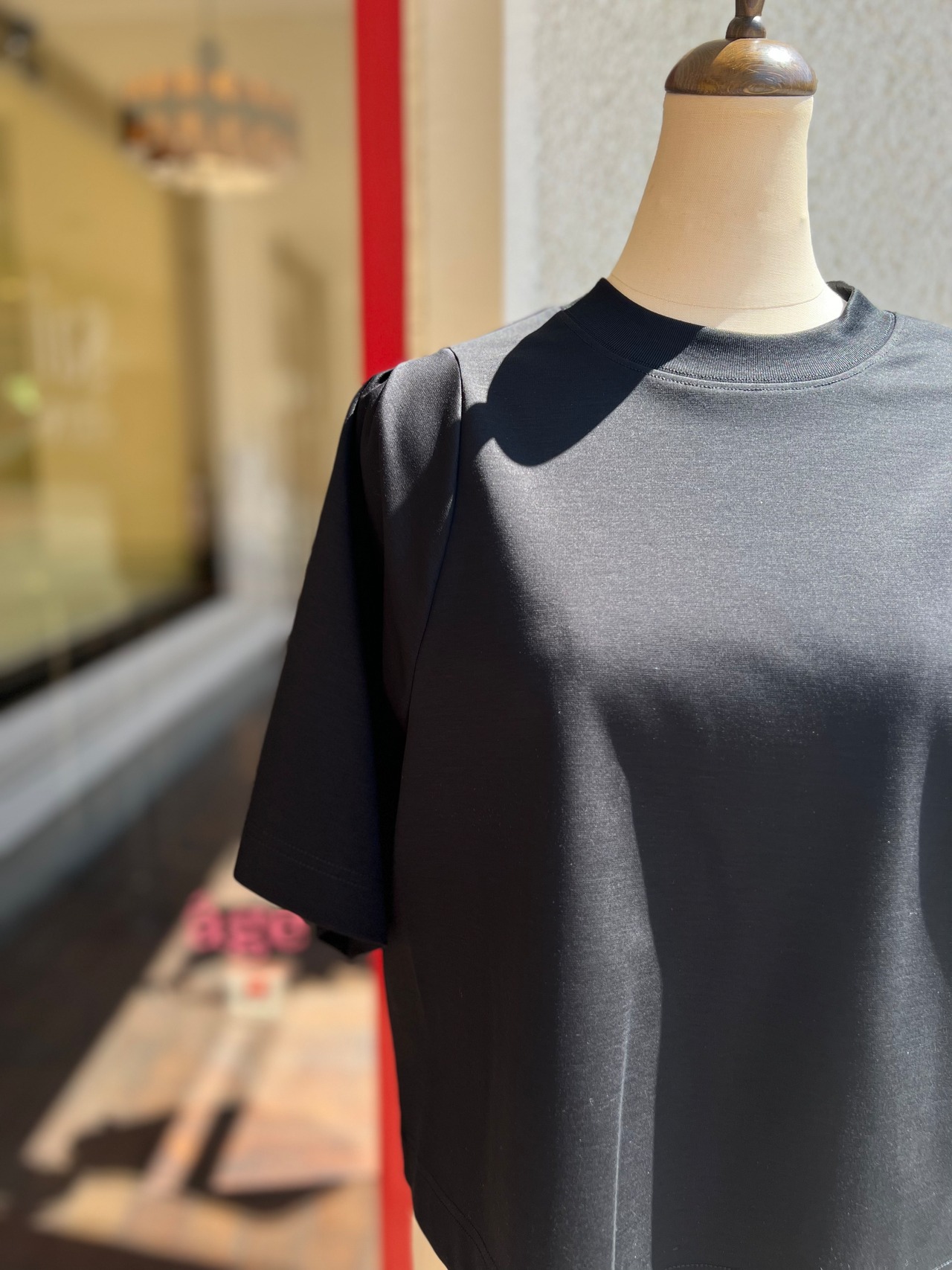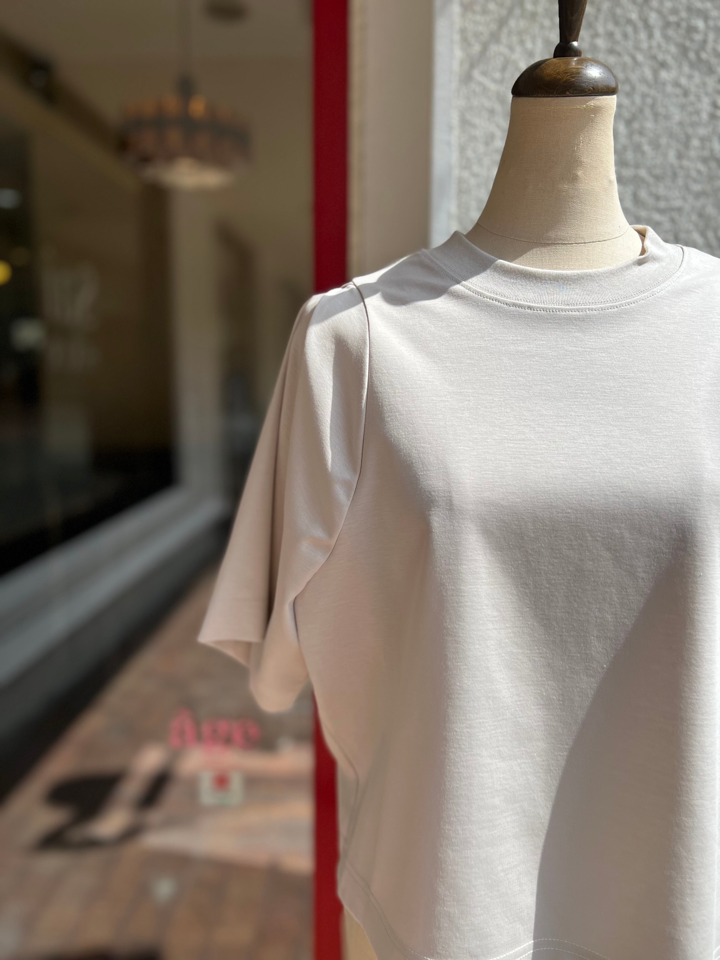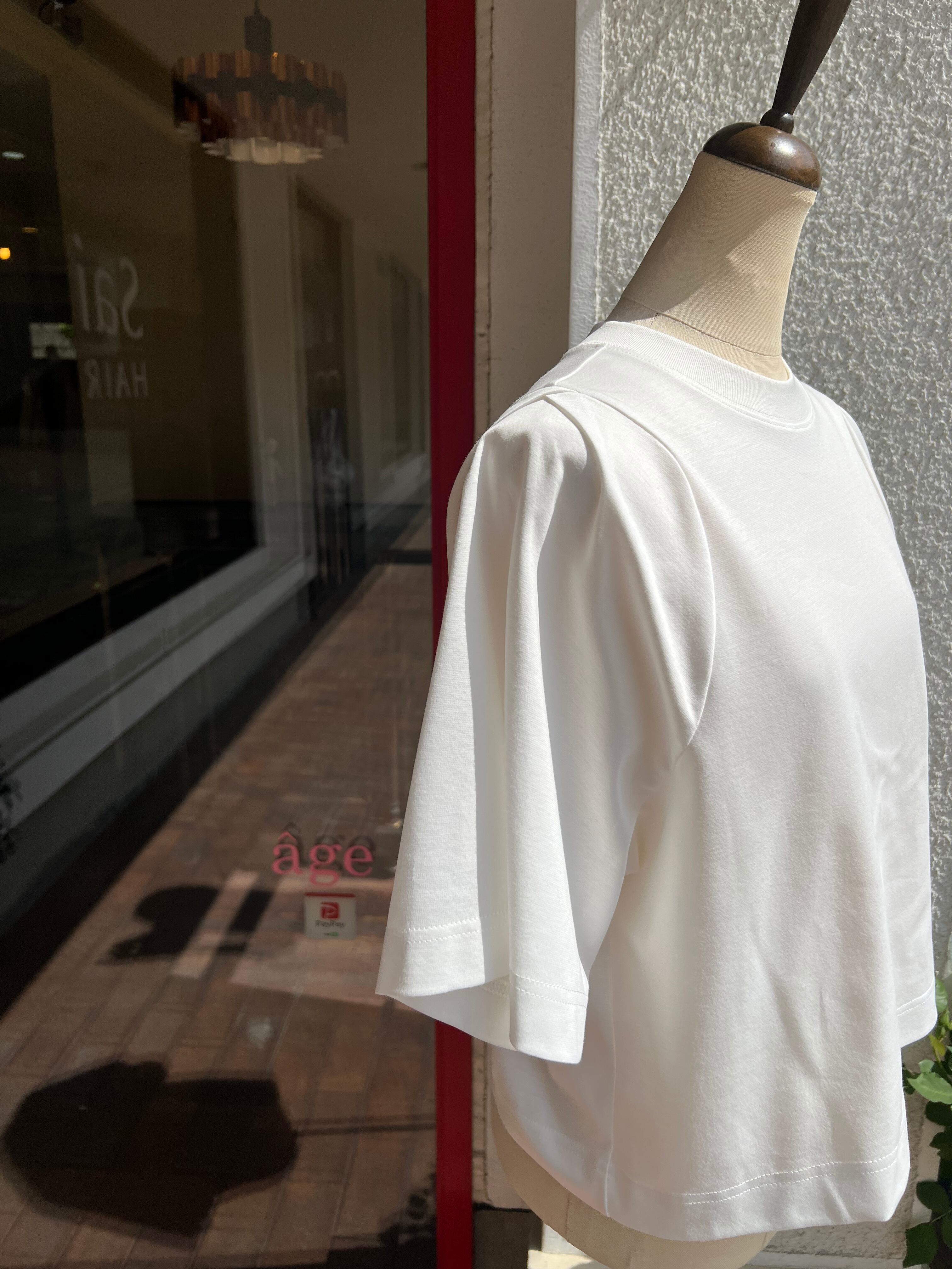 滑らかで程よい光沢のある、ボリュームボトムに合わせやすいクロップド丈Tシャツ