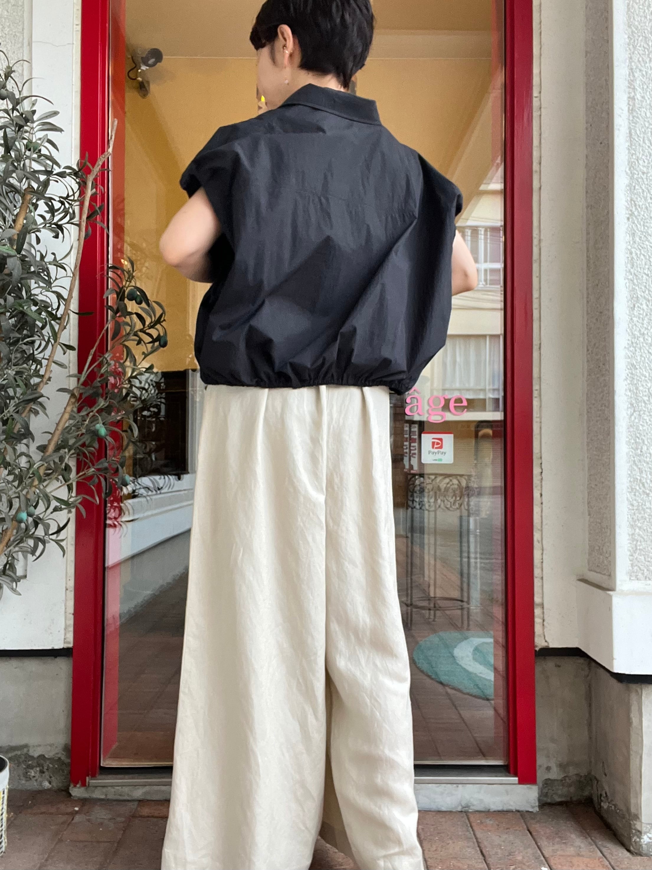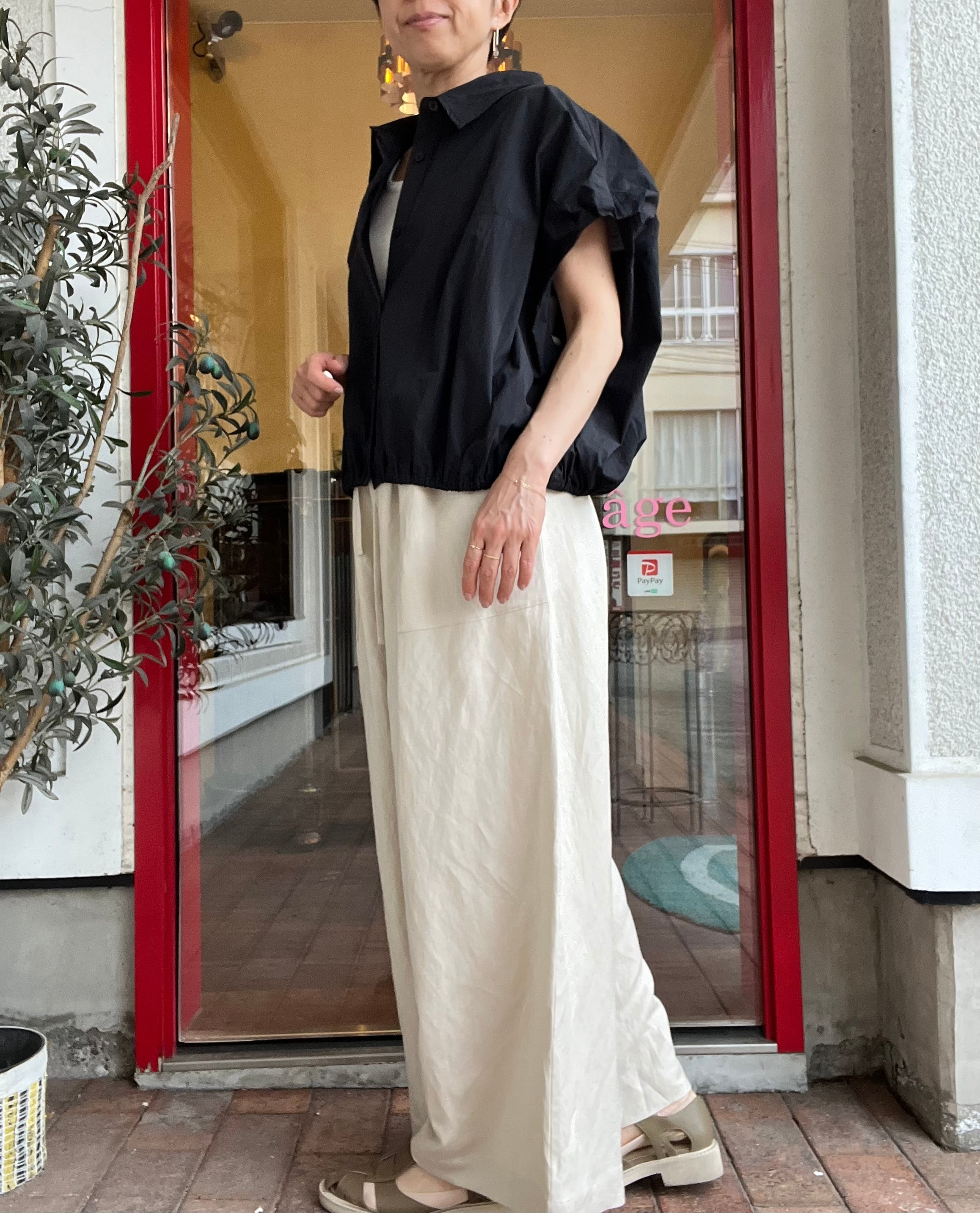 裾には緩くゴムが入り、今年らしい少し短い着丈なので、ワイドパンツやスカート等ボリュームのあるボトムとのコーディネートもおすすめです