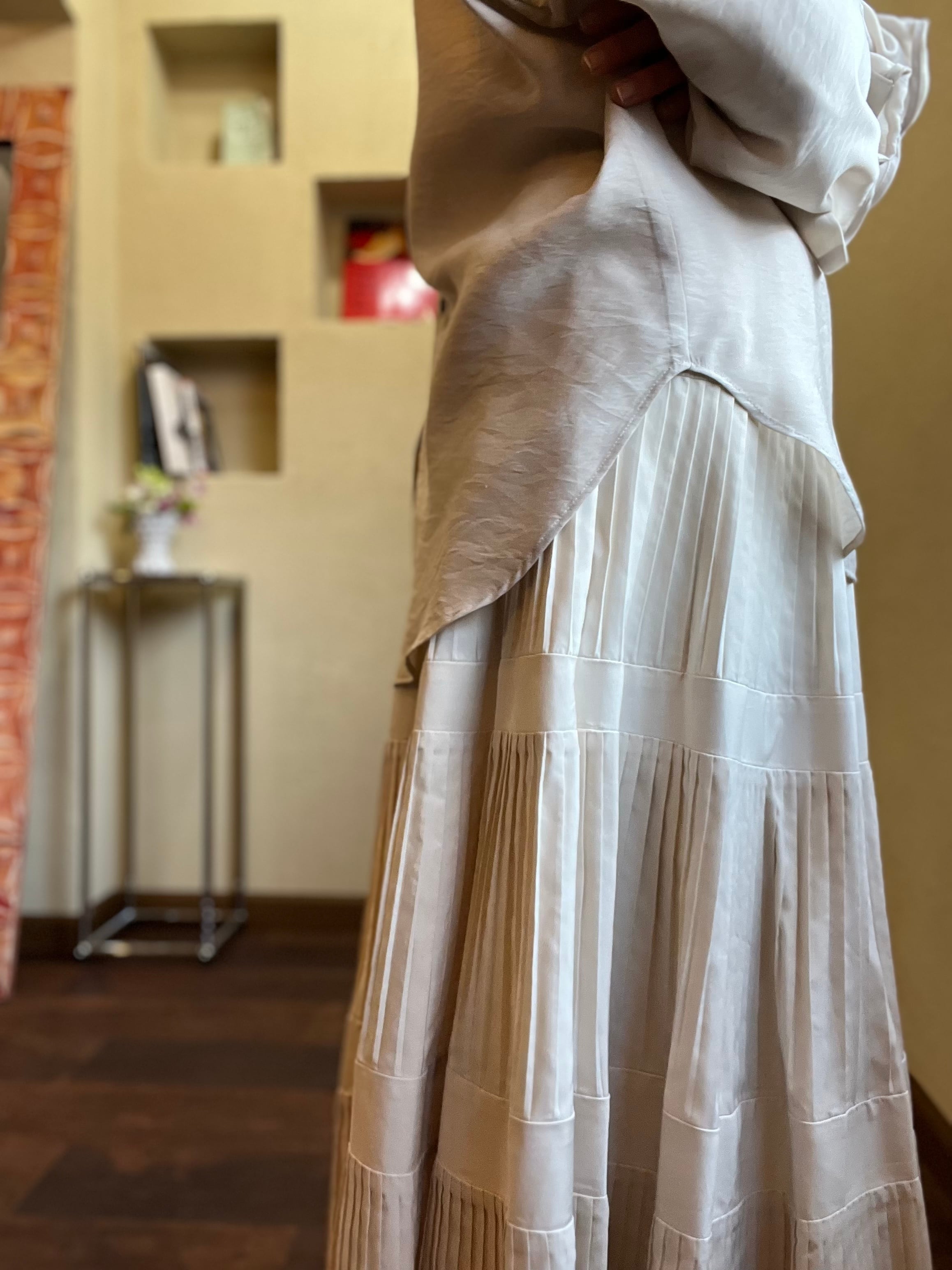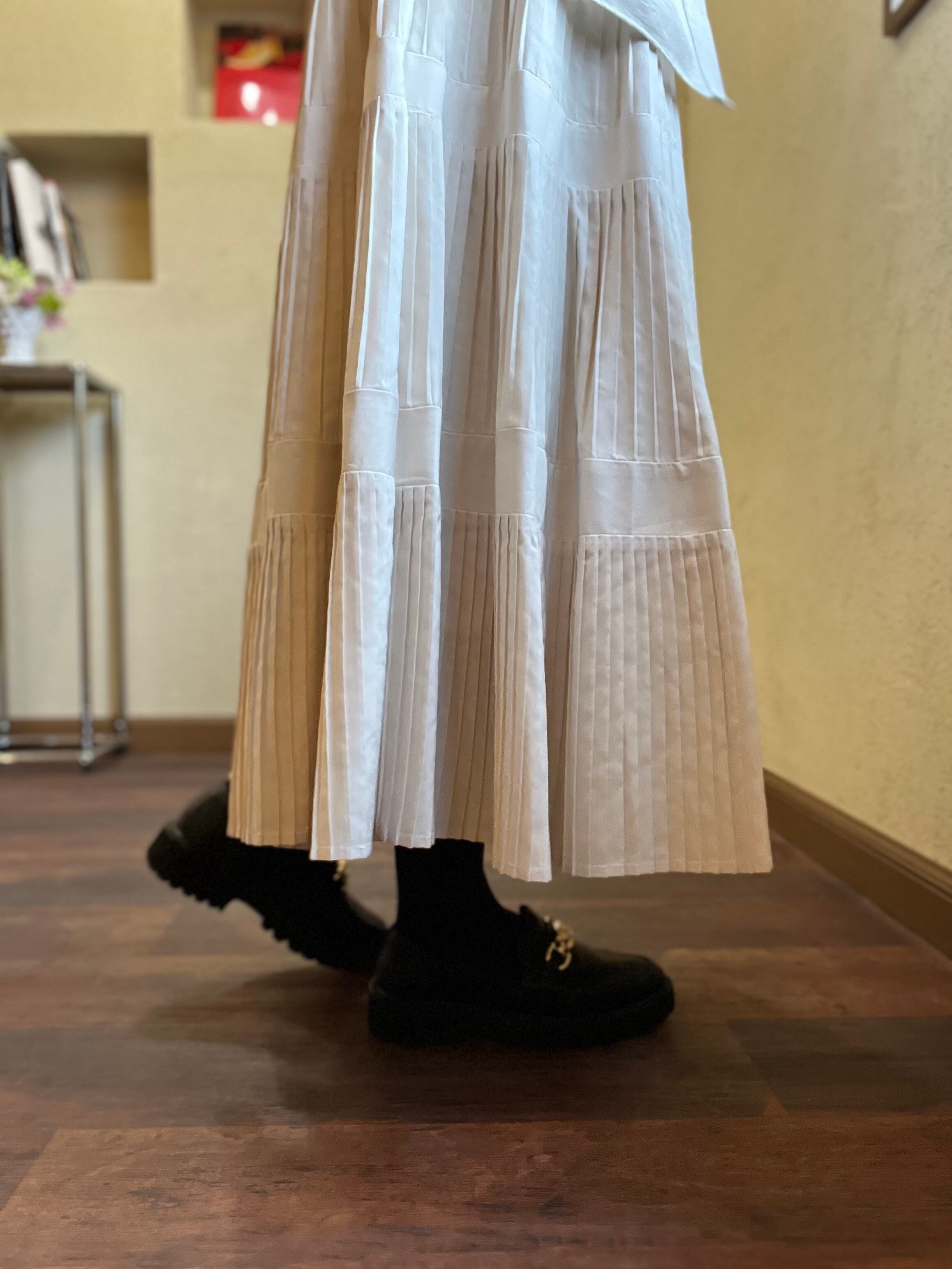 細かいプリーツが入りボリューム感も抑えられ、程よい丈の長さなので