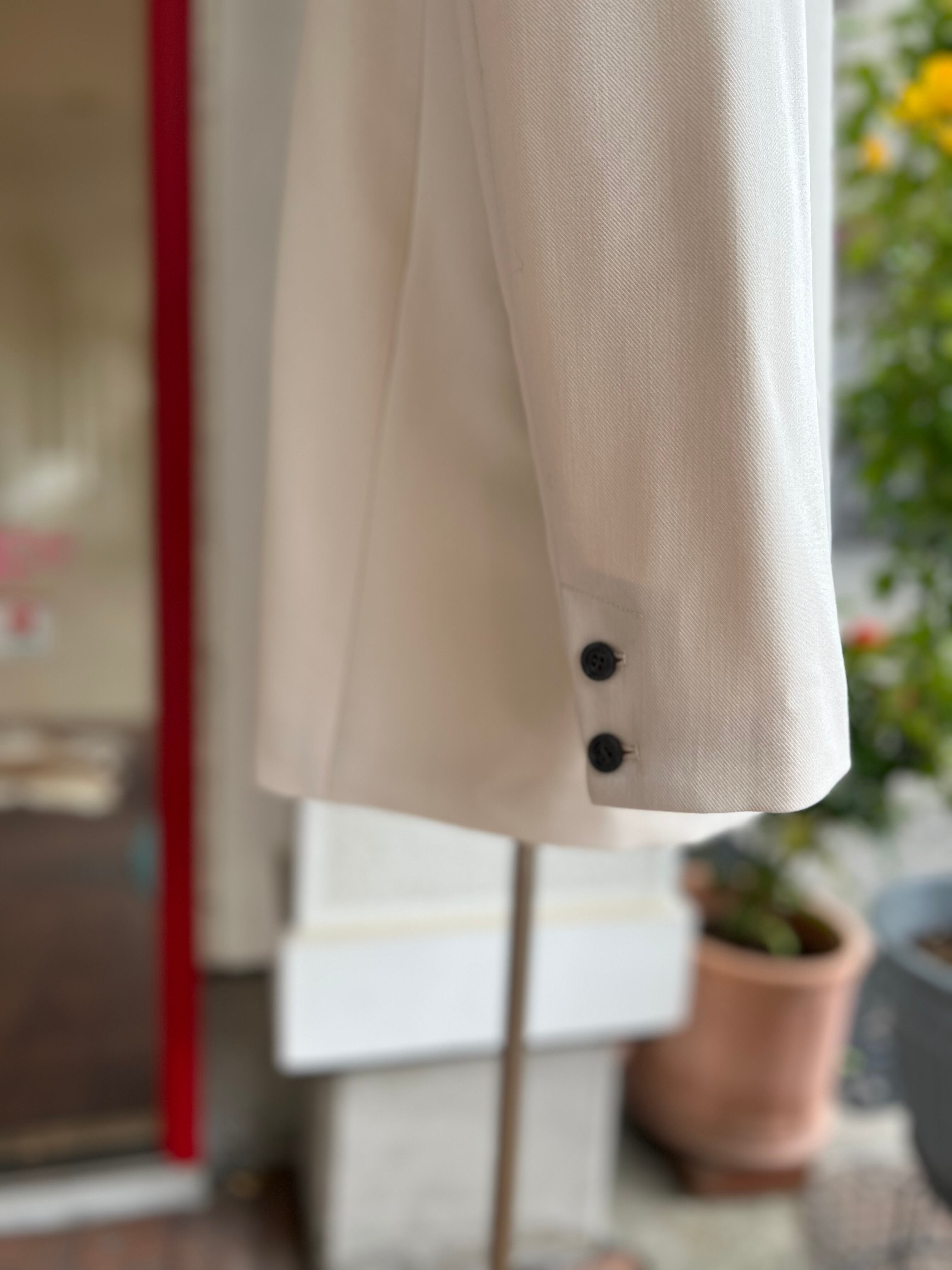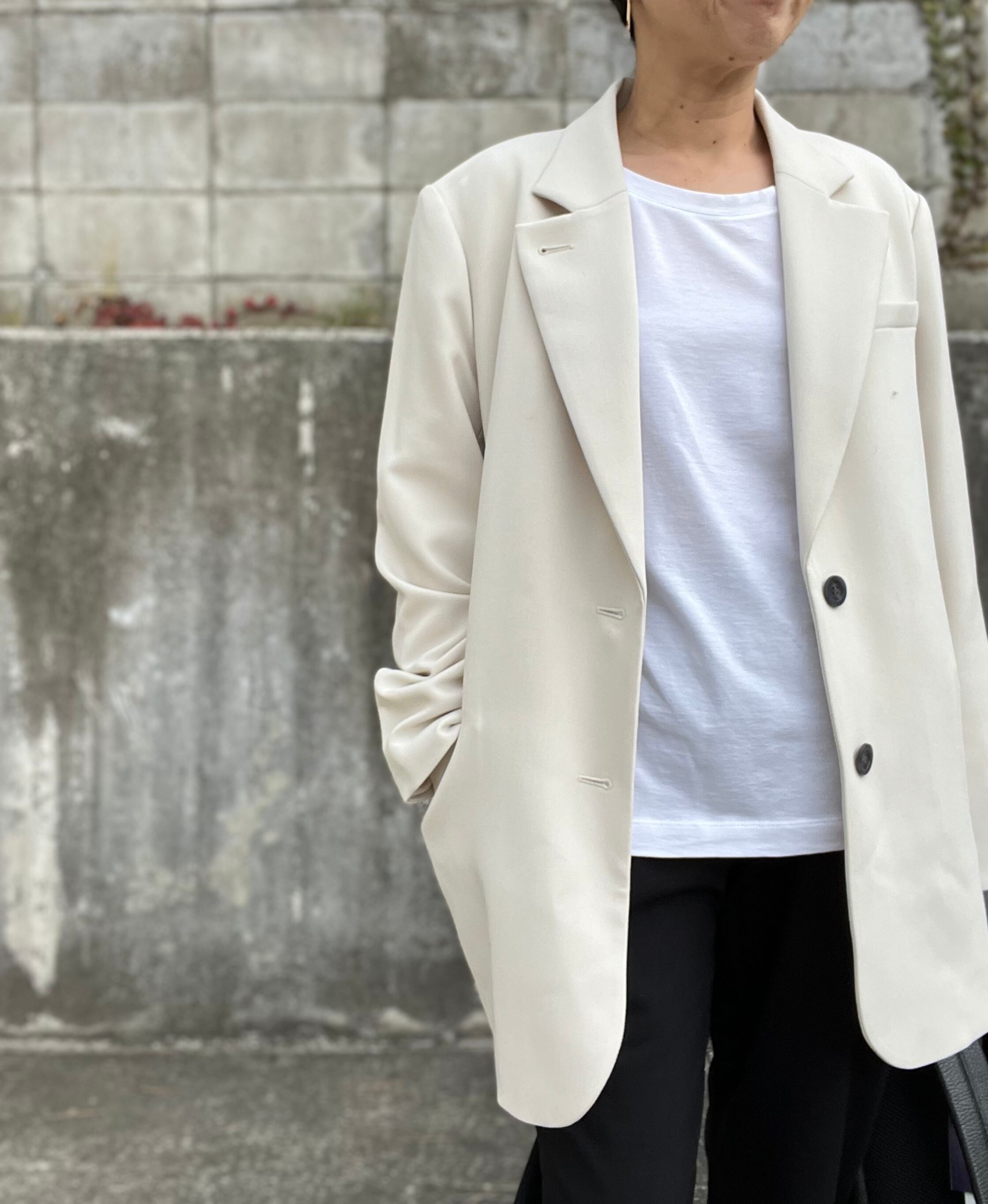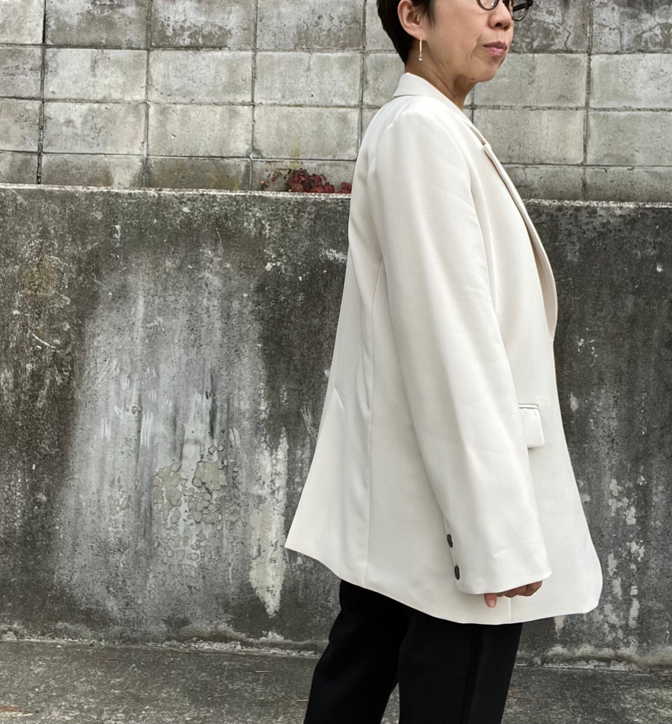 肩はやや広めで程よい緩さのあるシングルブレストのデザインは