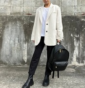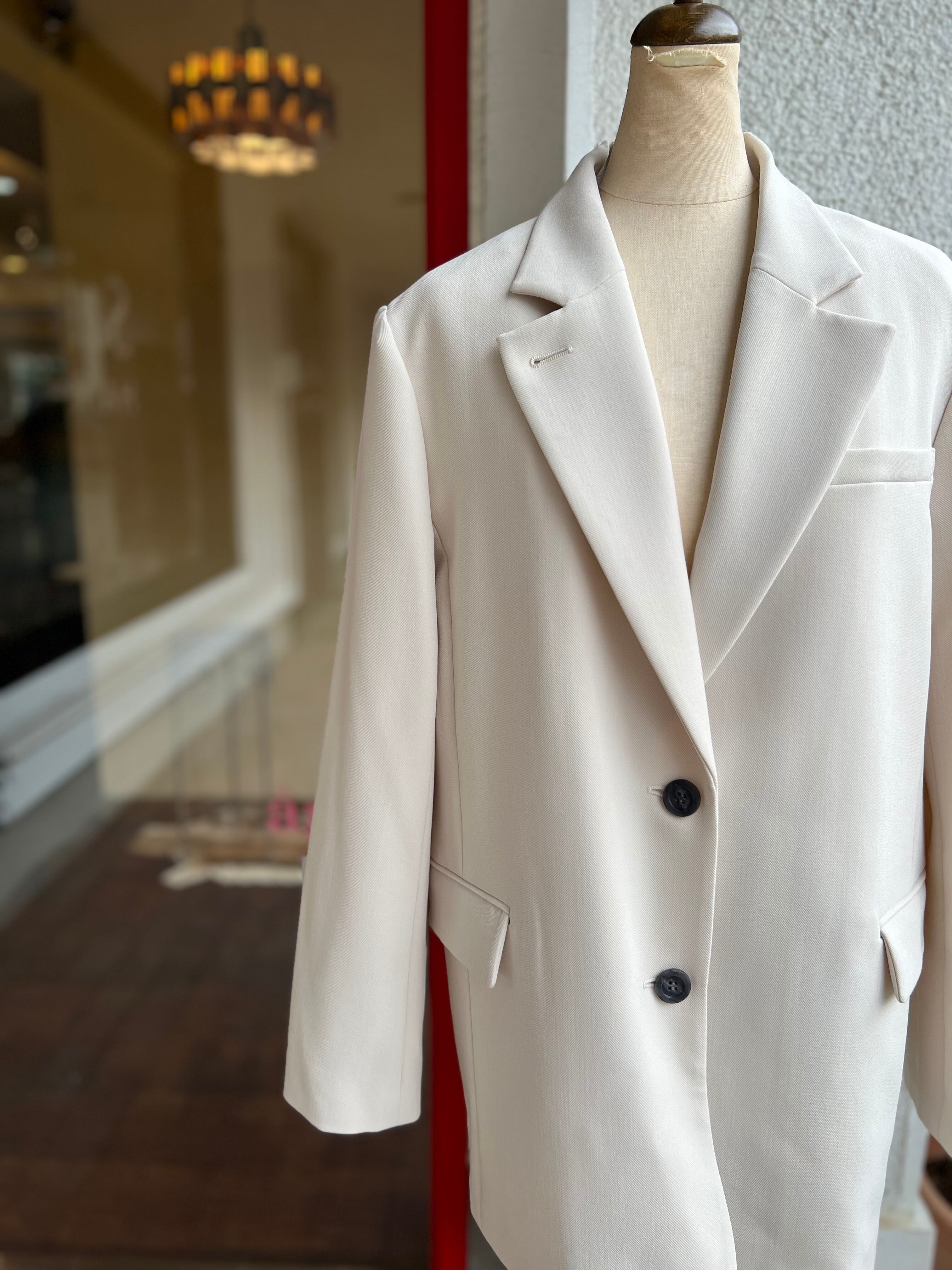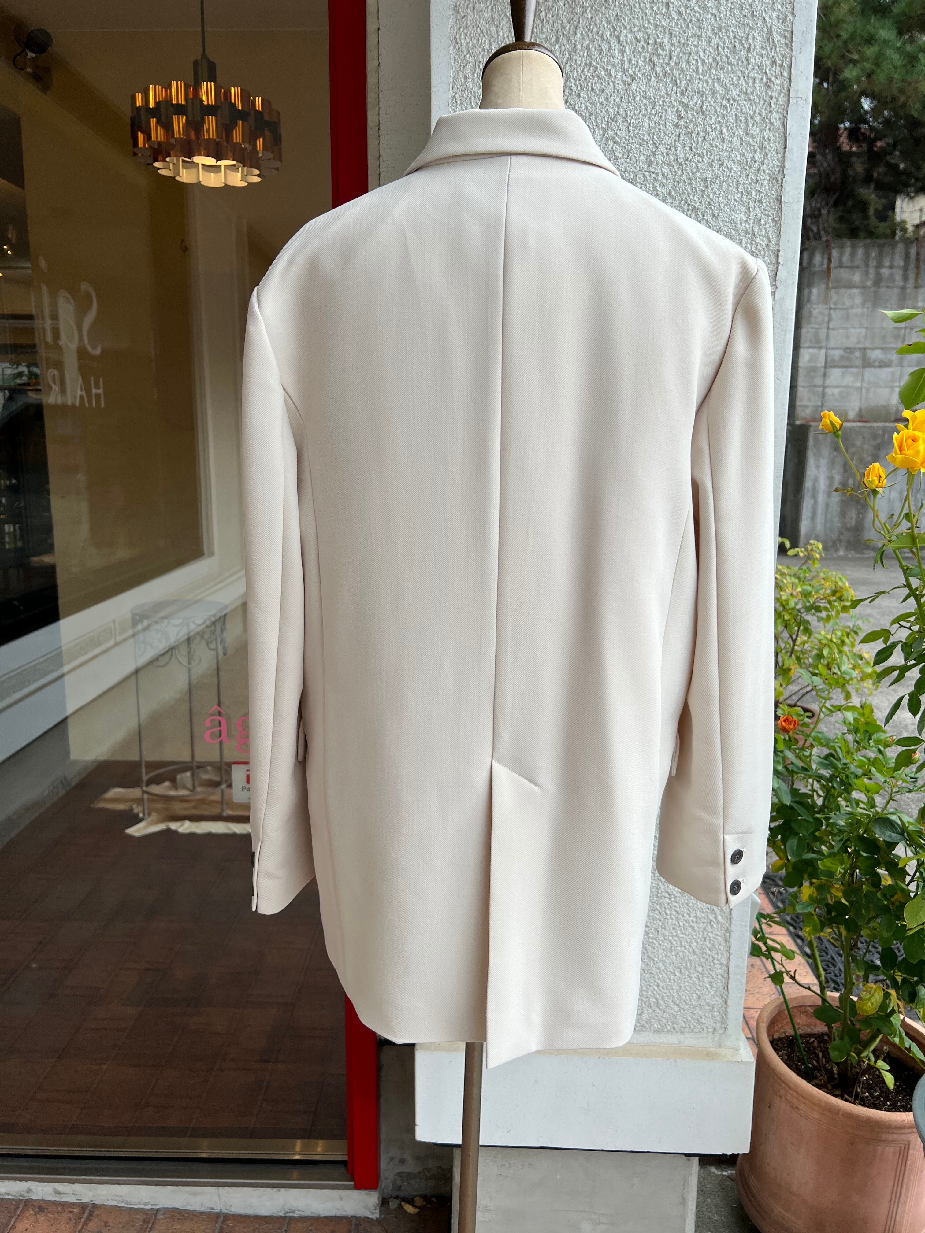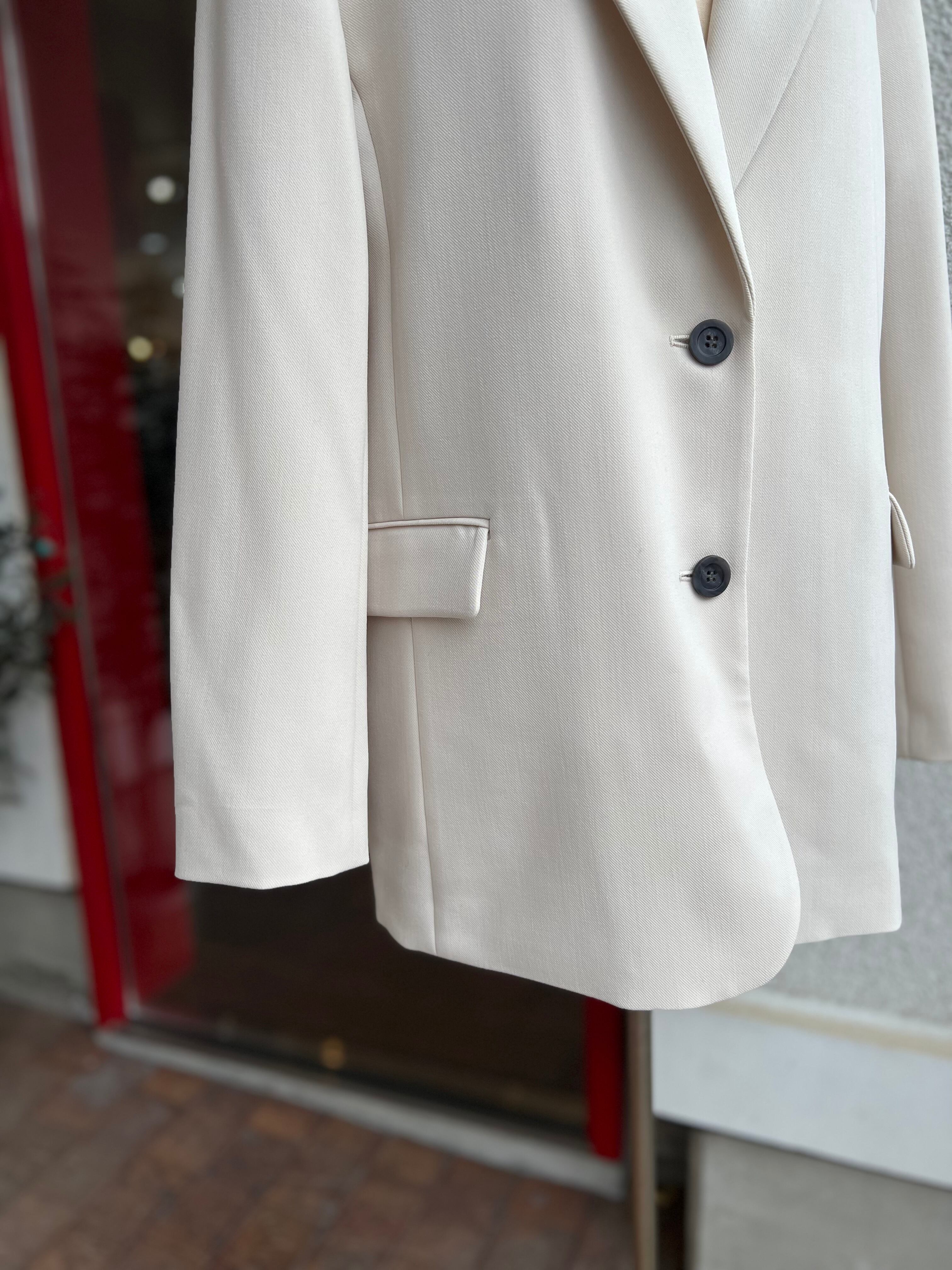 肩はやや広めで程よい緩さのあるシングルブレストのデザインは