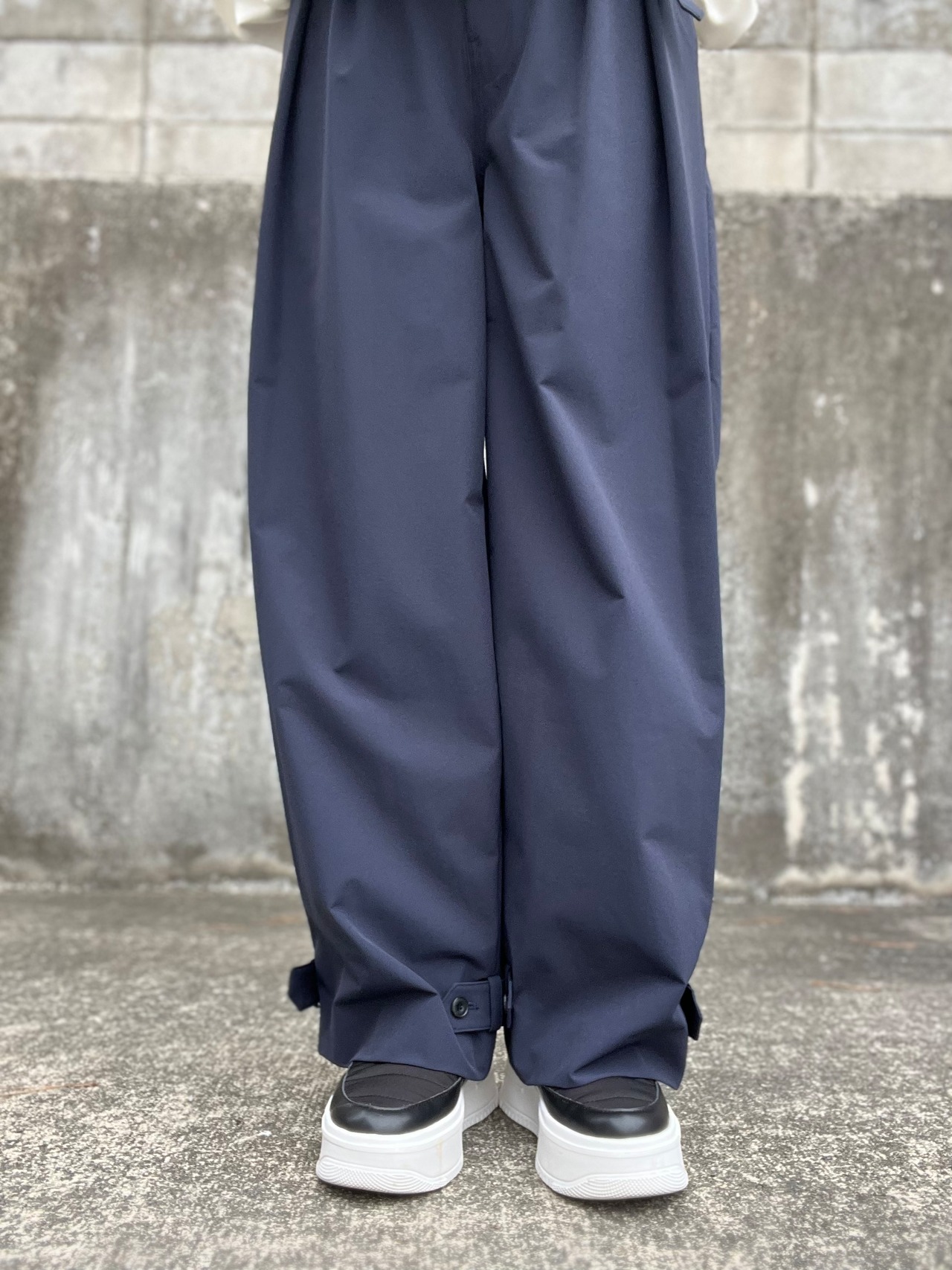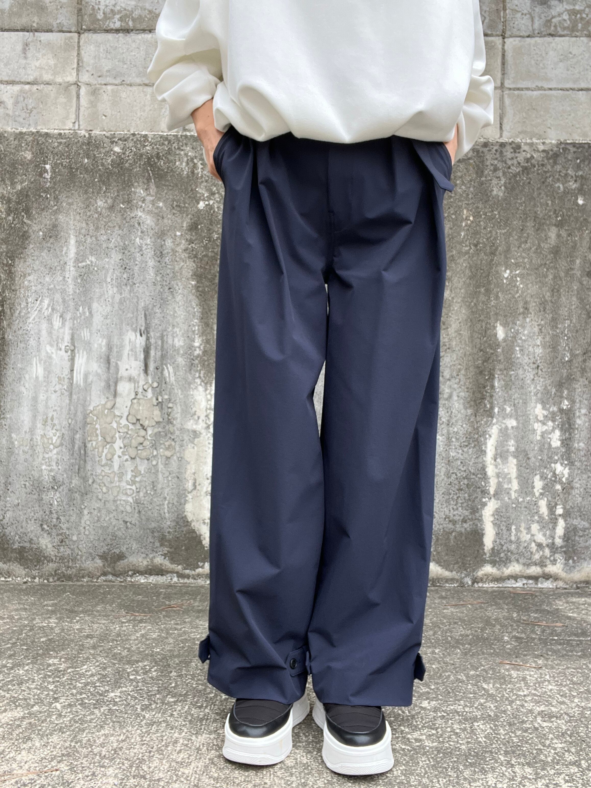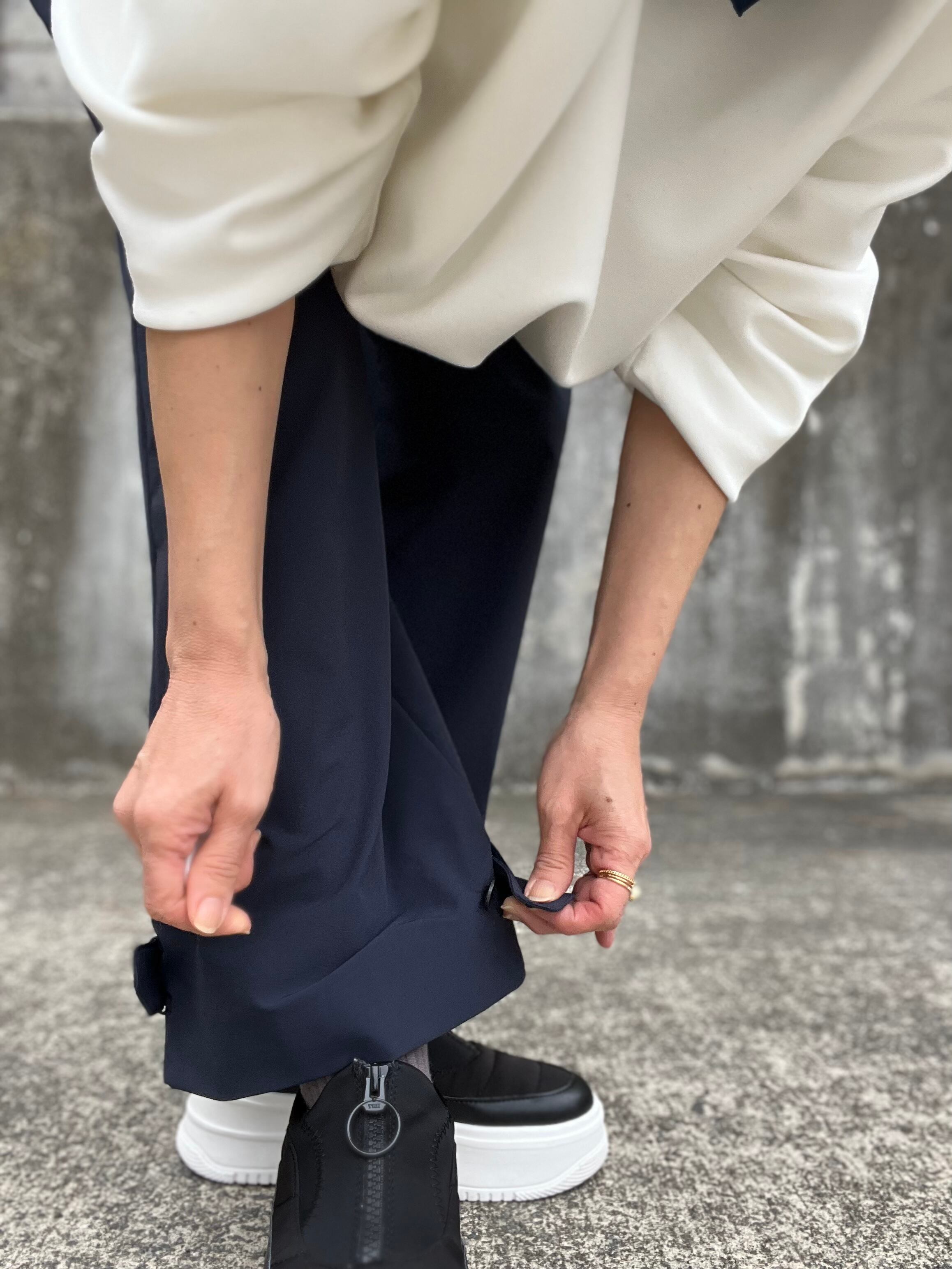 ミリタリー要素を加味した裾のストラップを追加し、ボタンの一つで裾のアレンジが可能です