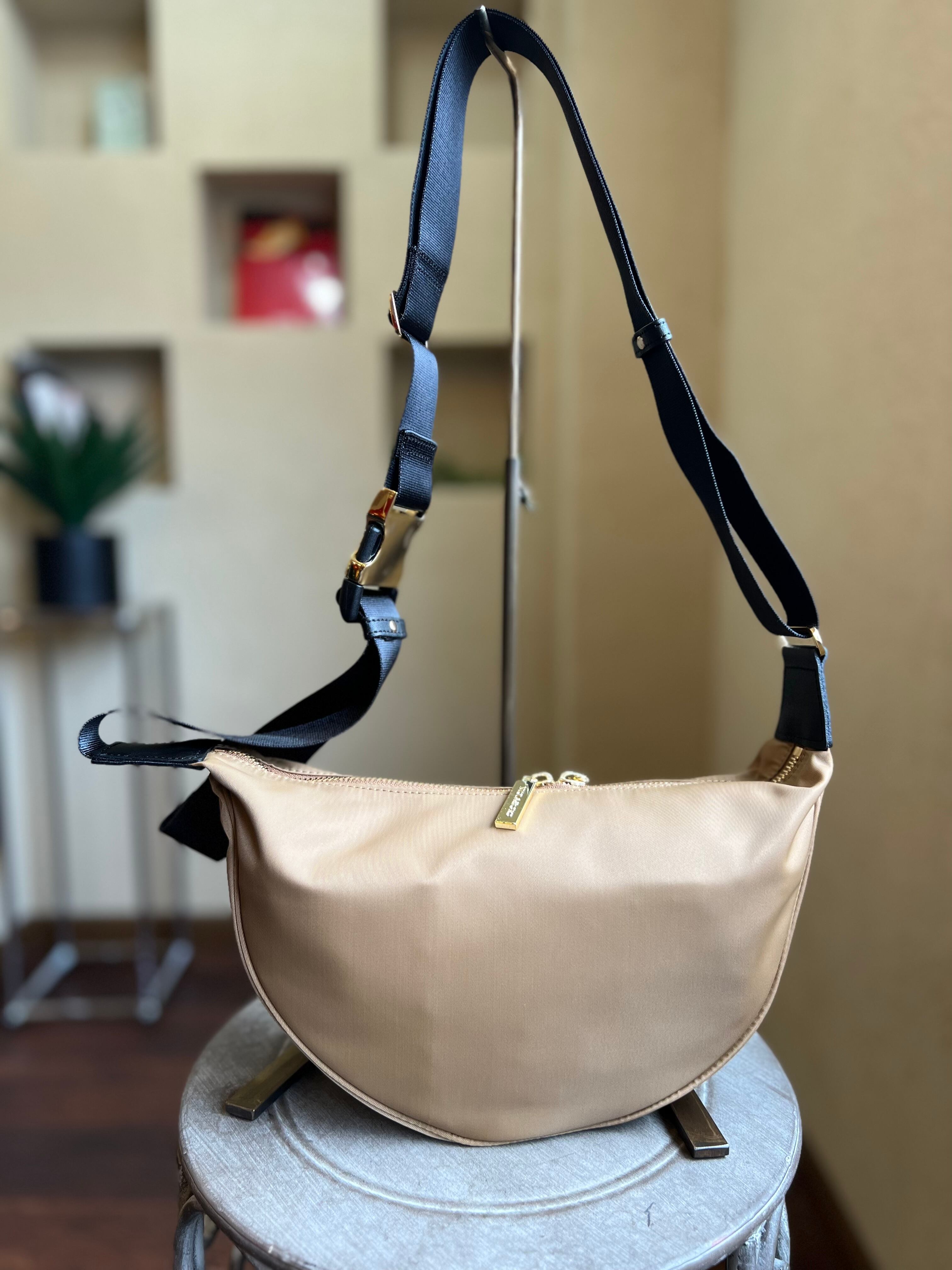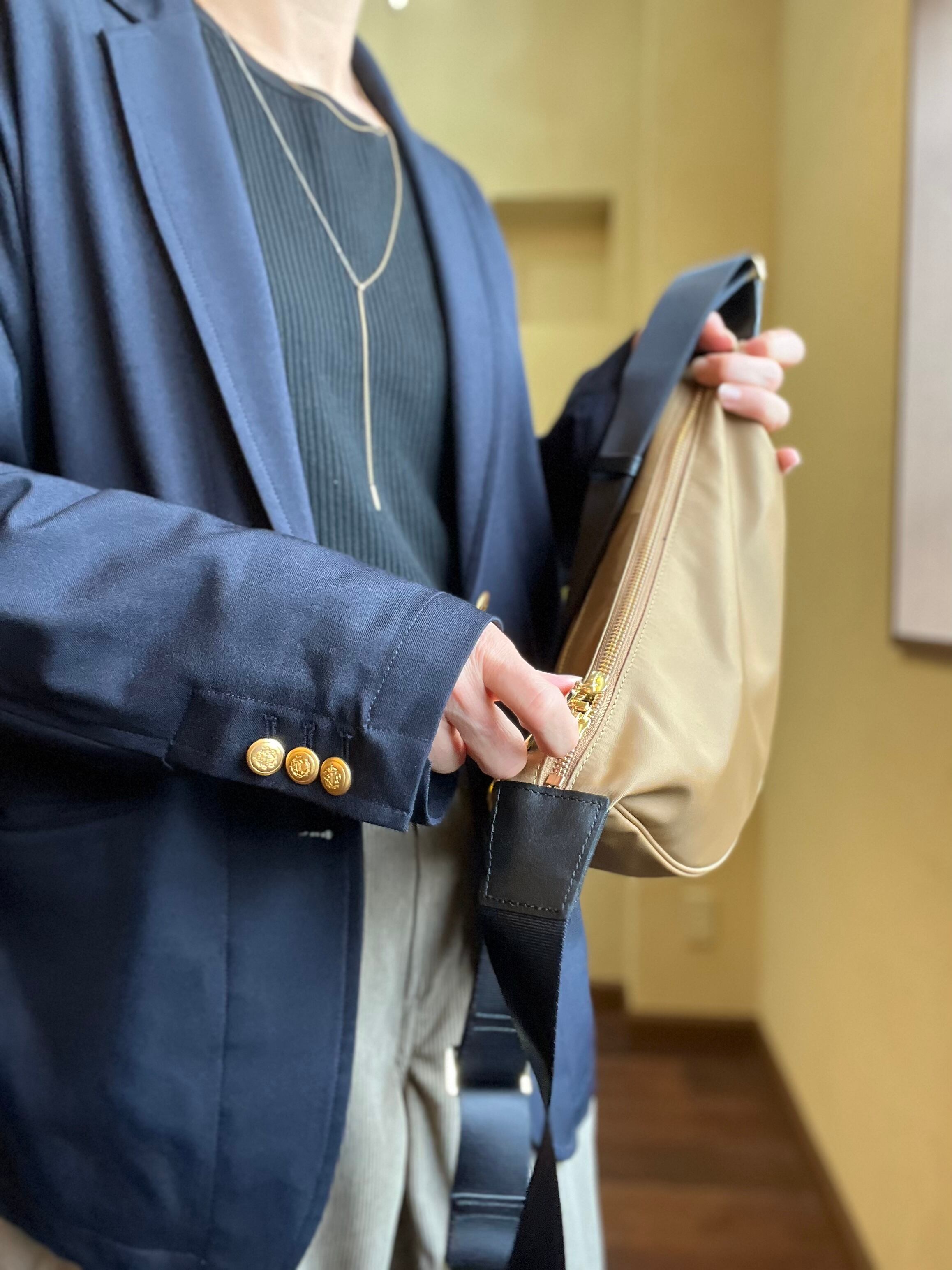 弱撥水性のあるカジュアルなナイロン素材に金具のゴールド使いが女性らしいボディバッグ