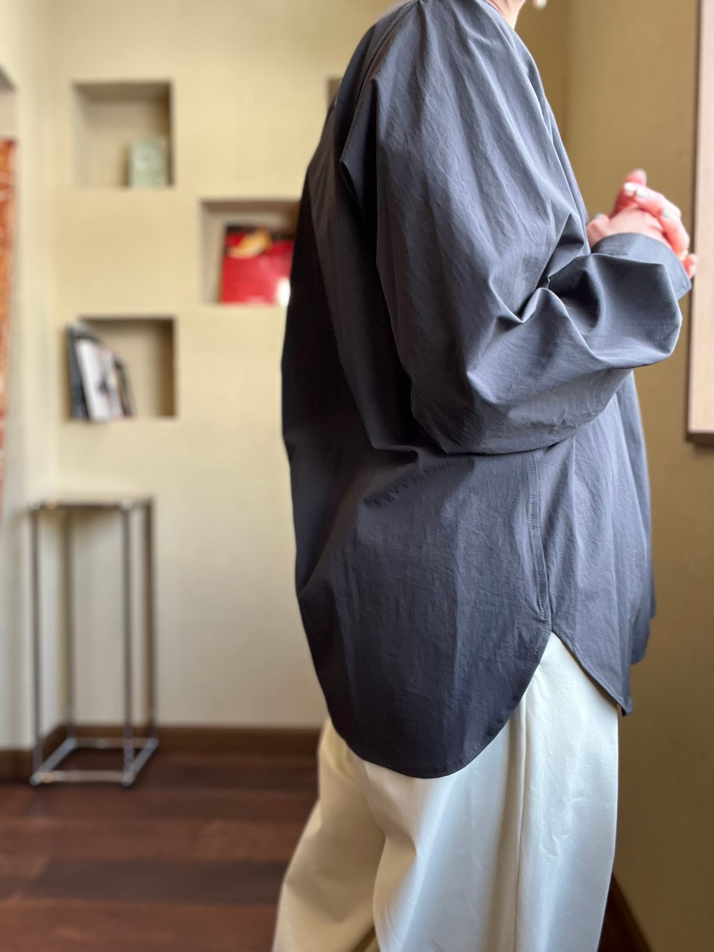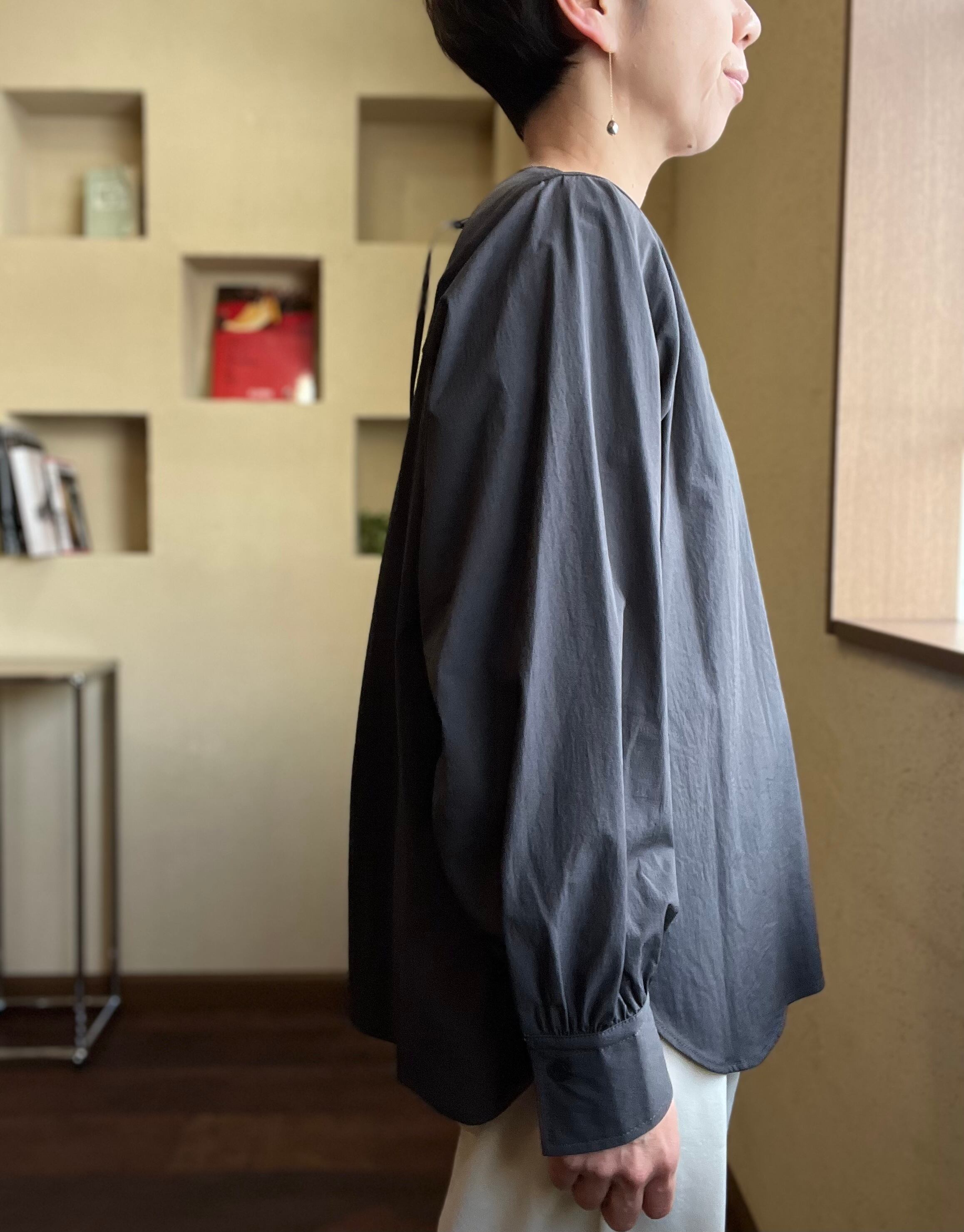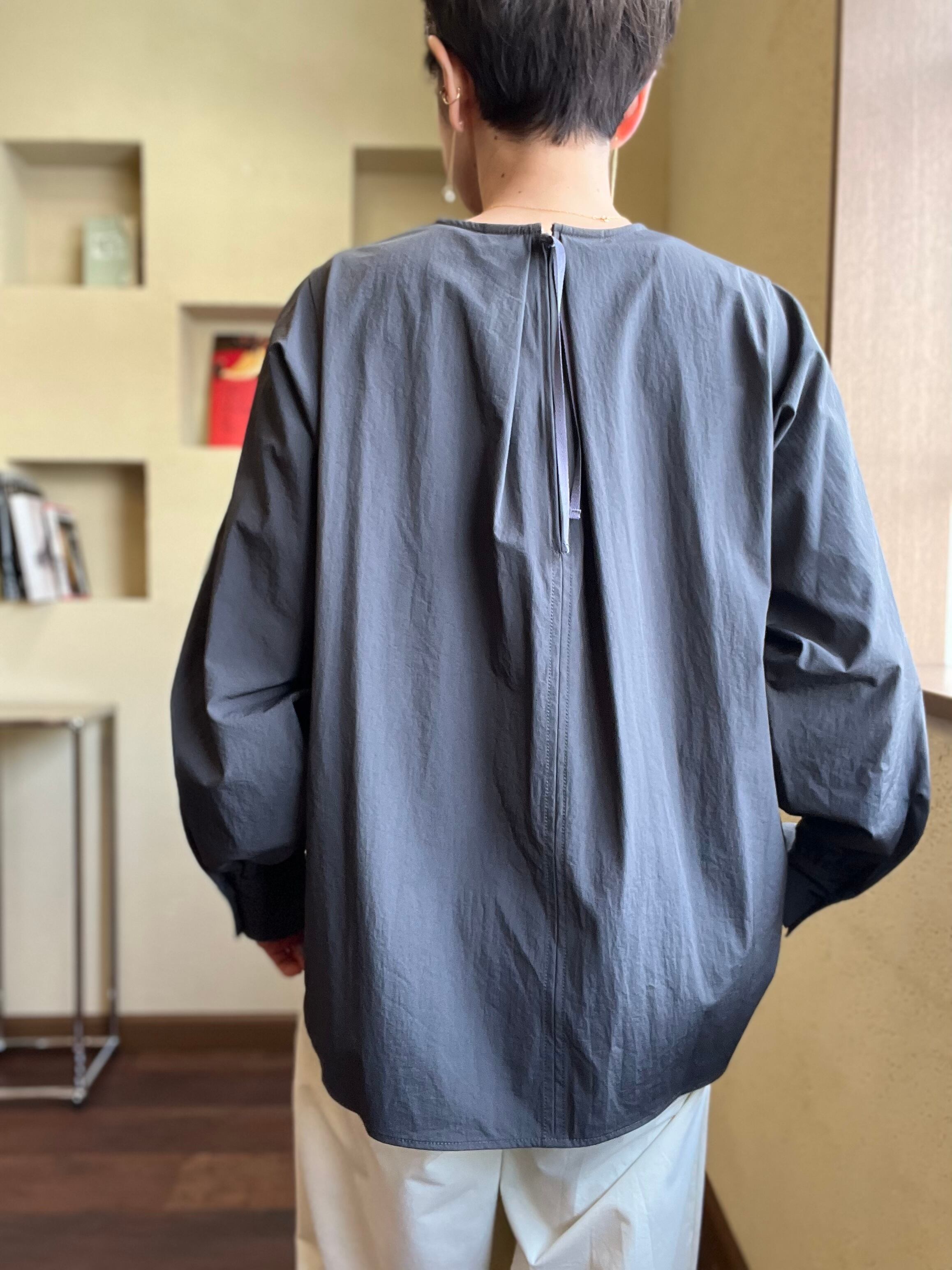メイクしたままでも着脱しやすいファスナーとリラックス感と動きやすさを助長する背中のビックタックできちんと感も両立したブラウスです