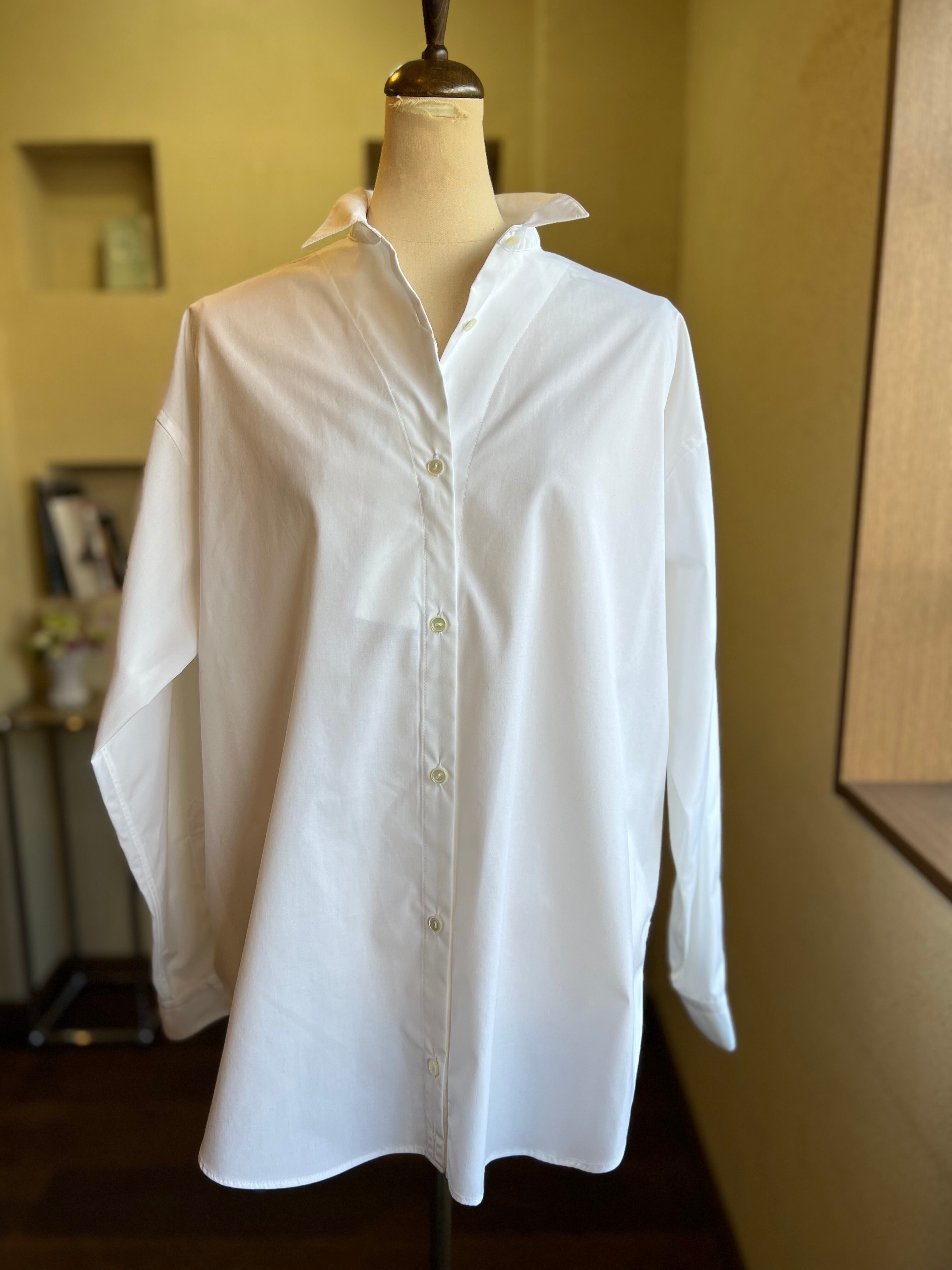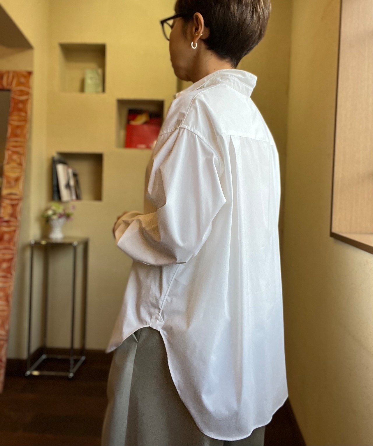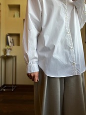 lelillお馴染みの胸の隠し釦、着心地に寄与する背中の割ヨーク、ボタンを開けた際の綺麗な見え面と型崩れを防止するステッチアウトしている前立ての大見返しなど