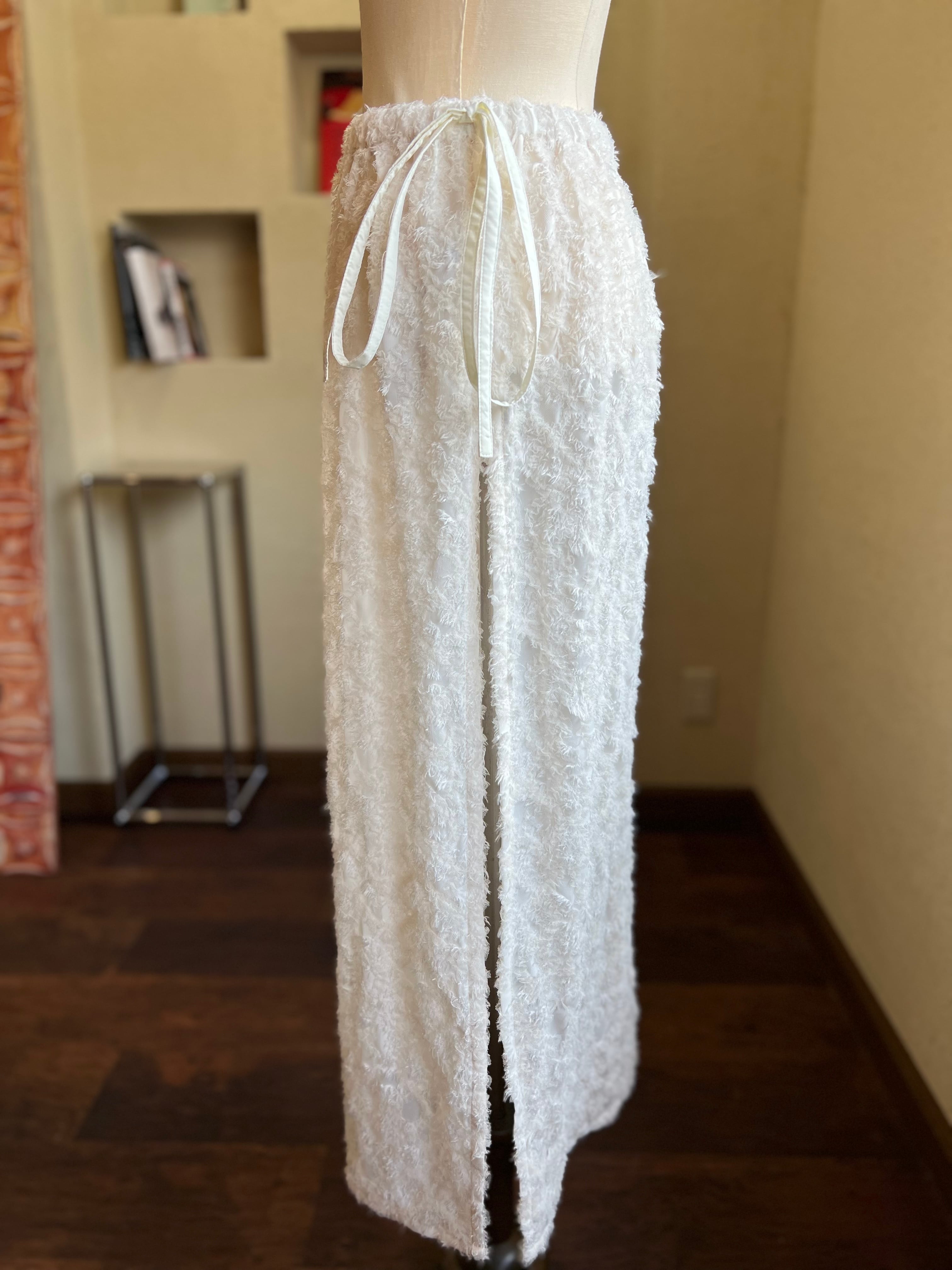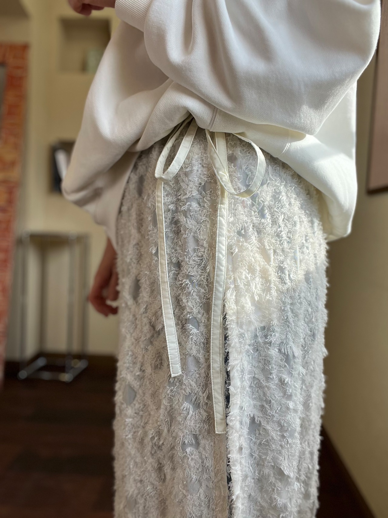 レースとカットフリンジが施されたシアー感のある生地を使用し